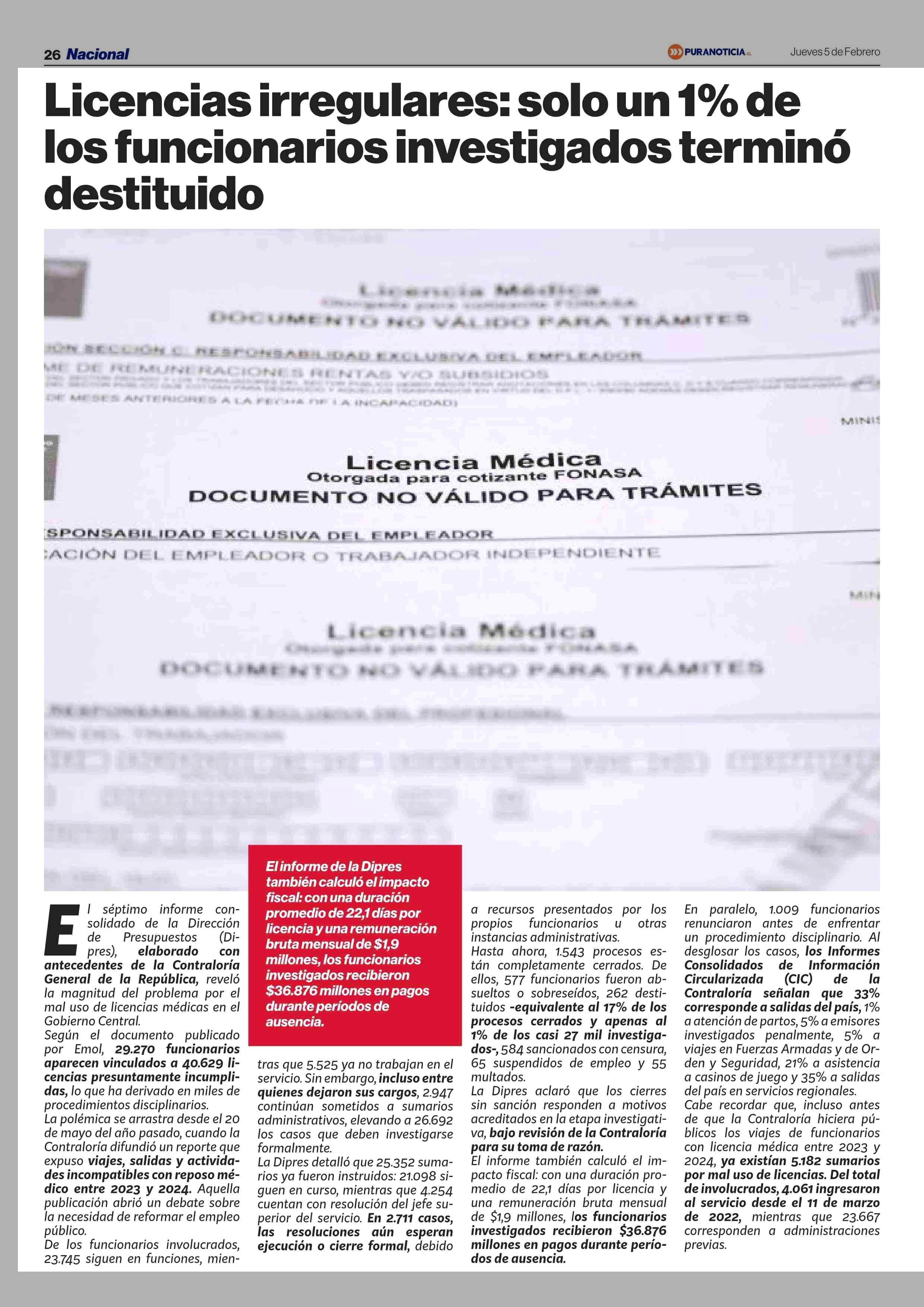 Licencias irregulares: solo un 1% de los funcionarios investigados termino destituido 05-02-2026 Puranoticia.cl |