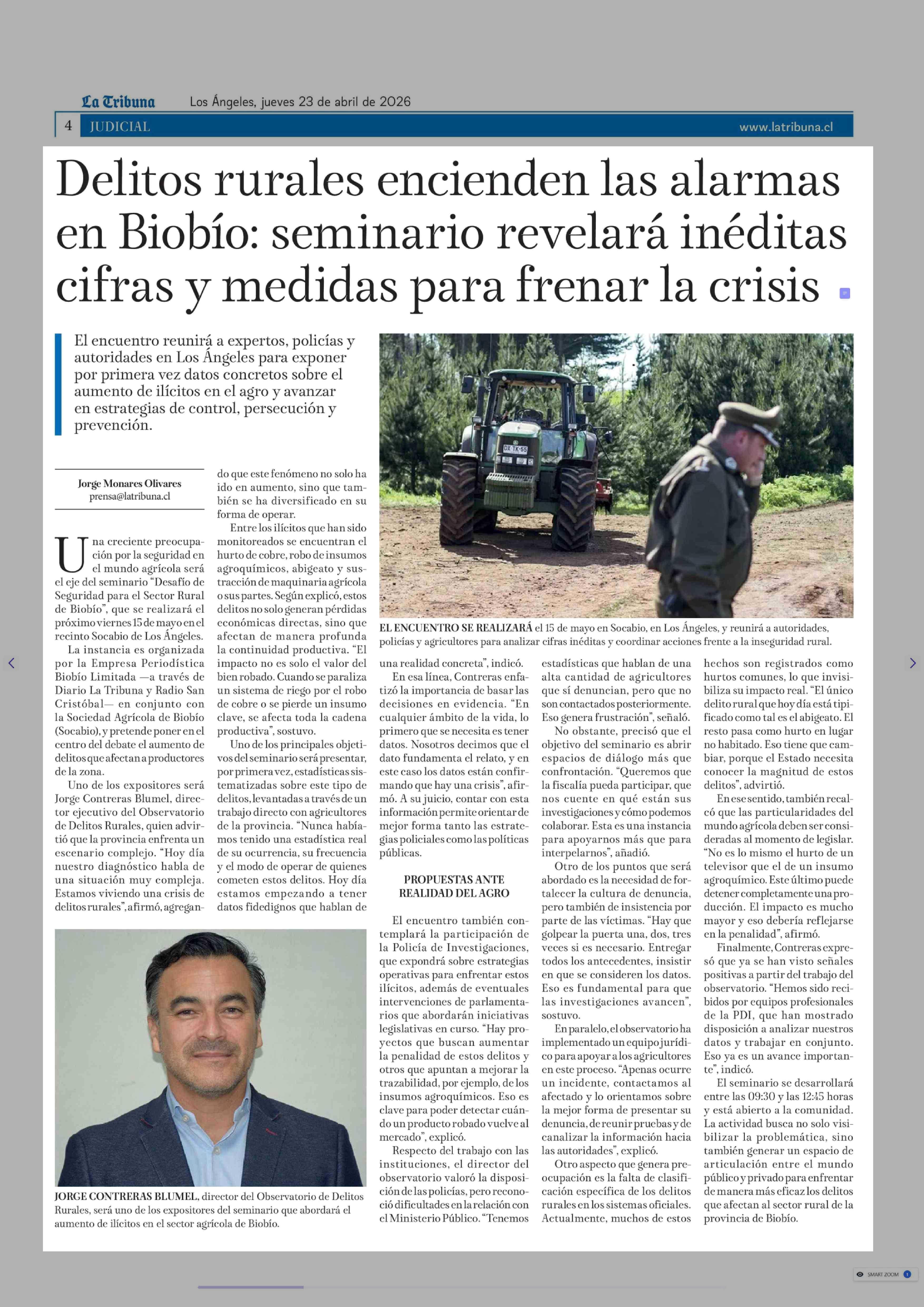 Delitos rurales encienden las alarmas en Biobío: seminario revelará inéditas cifras y medidas para frenar la crisis 23-04-2026 La Tribuna |