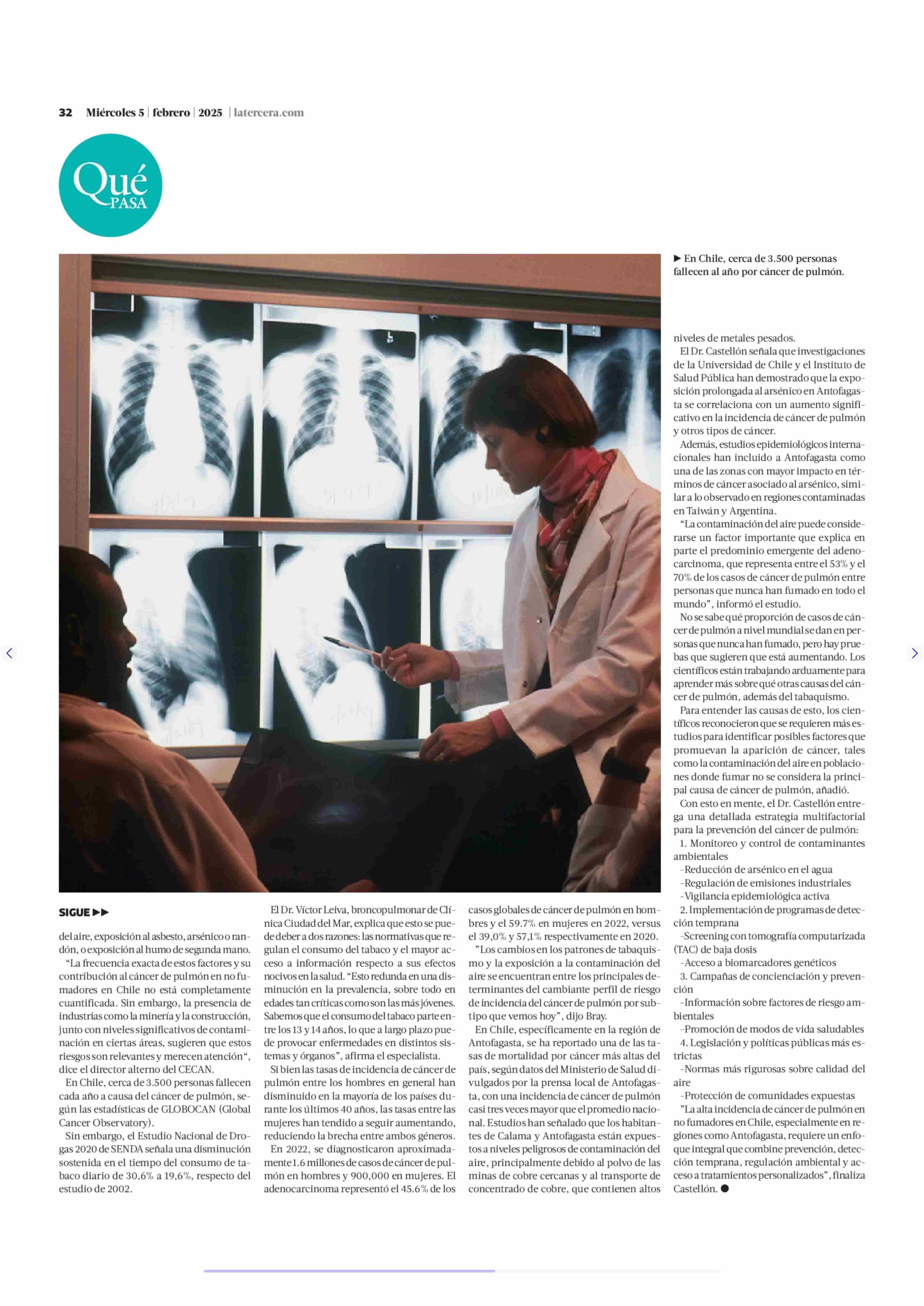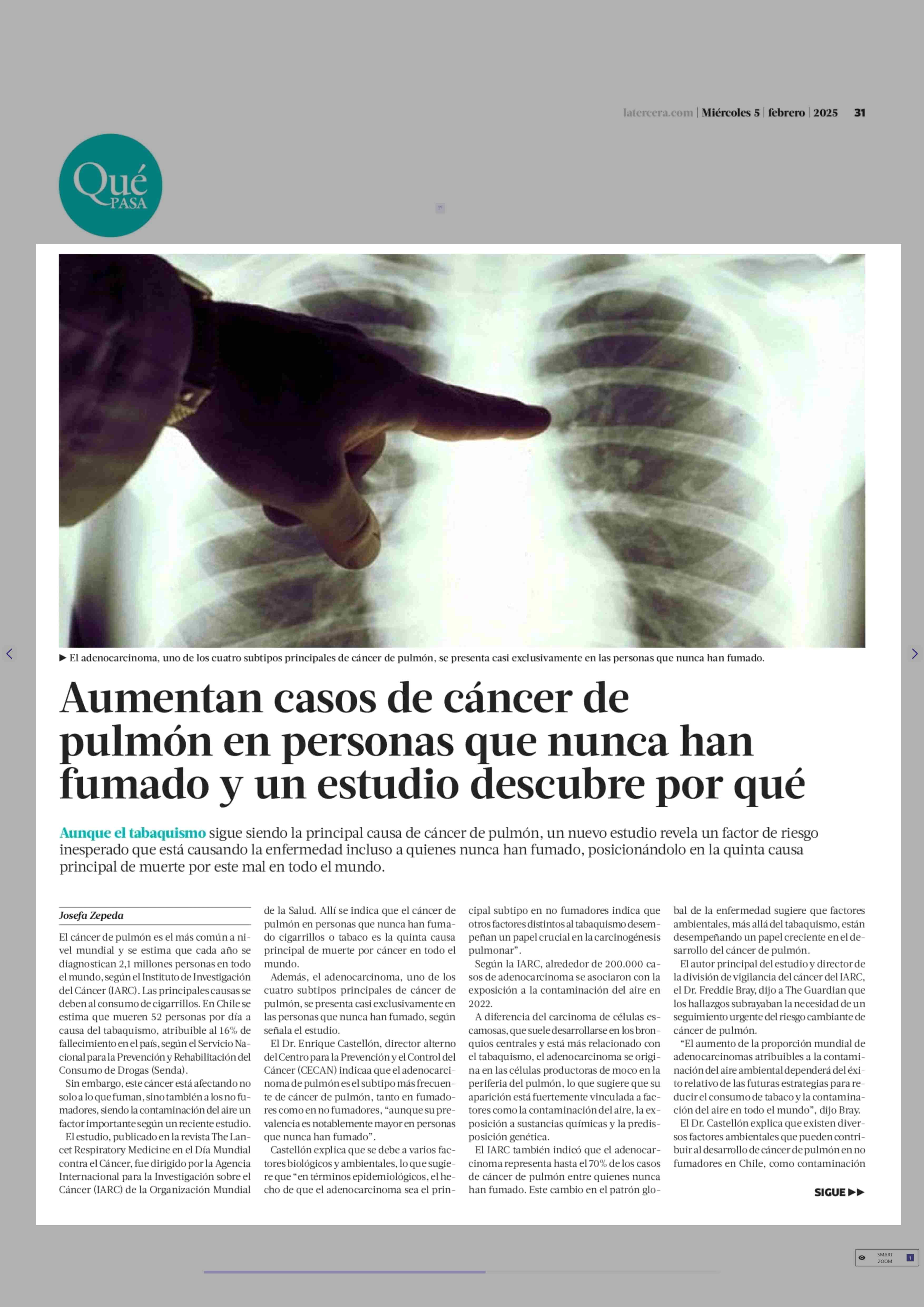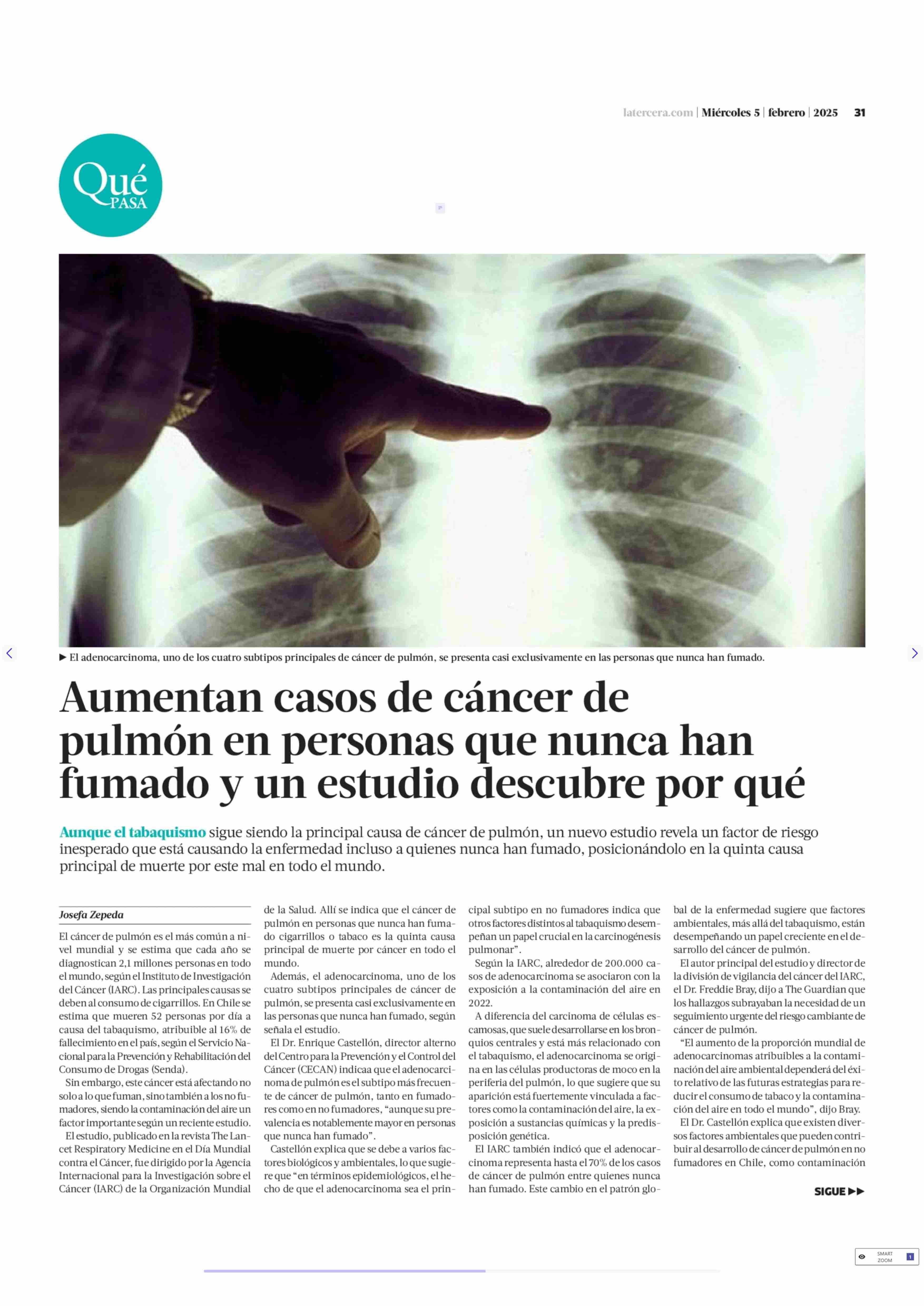 Aumentan casos de cáncer de pulmón en personas que nunca han fumado y un estudio descubre por qué 05-02-2025 La Tercera |