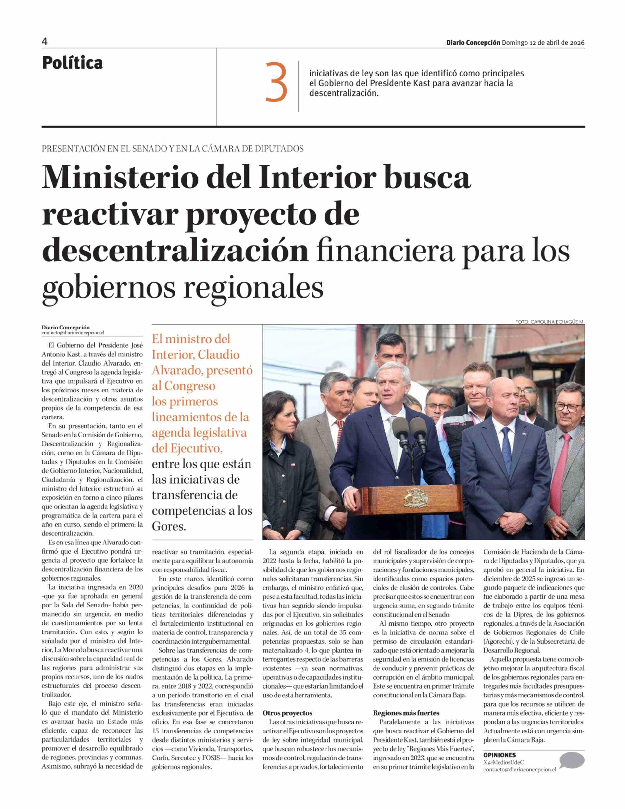 Ministerio del Interior busca reactivar proyecto de descentralización financiera para los gobiernos regionales 12-04-2026 Diario Concepción |