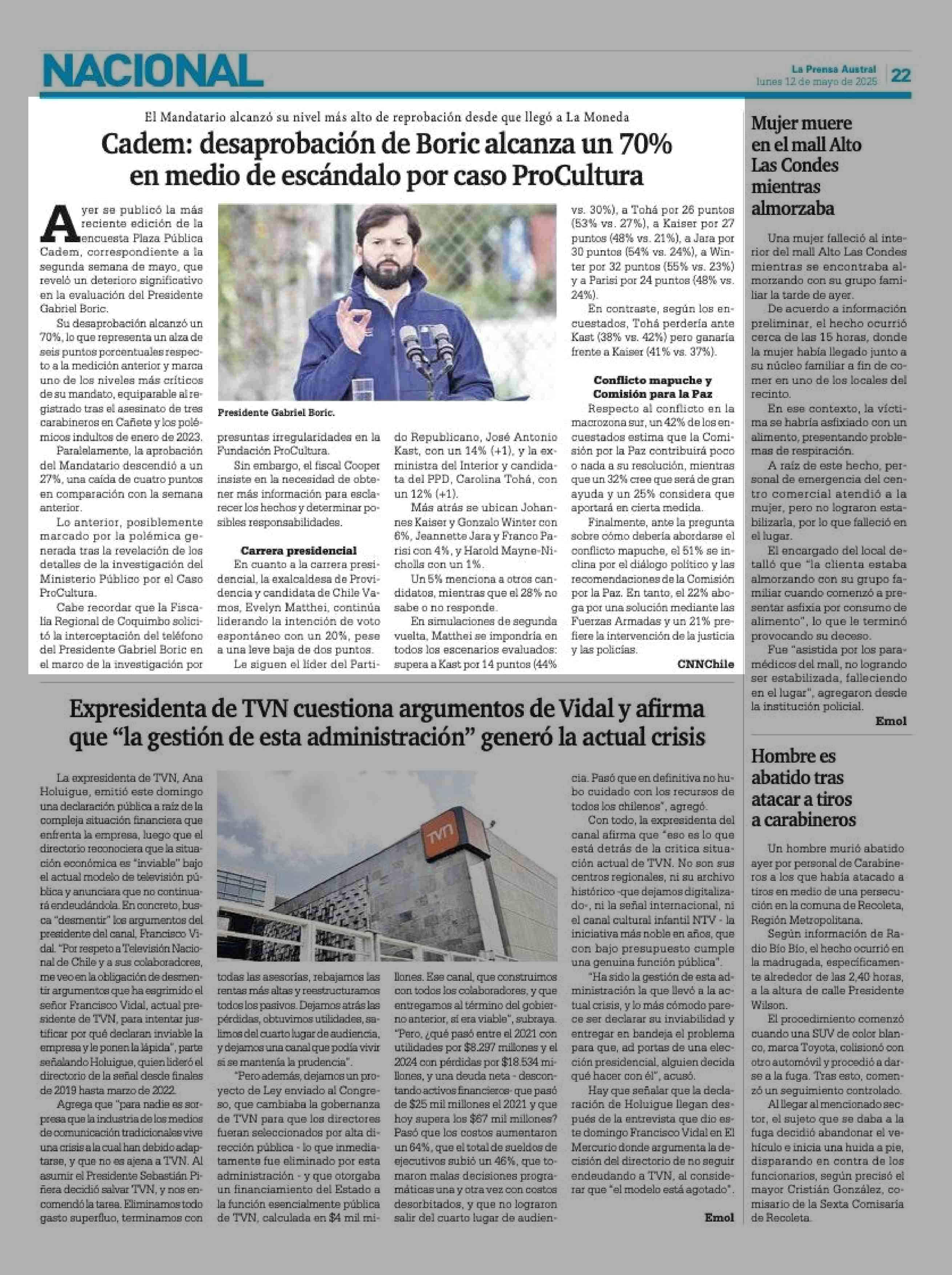 Cadem: desaprobación de Boric alcanza un 70% en medio de escándalo por caso ProCultura 12-05-2025 La Prensa Austral |
