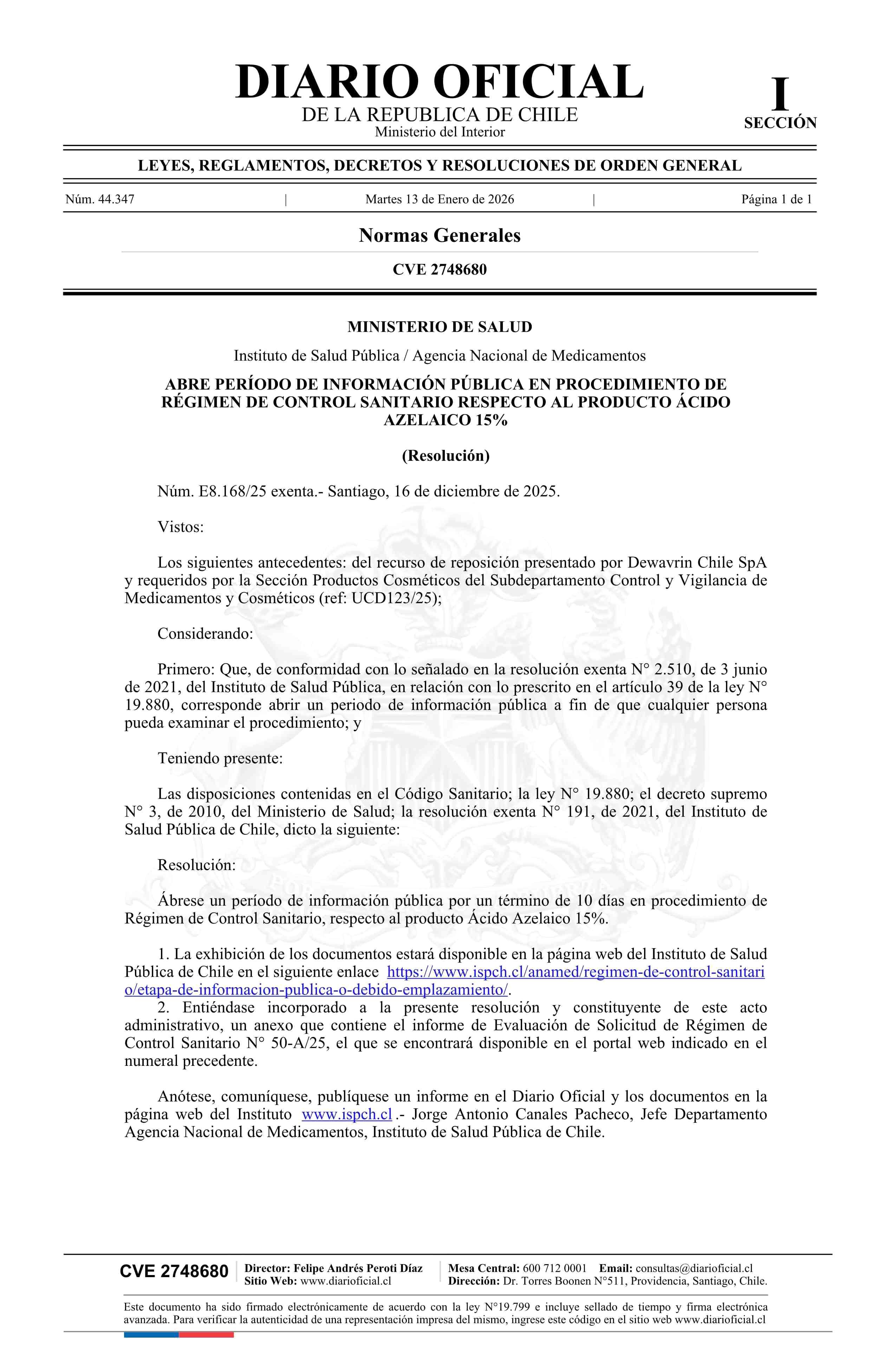 | Título: | Resolución exenta número E8.168/25, de 2025.- Abre período de información pública en procedimiento de Régimen de Control Sanitario respecto al producto Ácido Azelaico 15% |