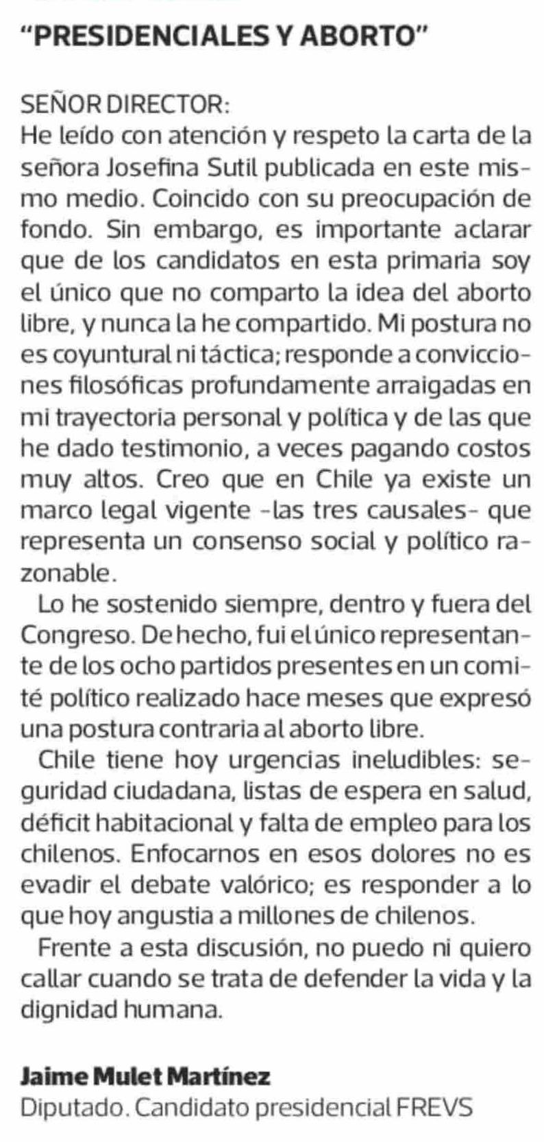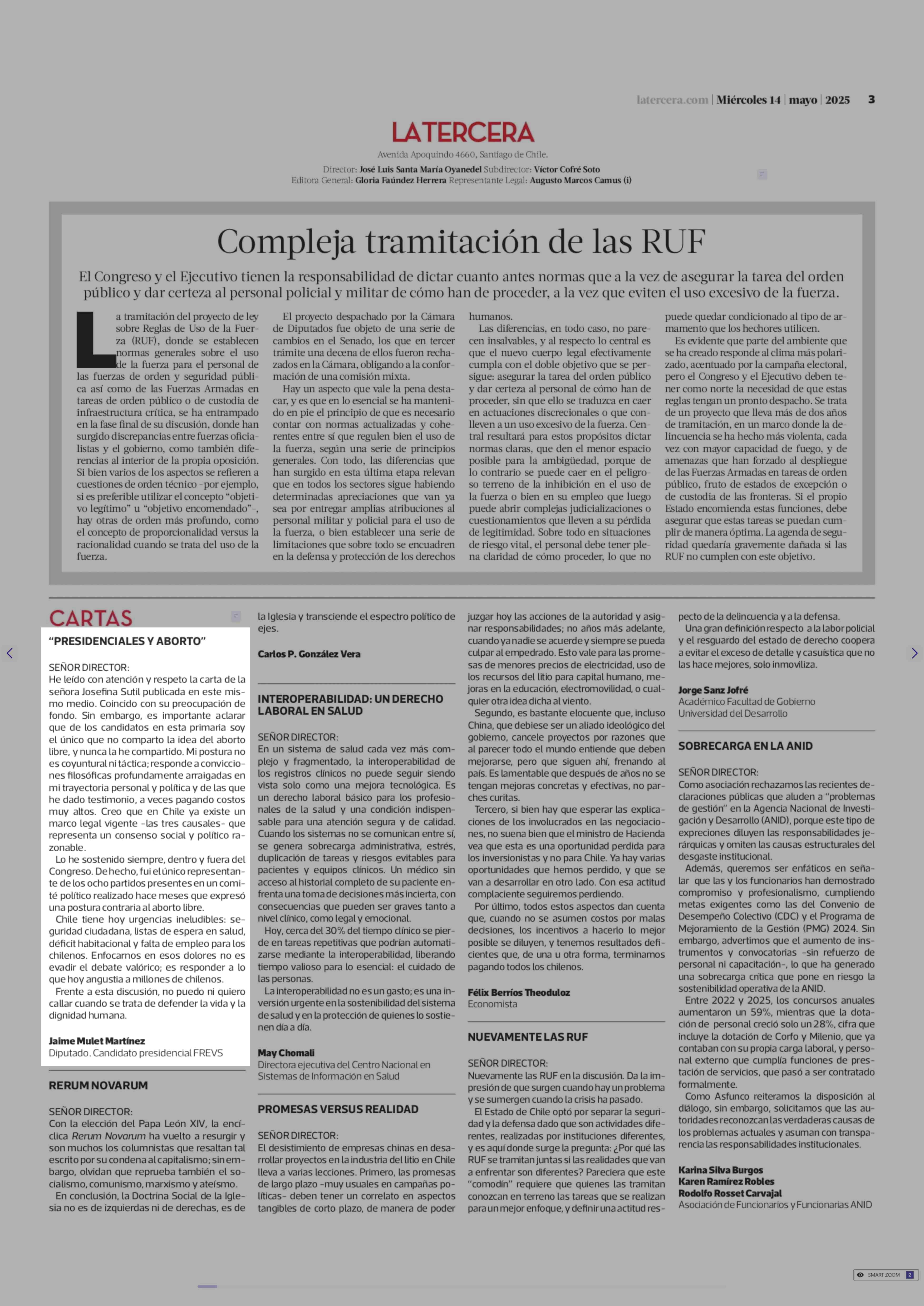 CARTAS: "PRESIDENCIALES Y ABORTO" 14-05-2025 La Tercera |