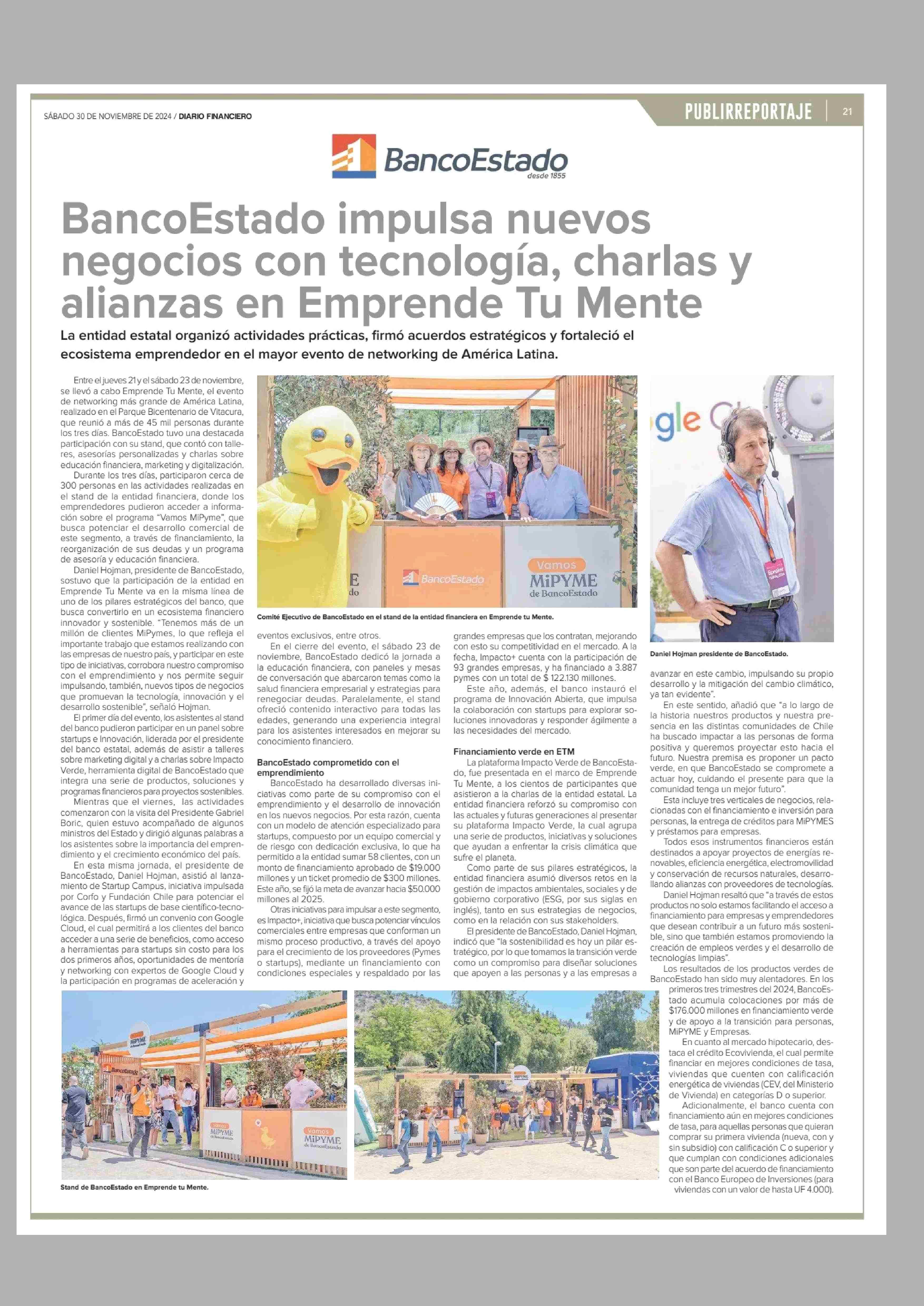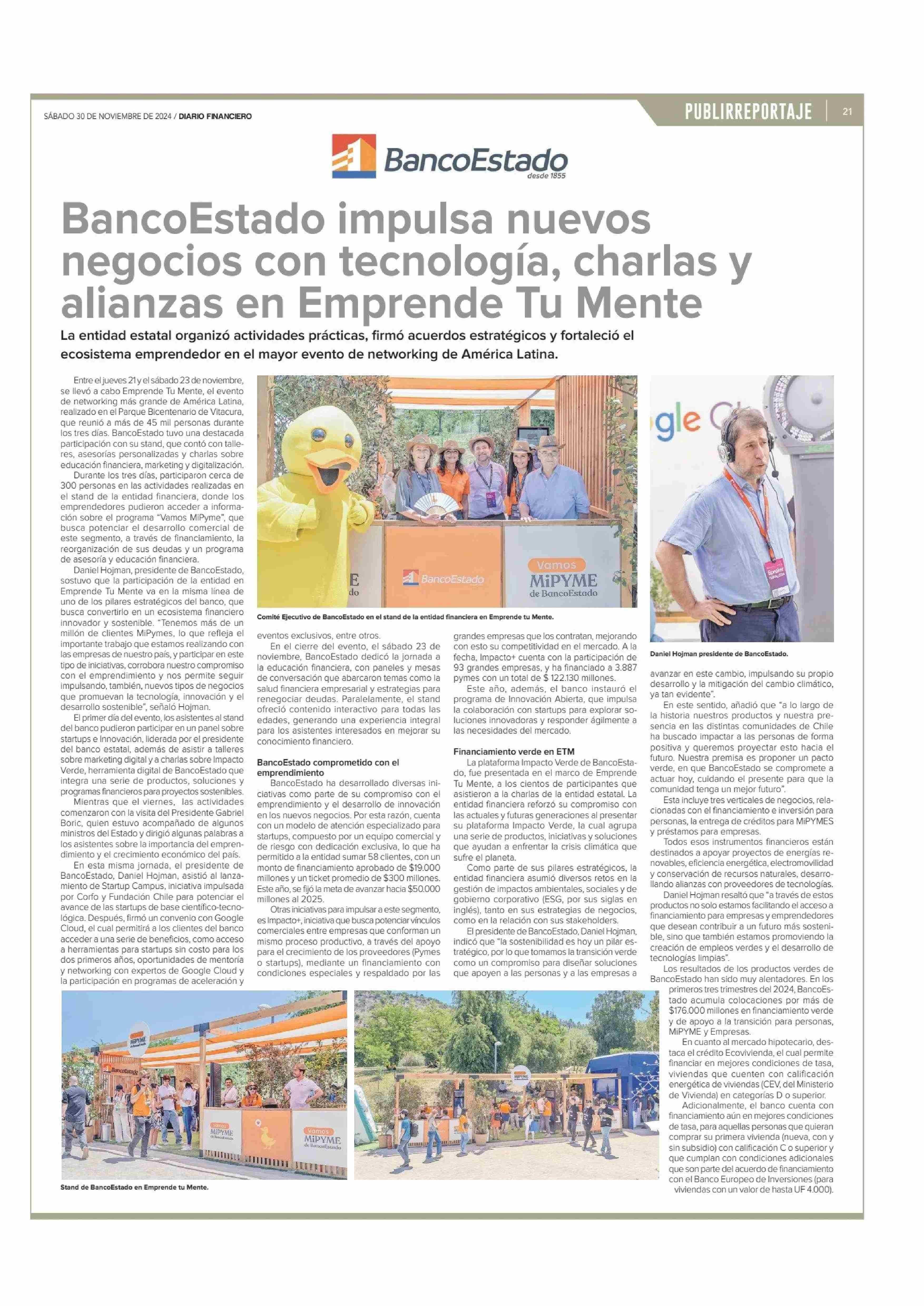 BancoEstado impulsa nuevos negocios con tecnología, charlas y alianzas en Emprende Tu Mente 30-11-2024 Diario Financiero |