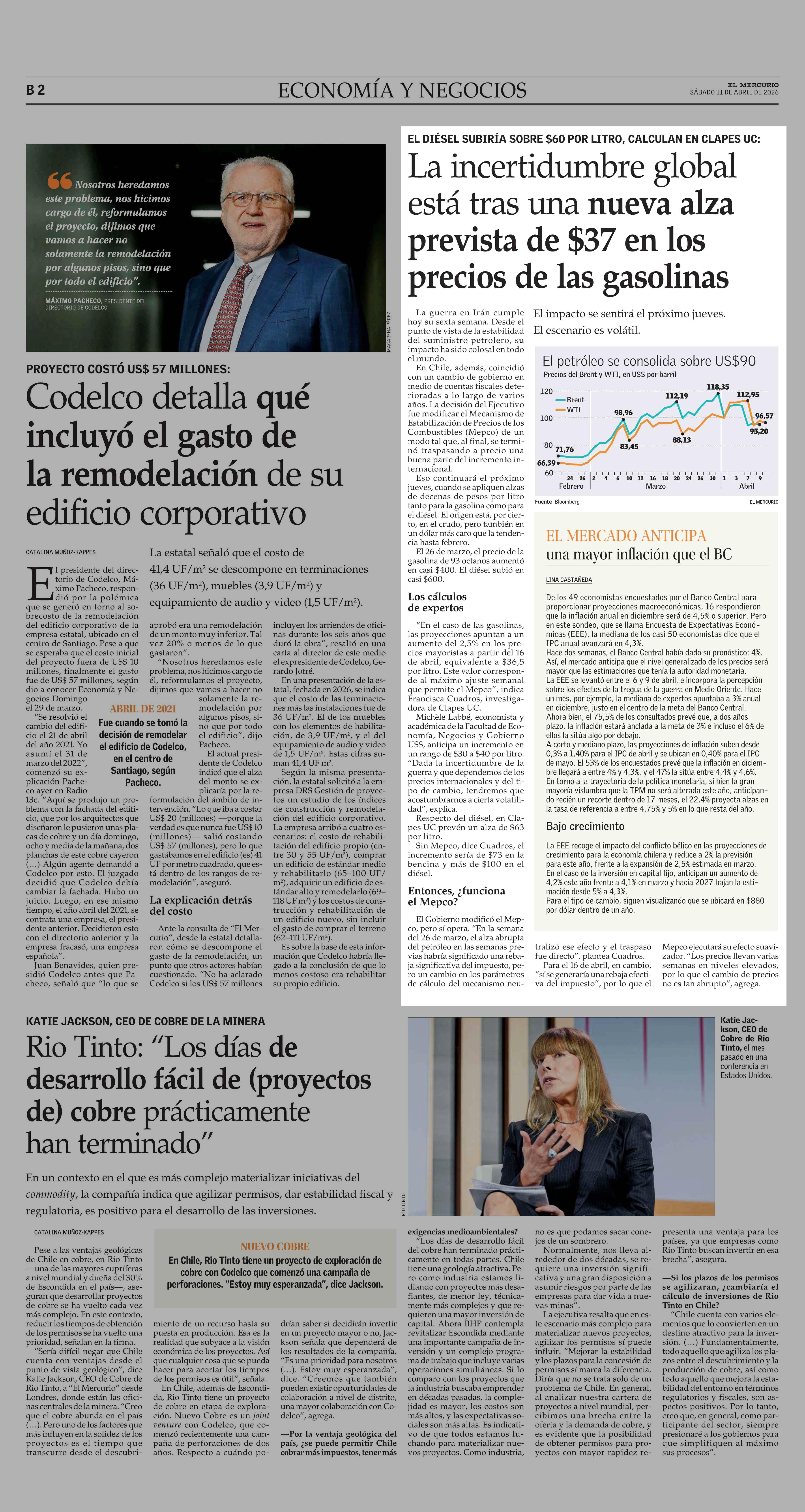 La incertidumbre global está tras una nueva alza prevista de $37 en los precios de las gasolinas 11-04-2026 El Mercurio |