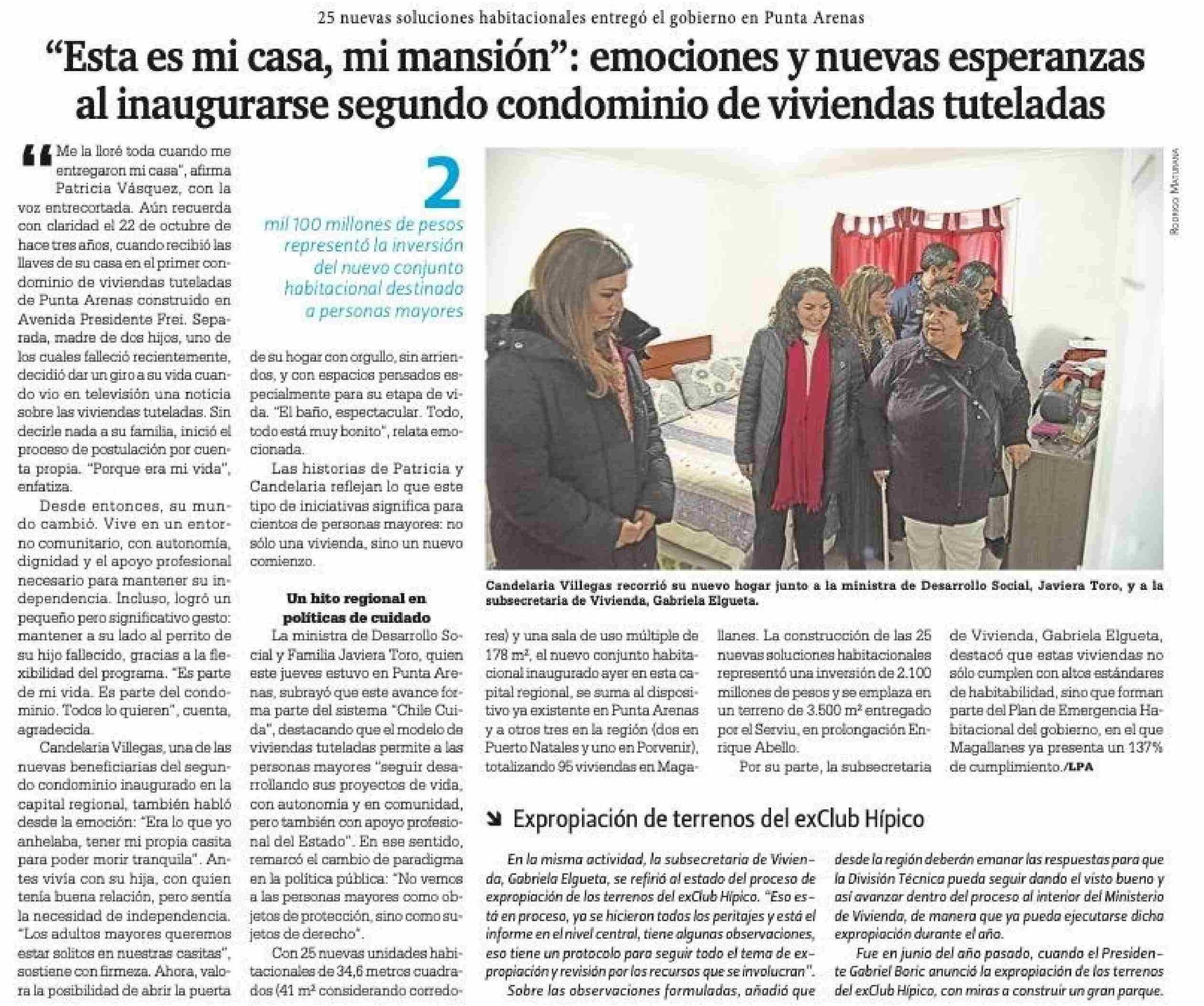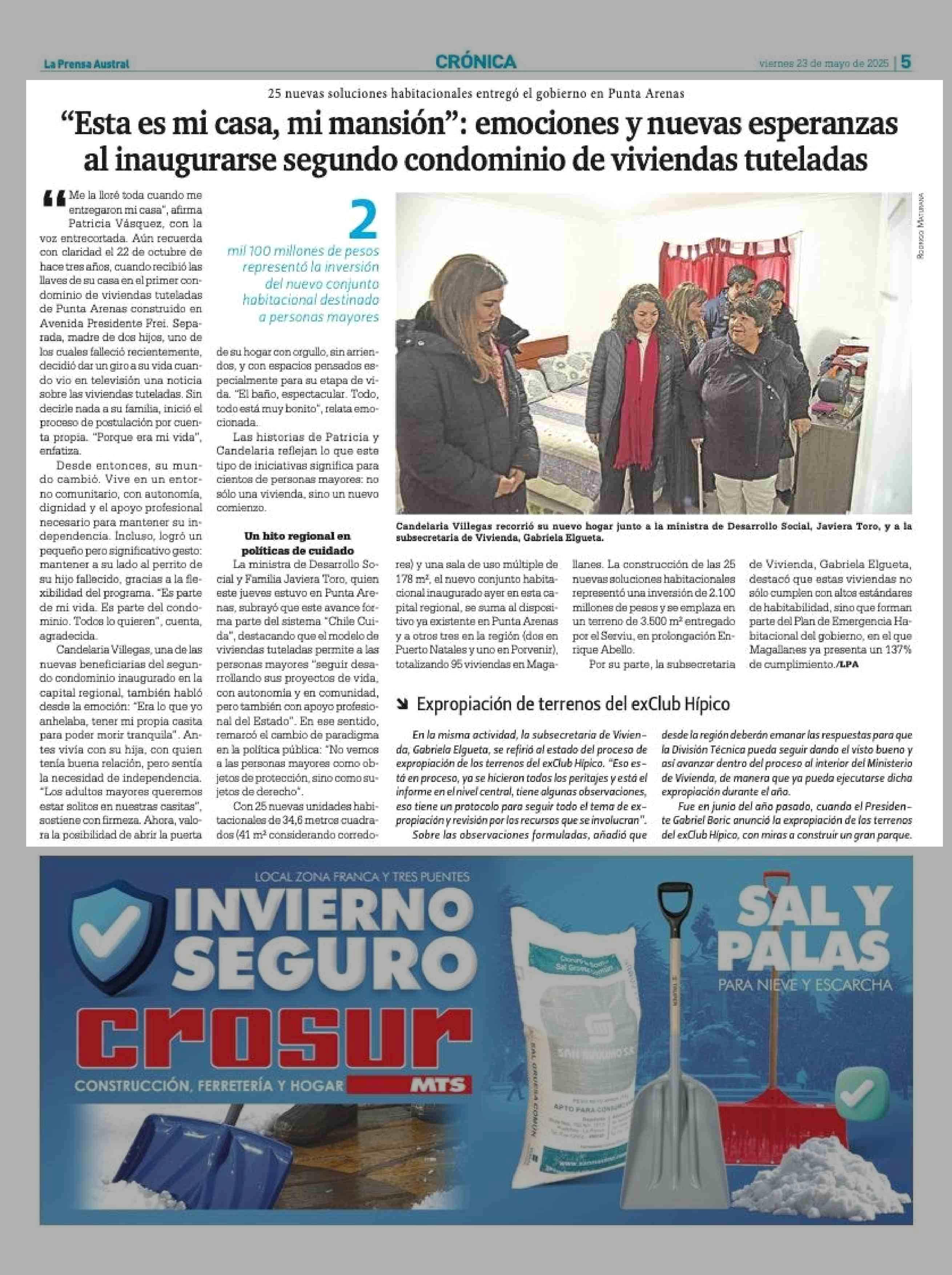“Esta es mi casa, mi mansión”: emociones y nuevas esperanzas al inaugurarse segundo condominio de viviendas tuteladas 23-05-2025 La Prensa Austral |