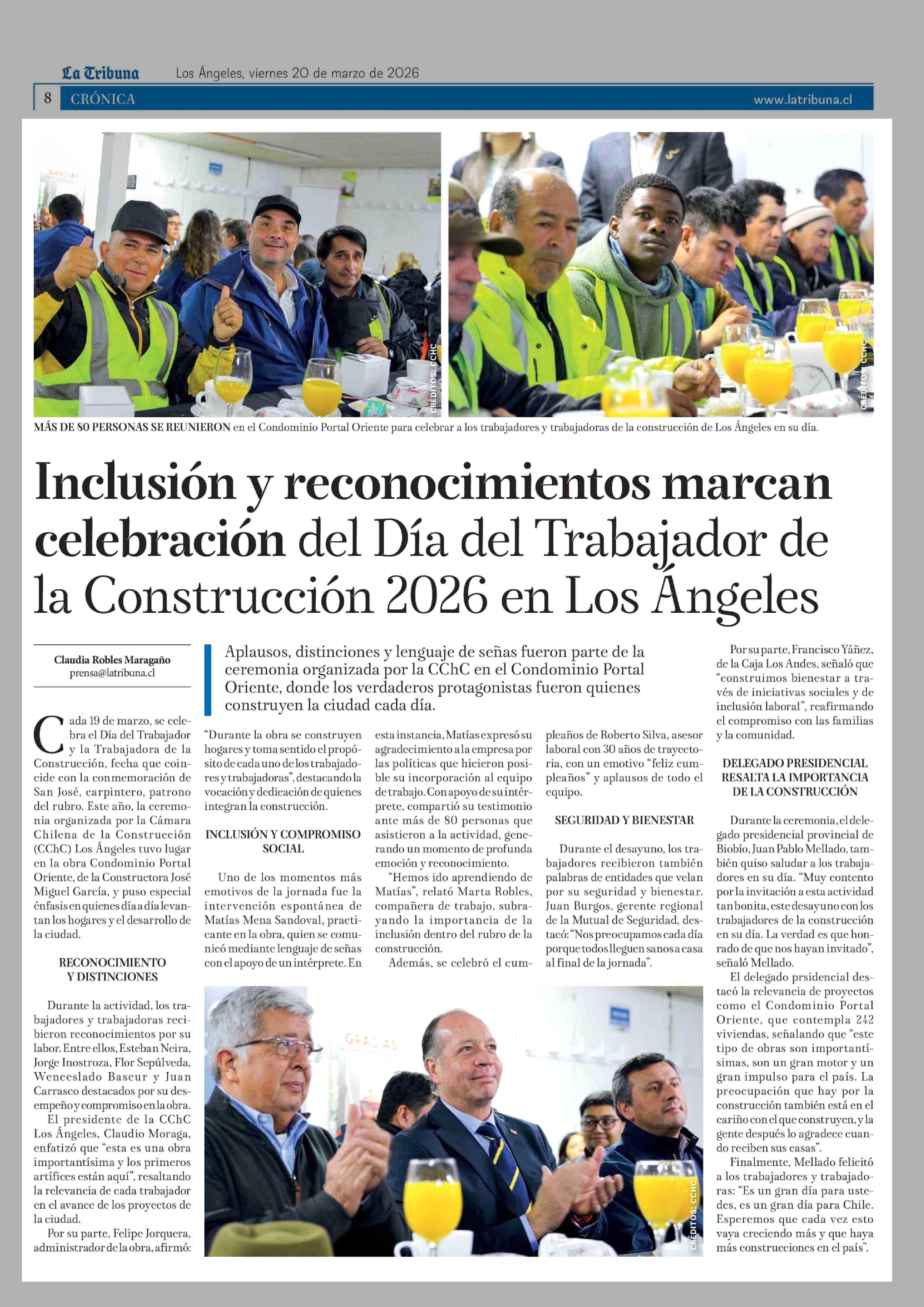 Inclusión y reconocimientos marcan celebración del Día del Trabajador de la Construcción 2026 en Los Angeles 20-03-2026 La Tribuna |