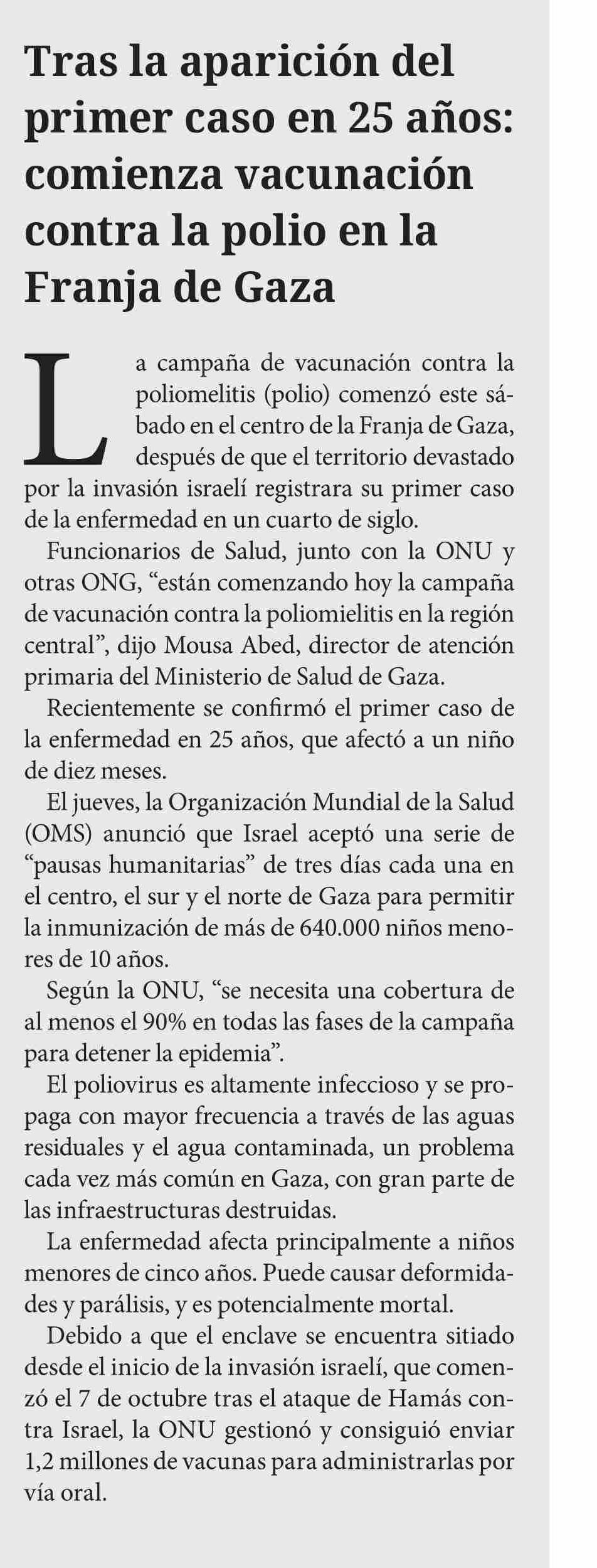 Tras la aparición del primer caso en 25 años: comienza vacunación contra la polio en la Franja de Gaza 01-09-2024 Diario Chañarcillo |