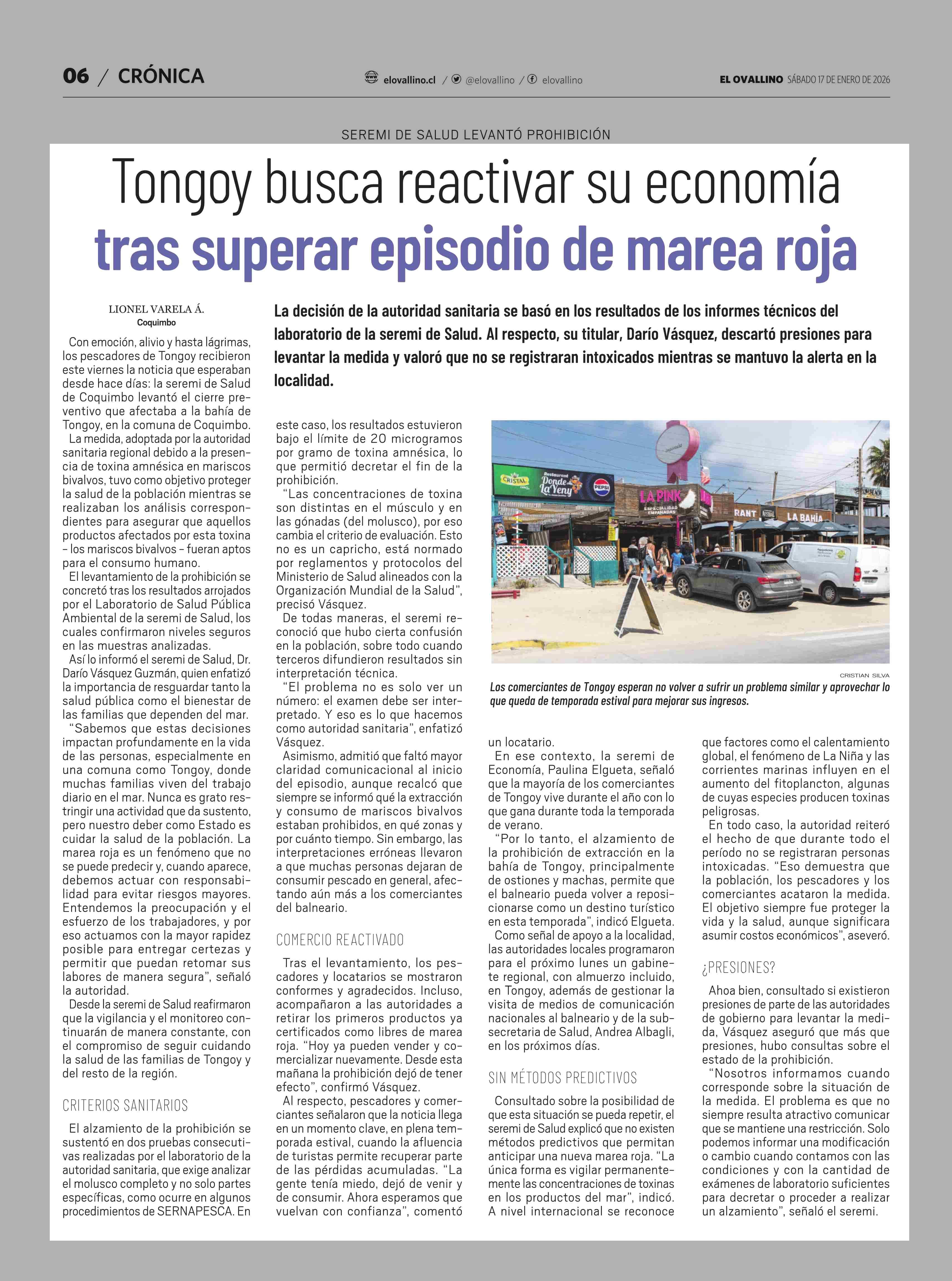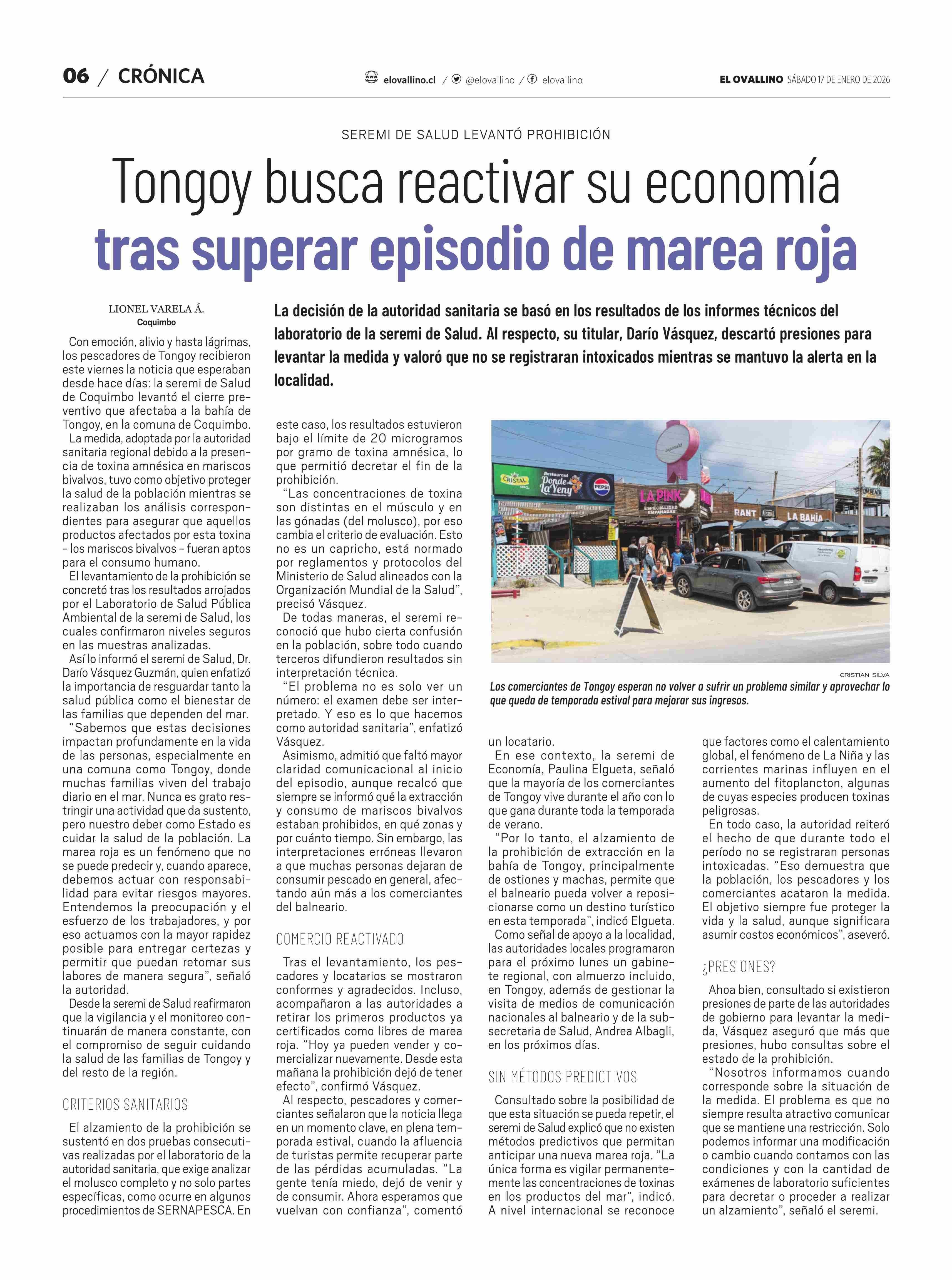 Tongoy busca reactivar su economía tras superar episodio de marea roja 17-01-2026 El Ovallino |