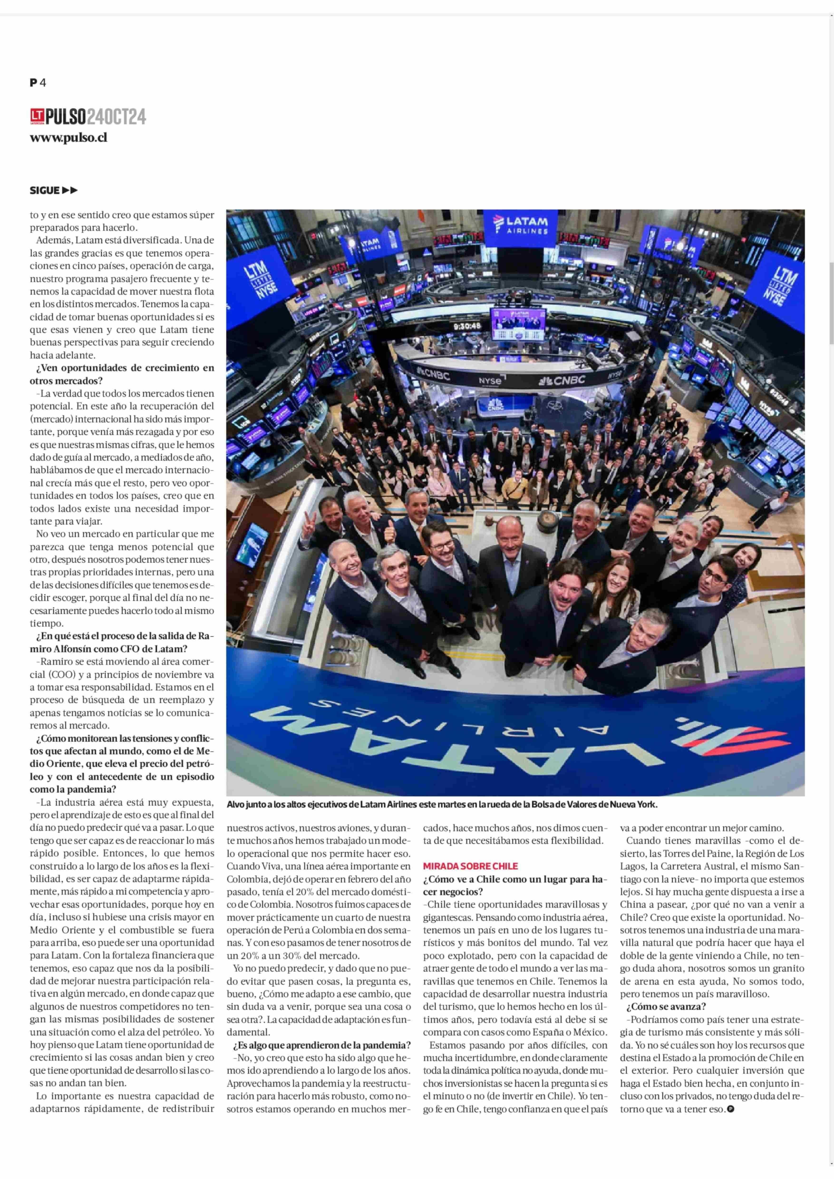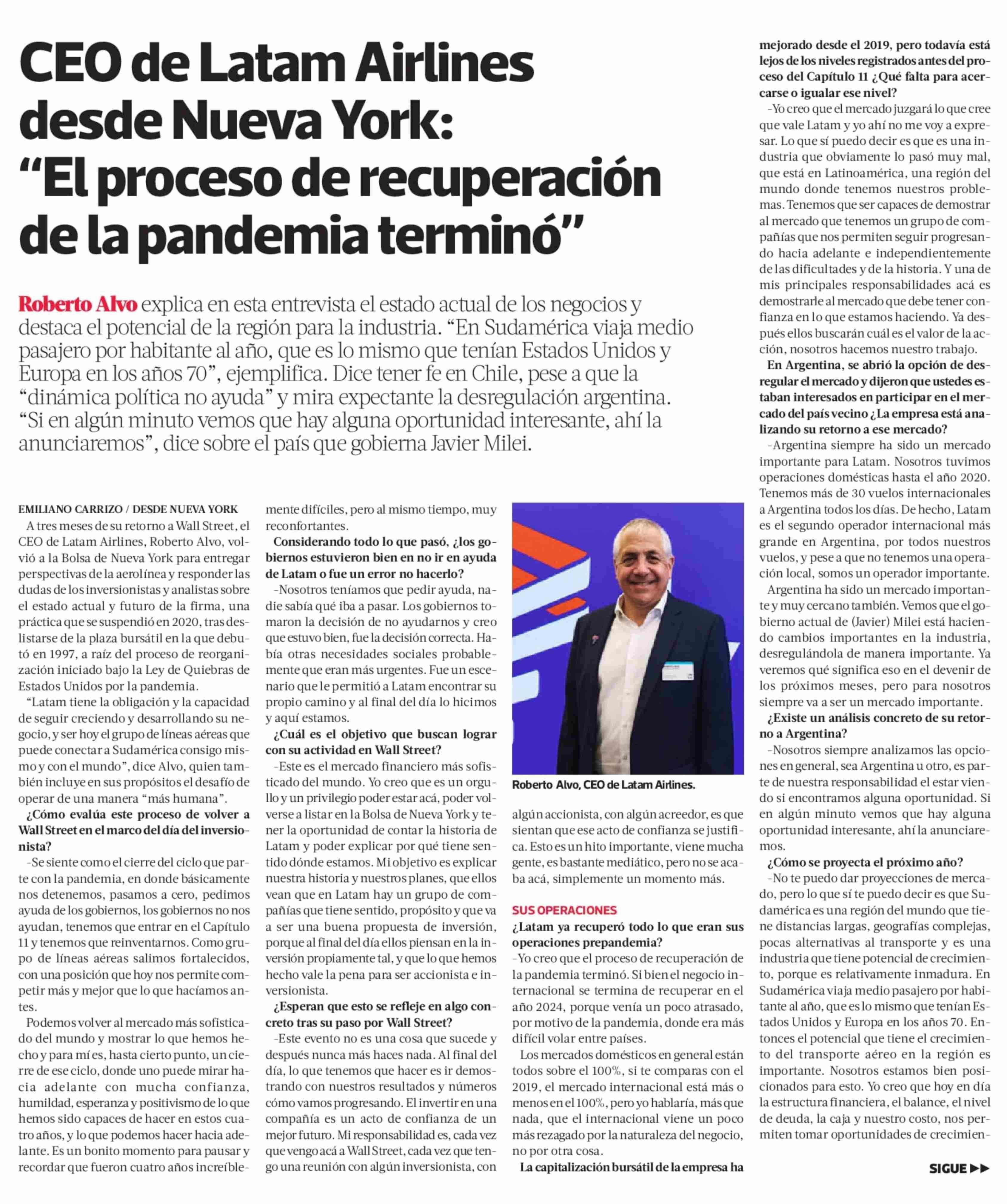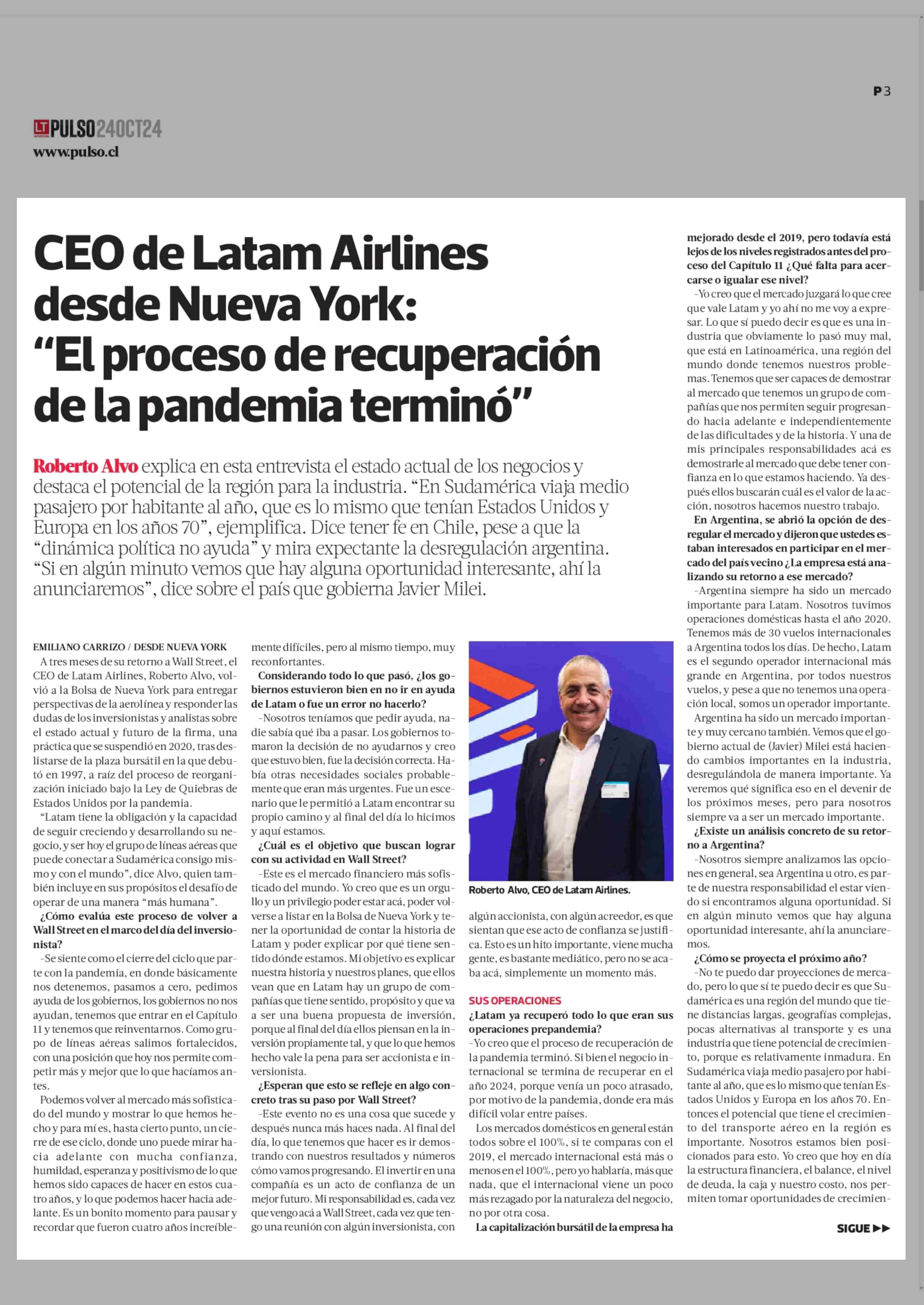 CEO de Latam Airlines desde Nueva York: “El proceso de recuperación de la pandemia terminó" 24-10-2024 La Tercera |