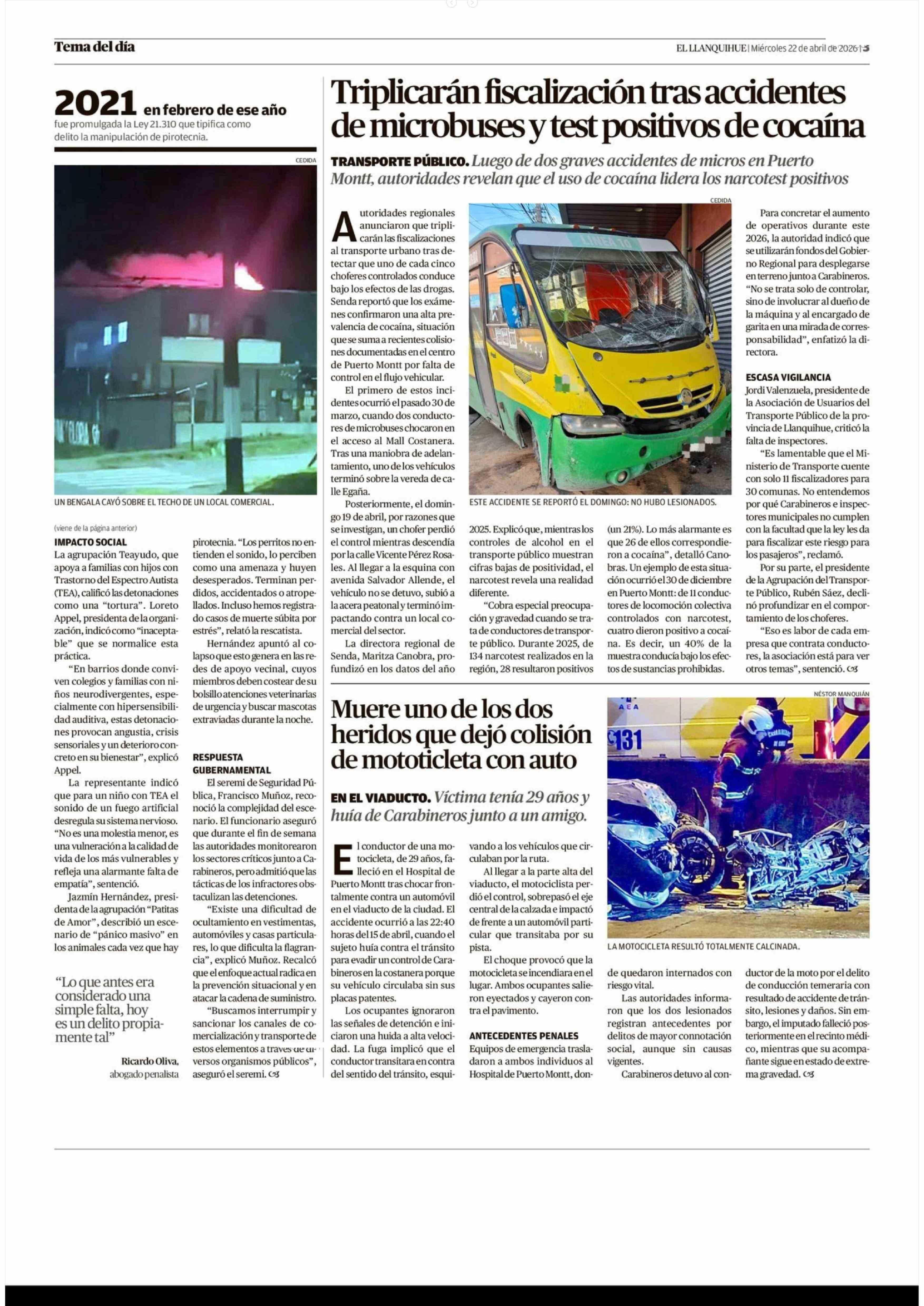 Triplicarán fiscalización tras accidentes de microbuses y test positivos de cocaína 22-04-2026 El Llanquihue |