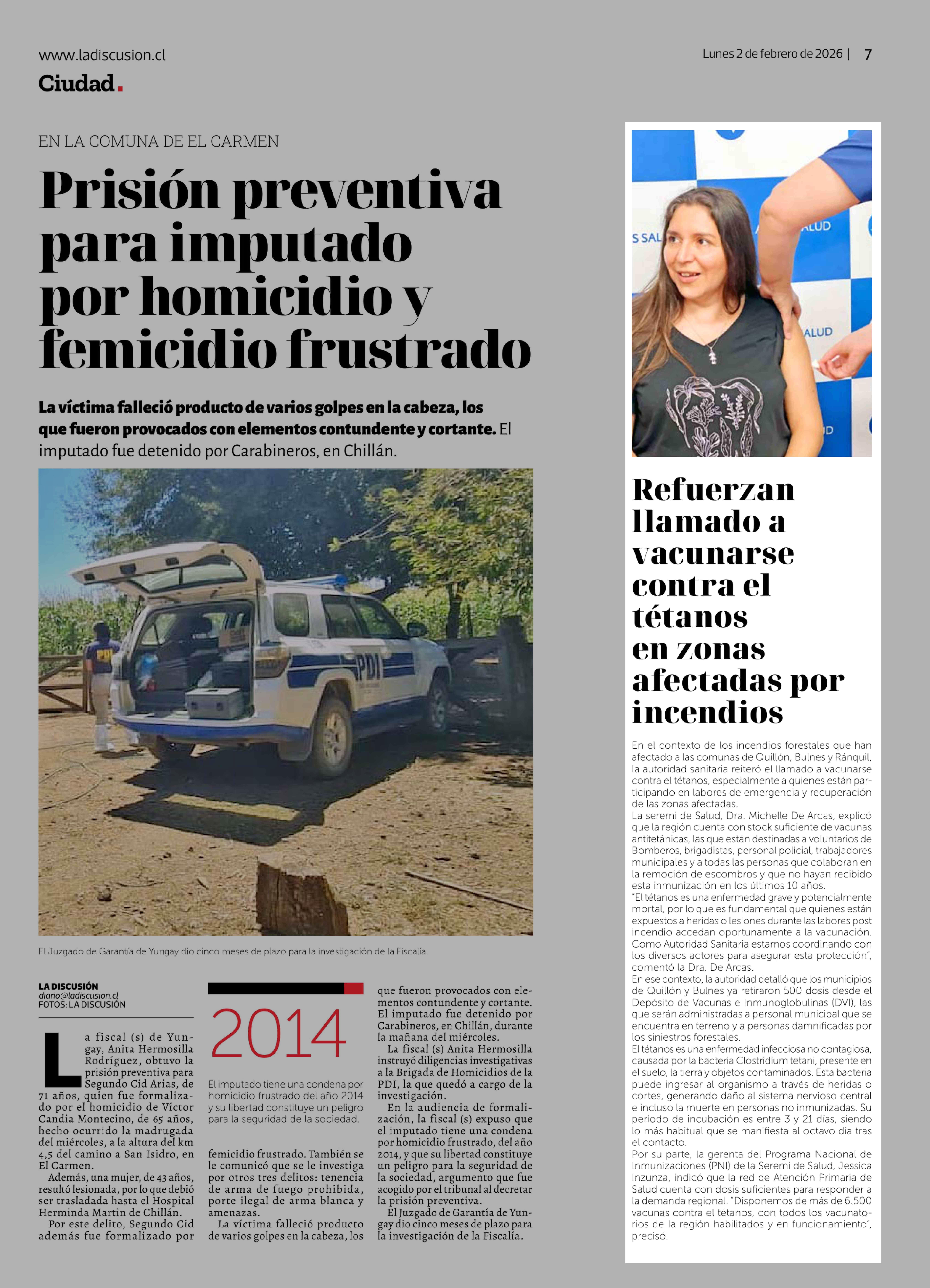 Refuerzan llamado a vacunarse contra el tétanos en zonas afectadas por incendios 02-02-2026 La Discusión |