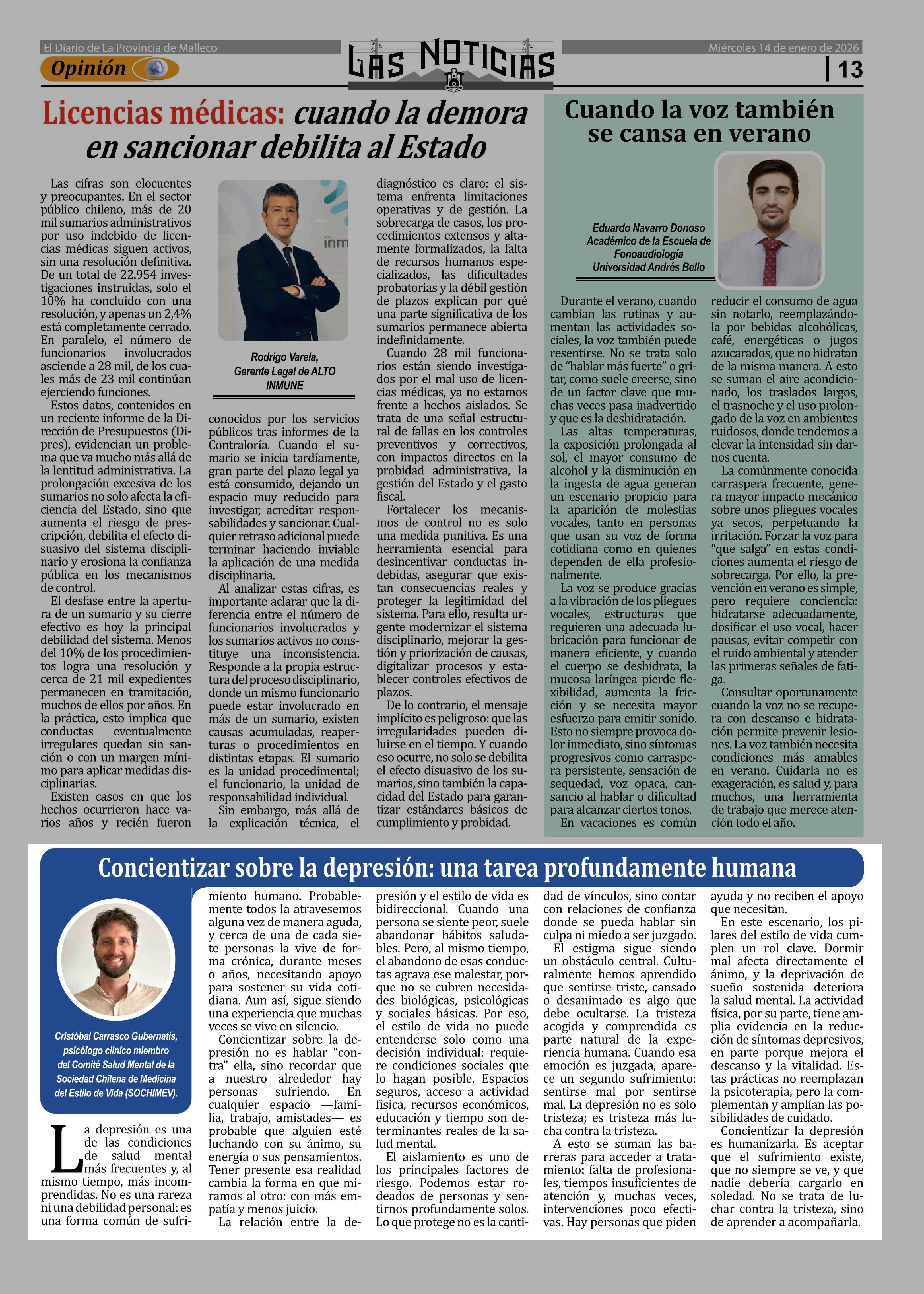 Columnas de Opinión: Concientizar sobre la depresión: una tarea profundamente humana 14-01-2026 Las Noticias |