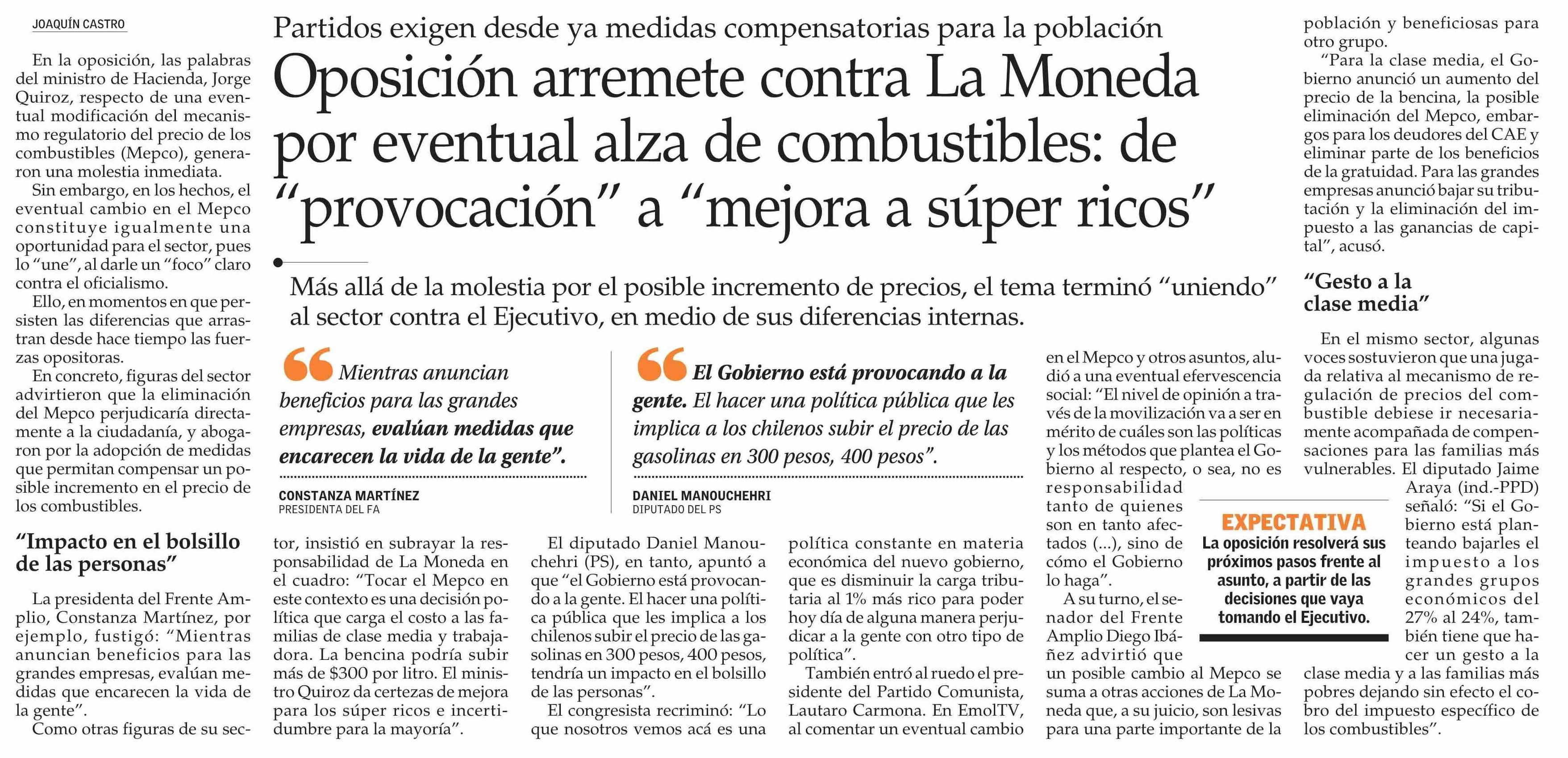 Oposición arremete contra La Moneda por eventual alza de combustibles: de “provocación” a “mejora a súper ricos” 20-03-2026 El Mercurio |