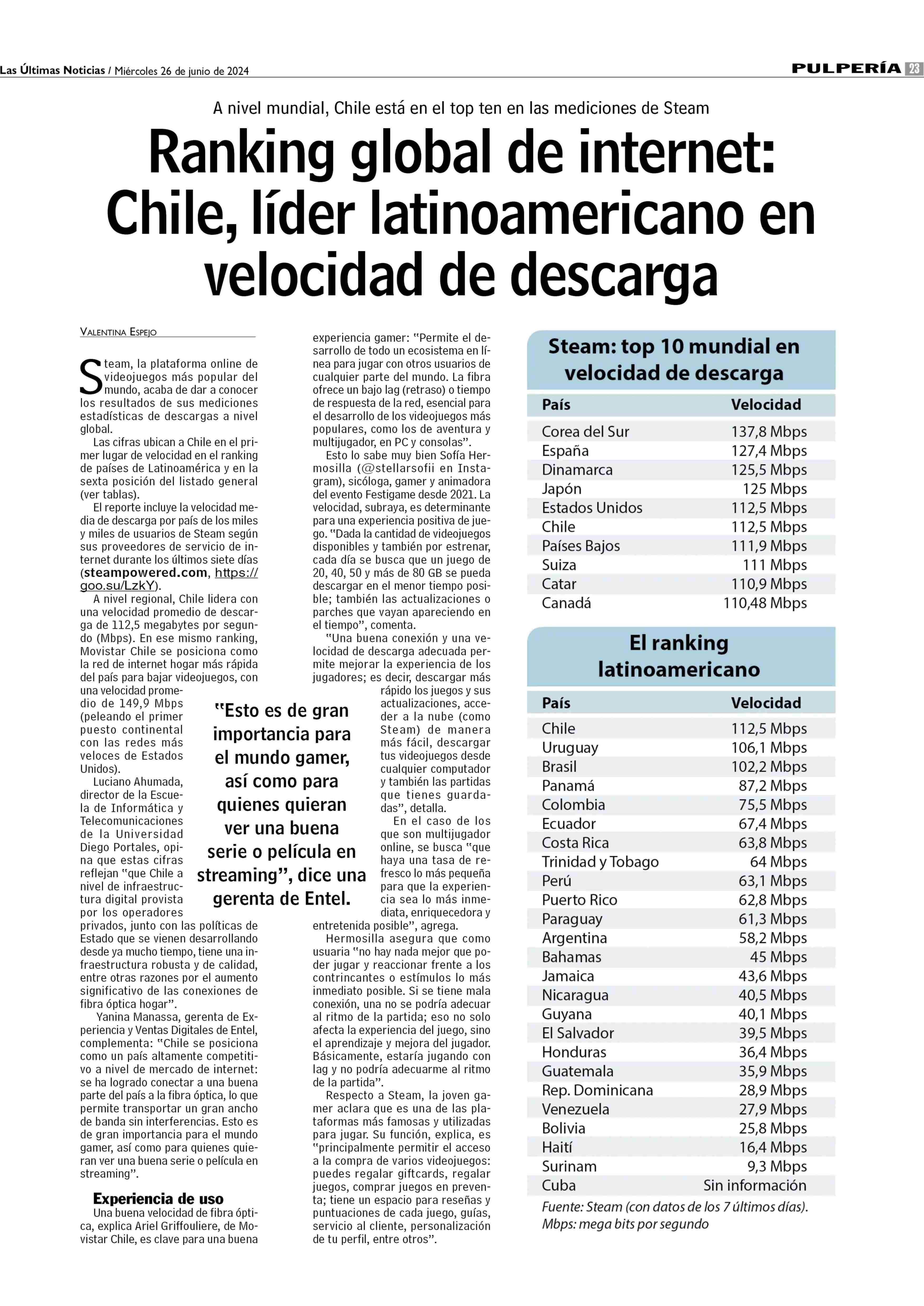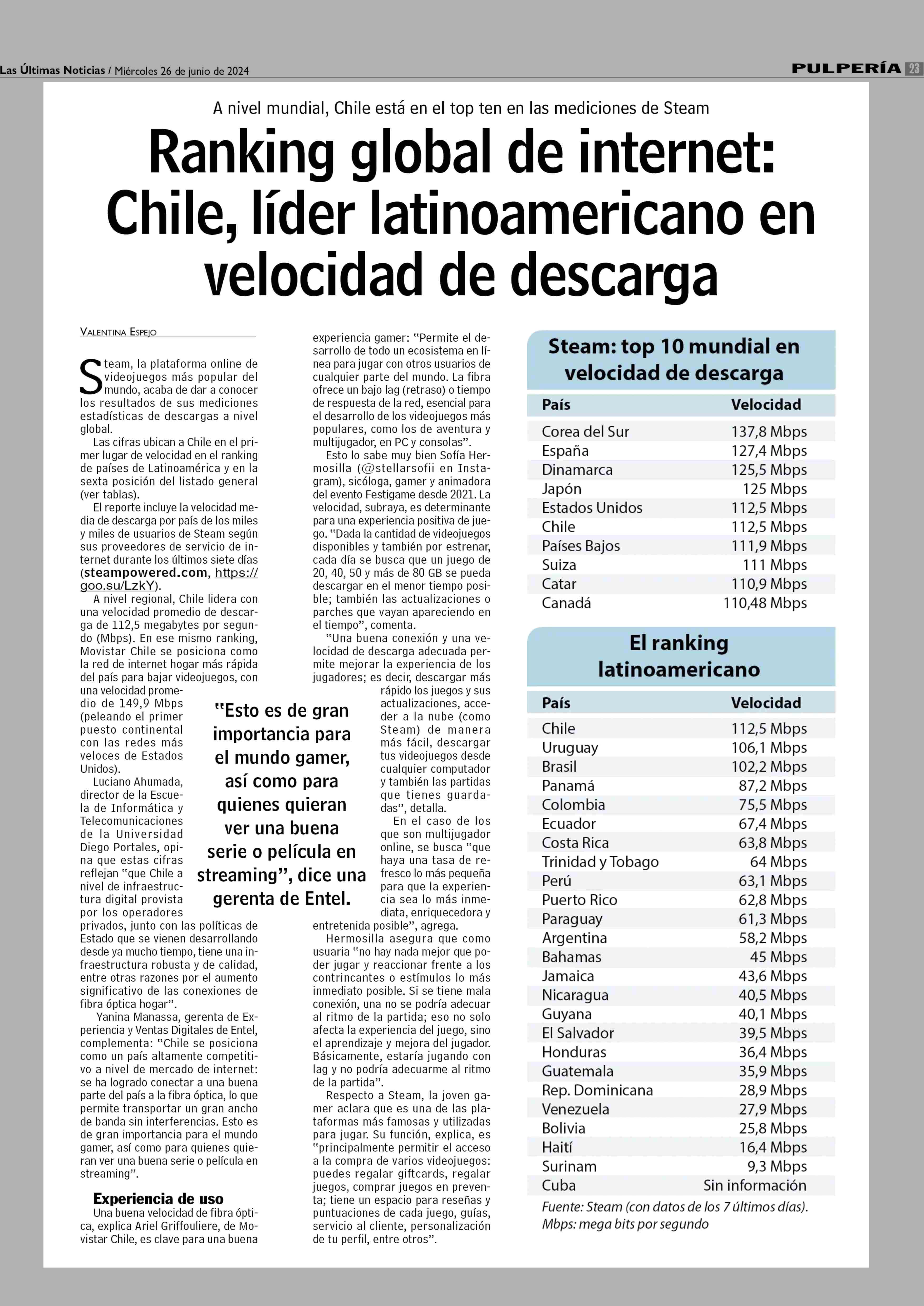 Ranking global de internet: Chile, lider latinoamericano en velocidad de descarga 26-06-2024 Las Últimas Noticias |