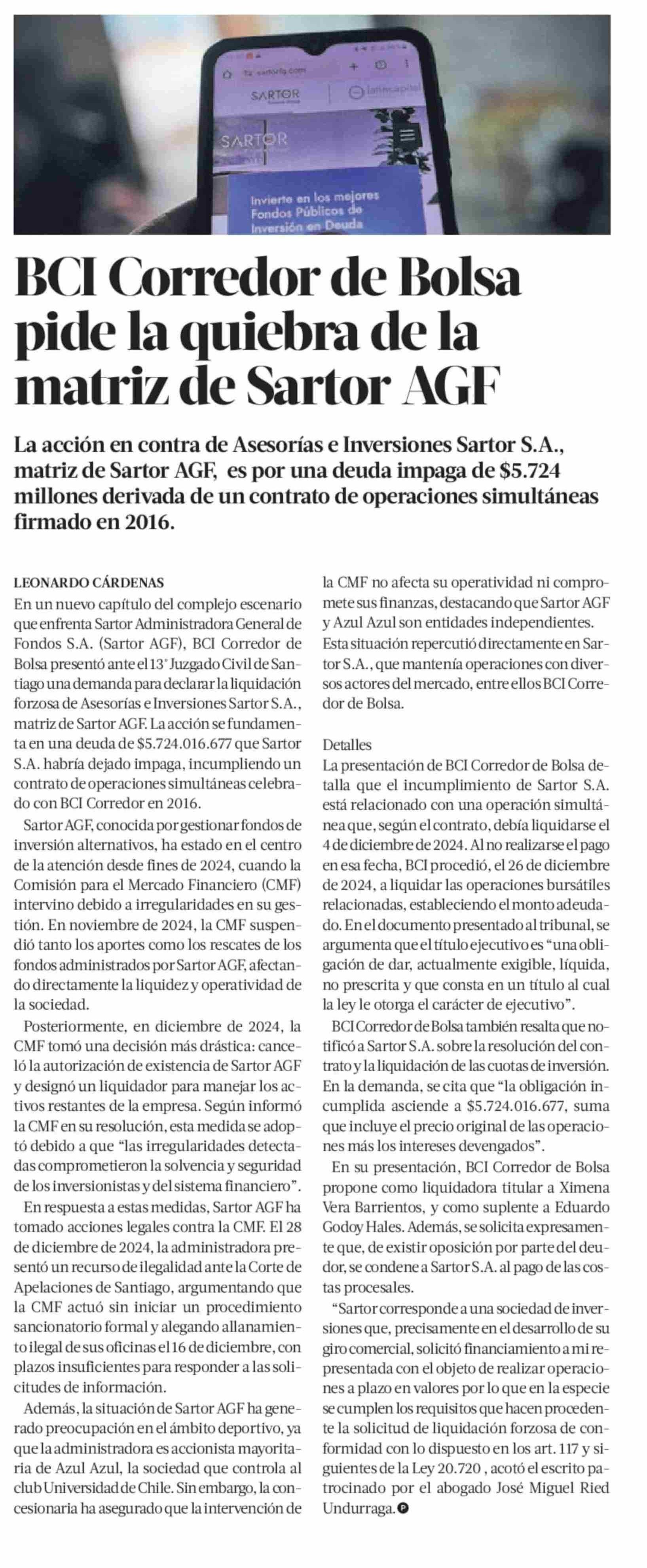 BCI Corredor de Bolsa pide la quiebra de la matriz de Sartor AGF 11-01-2025 La Tercera |
