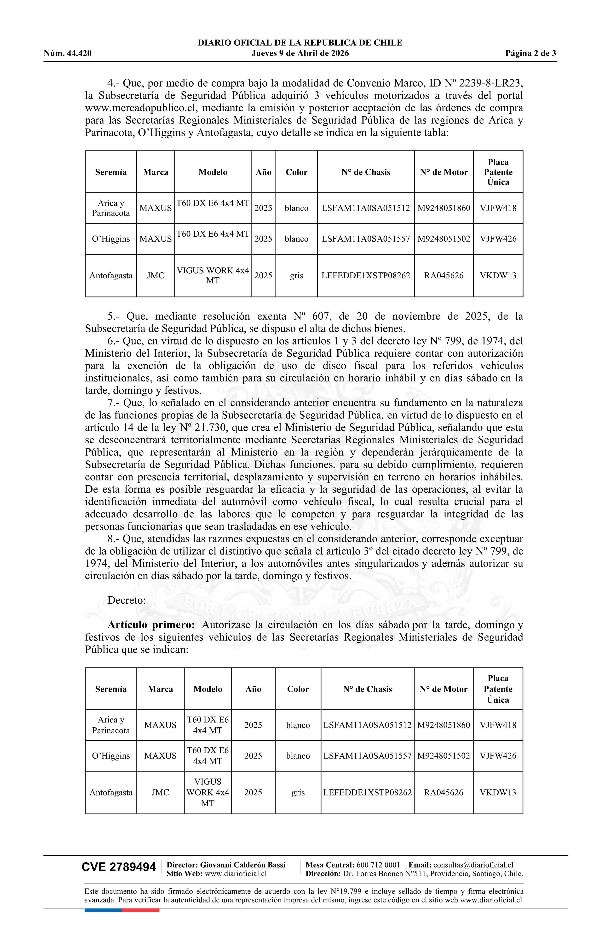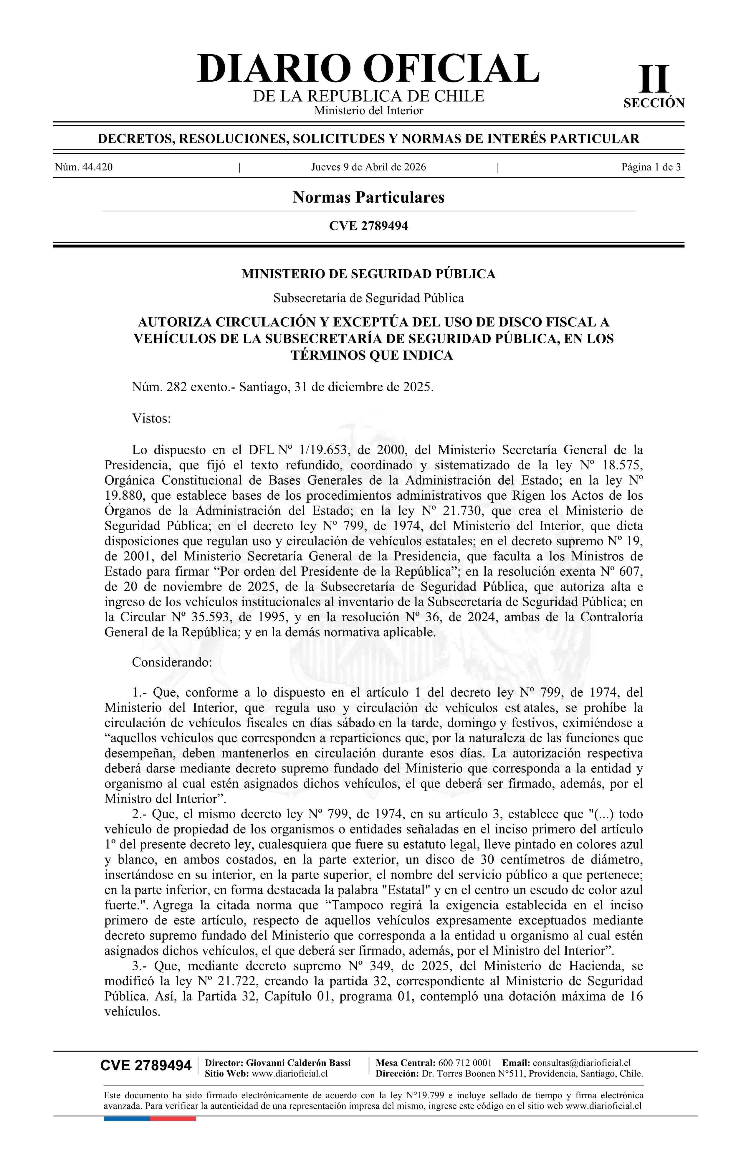Decreto exento número 282, de 2025.- Autoriza circulación y exceptúa del uso de disco fiscal a vehículos de la Subsecretaría de Seguridad Pública, en los términos que indica 09-04-2026 Diario Oficial Edición Electrónica |