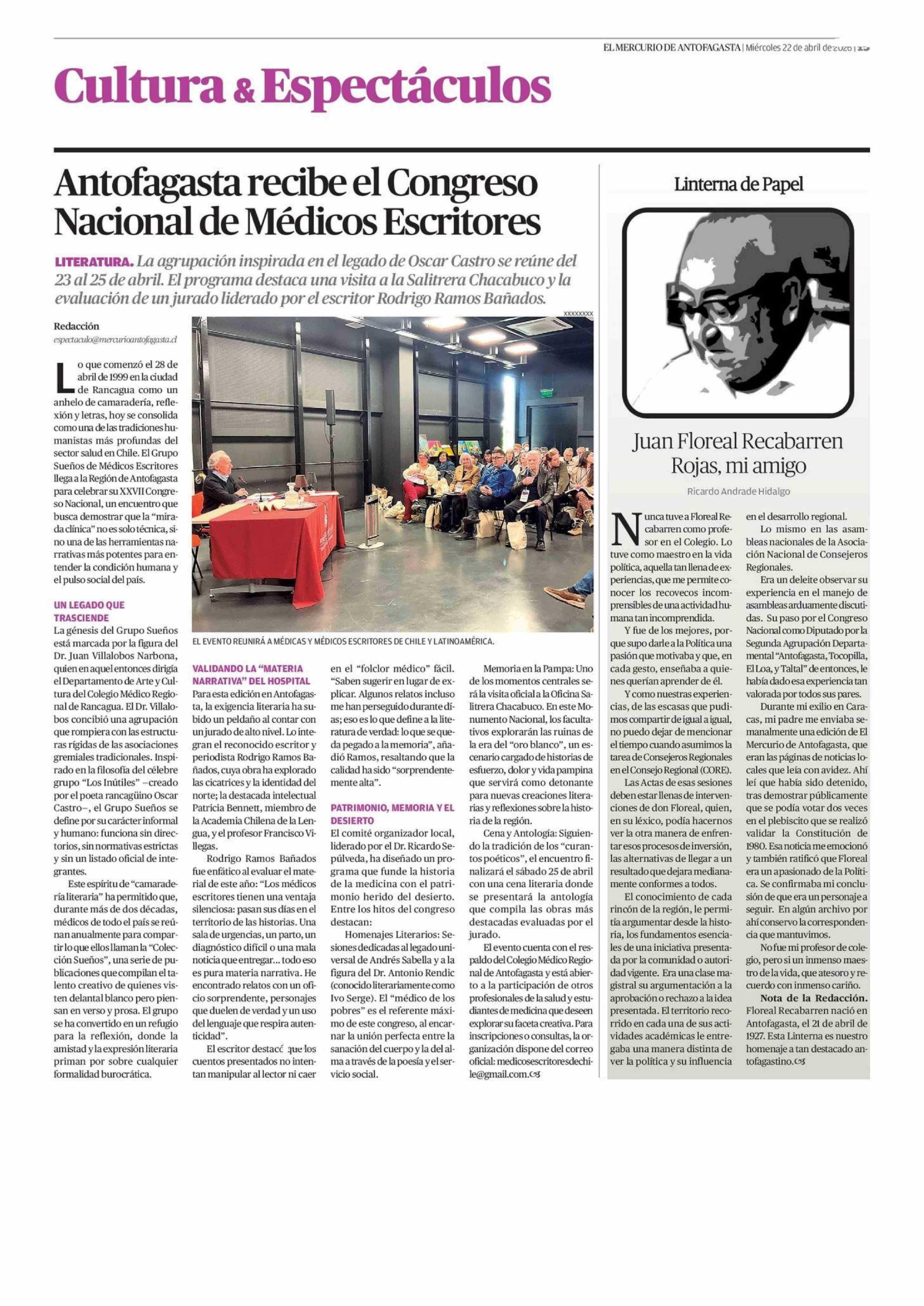 Antofagasta recibe el Congreso Nacional de Médicos Escritores 22-04-2026 El Mercurio de Antofagasta |