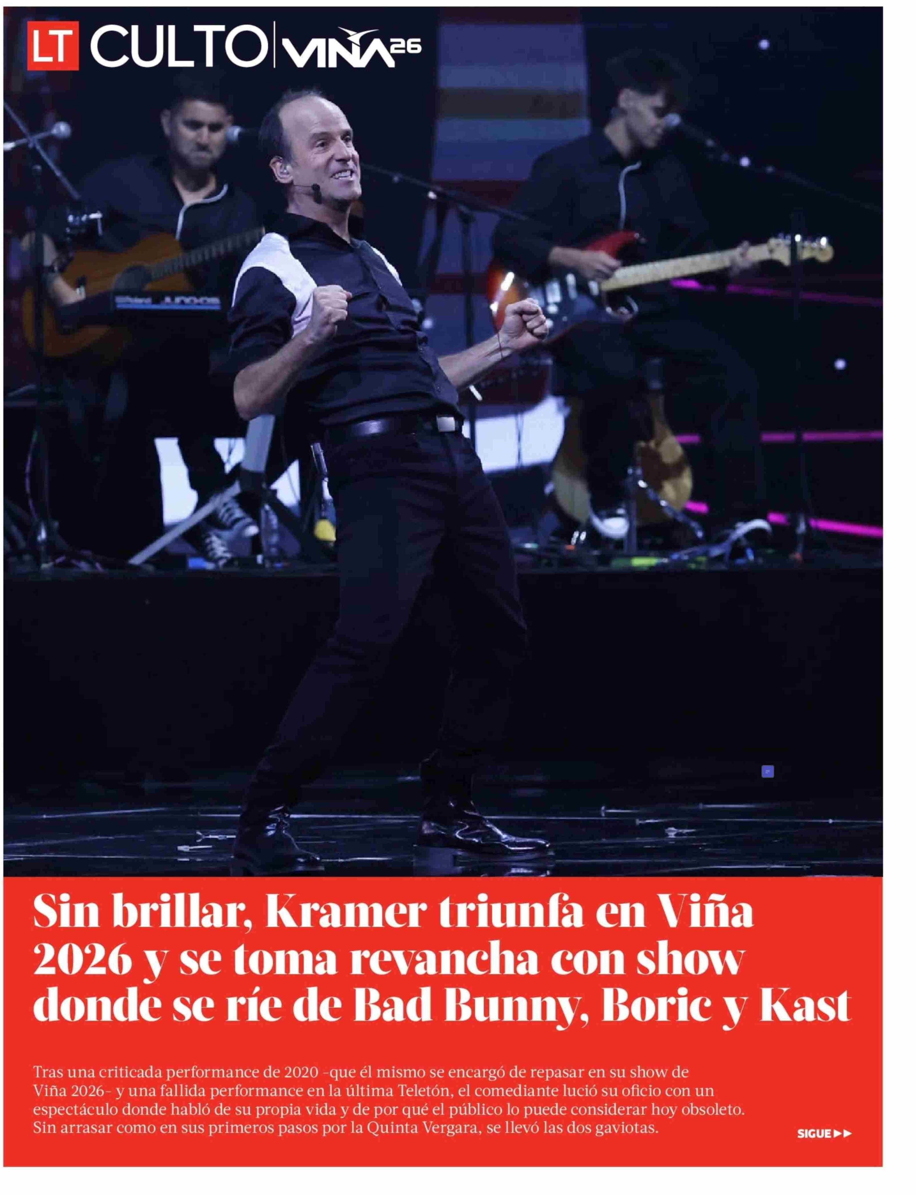 Título: Sin brillar, Kramer triunfa en Viña 2026 y se toma revancha con show donde se ríe de Bad Bunny, Boric y kast