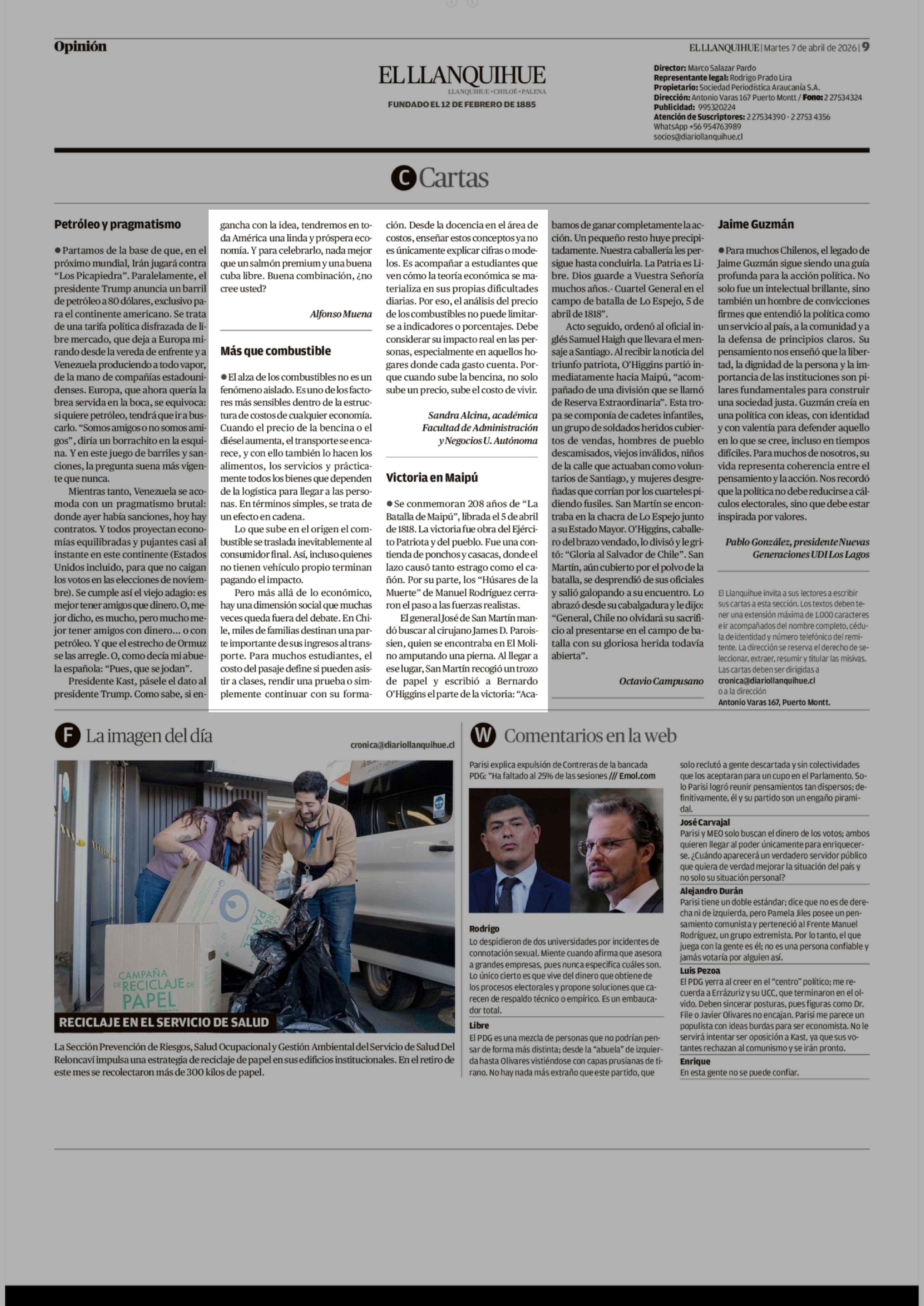 Cartas: Más que combustible 07-04-2026 El Llanquihue |