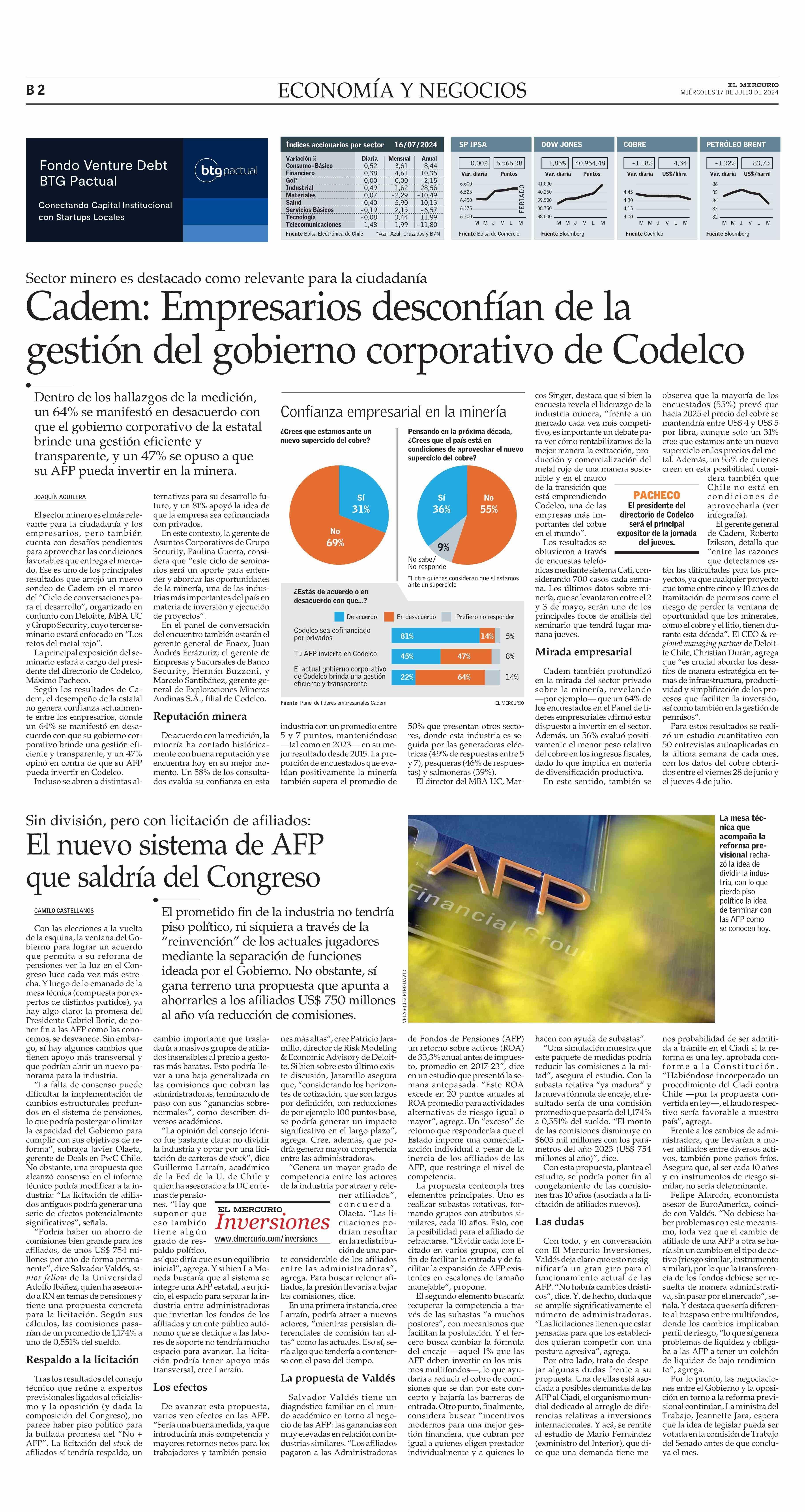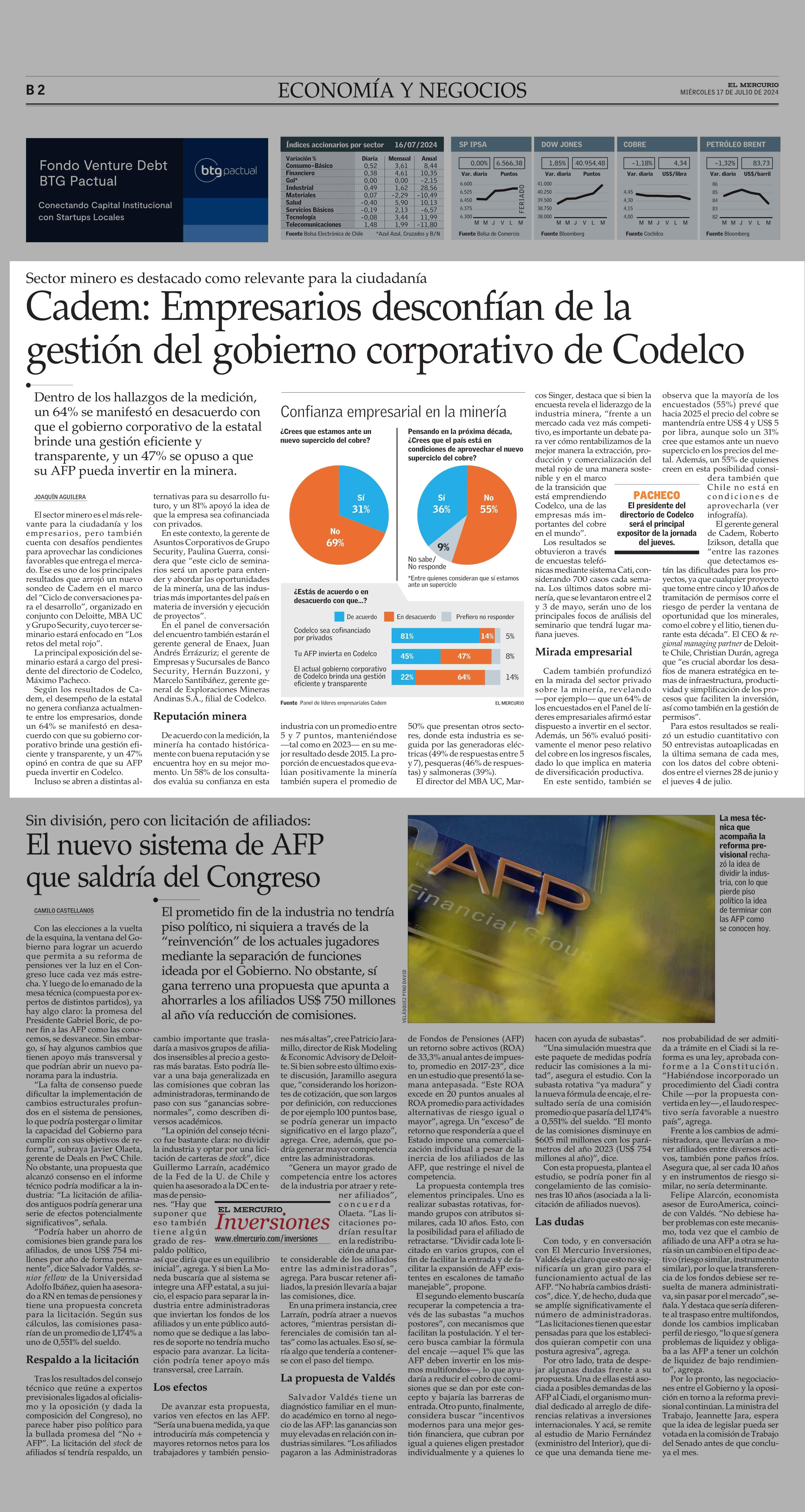 Cadem: Empresarios desconfían de la gestión del gobierno corporativo de Codelco 17-07-2024 El Mercurio |