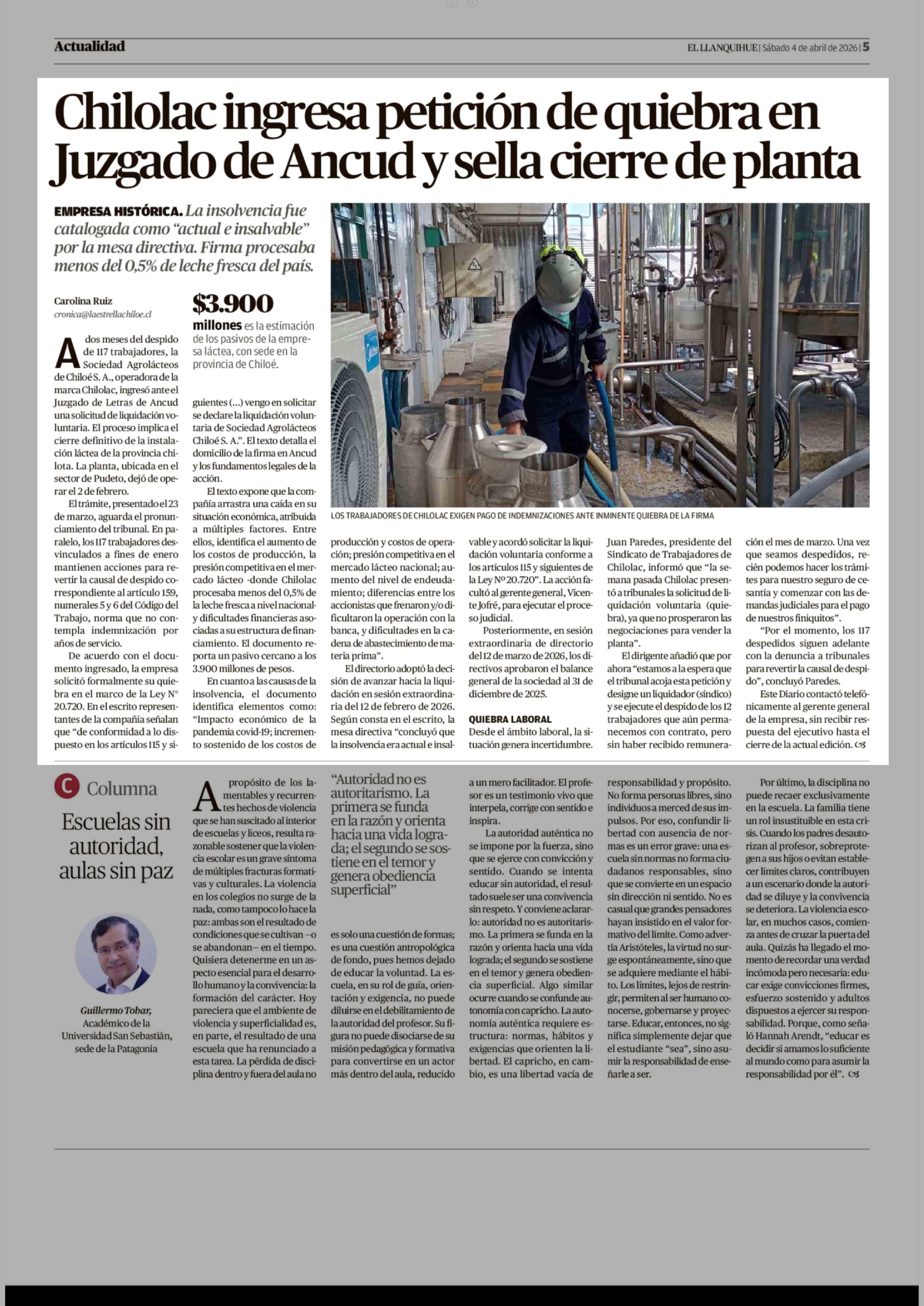 Chilolac ingresa petición de quiebra en Juzgado de Ancud y sella cierre de planta 04-04-2026 El Llanquihue |