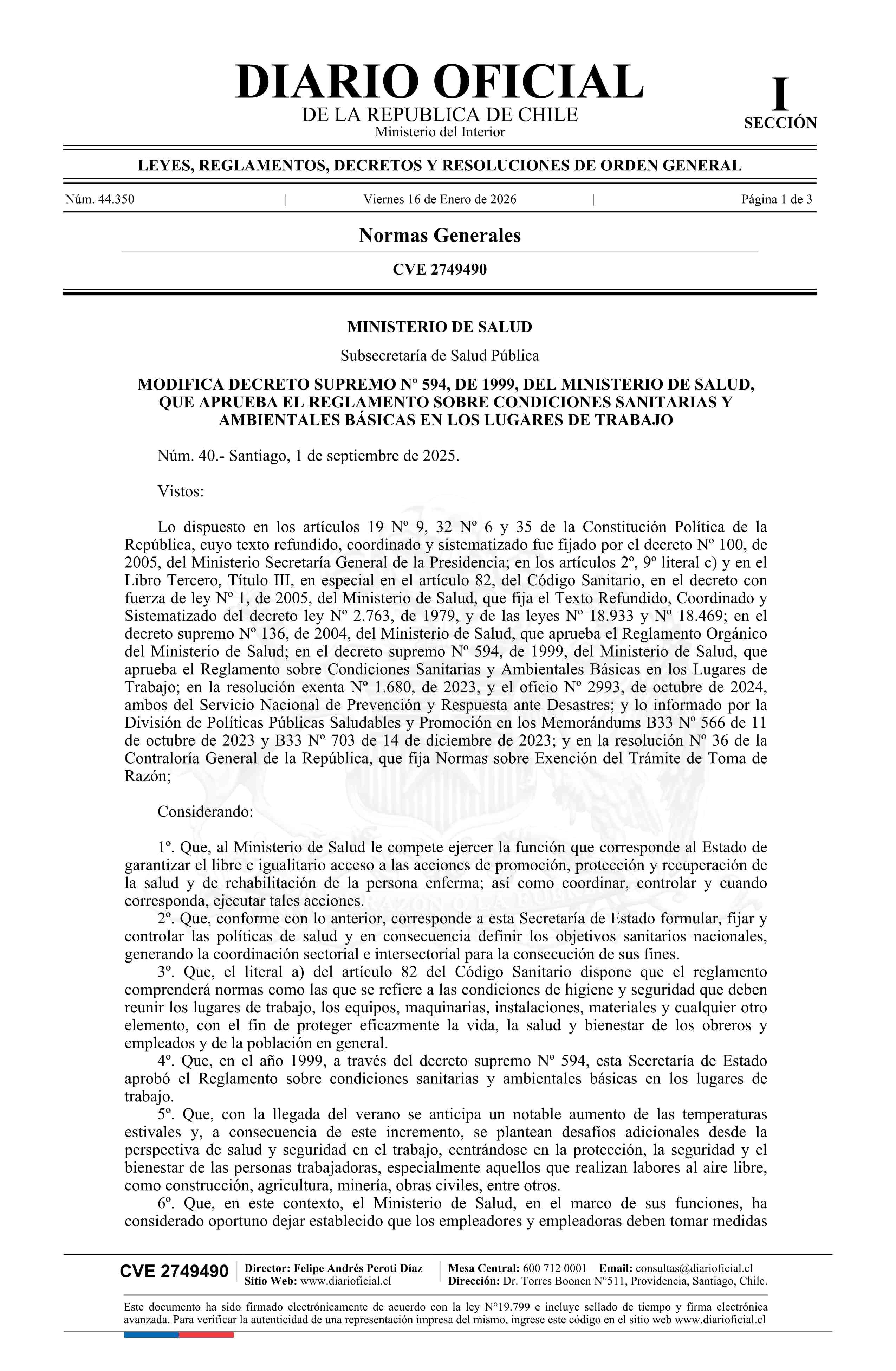 Decreto número 40, de 2025.- Modifica decreto Nº 594, de 1999, que aprueba el Reglamento sobre condiciones sanitarias y ambientales básicas en los lugares de trabajo 16-01-2026 Diario Oficial Edición Electrónica |