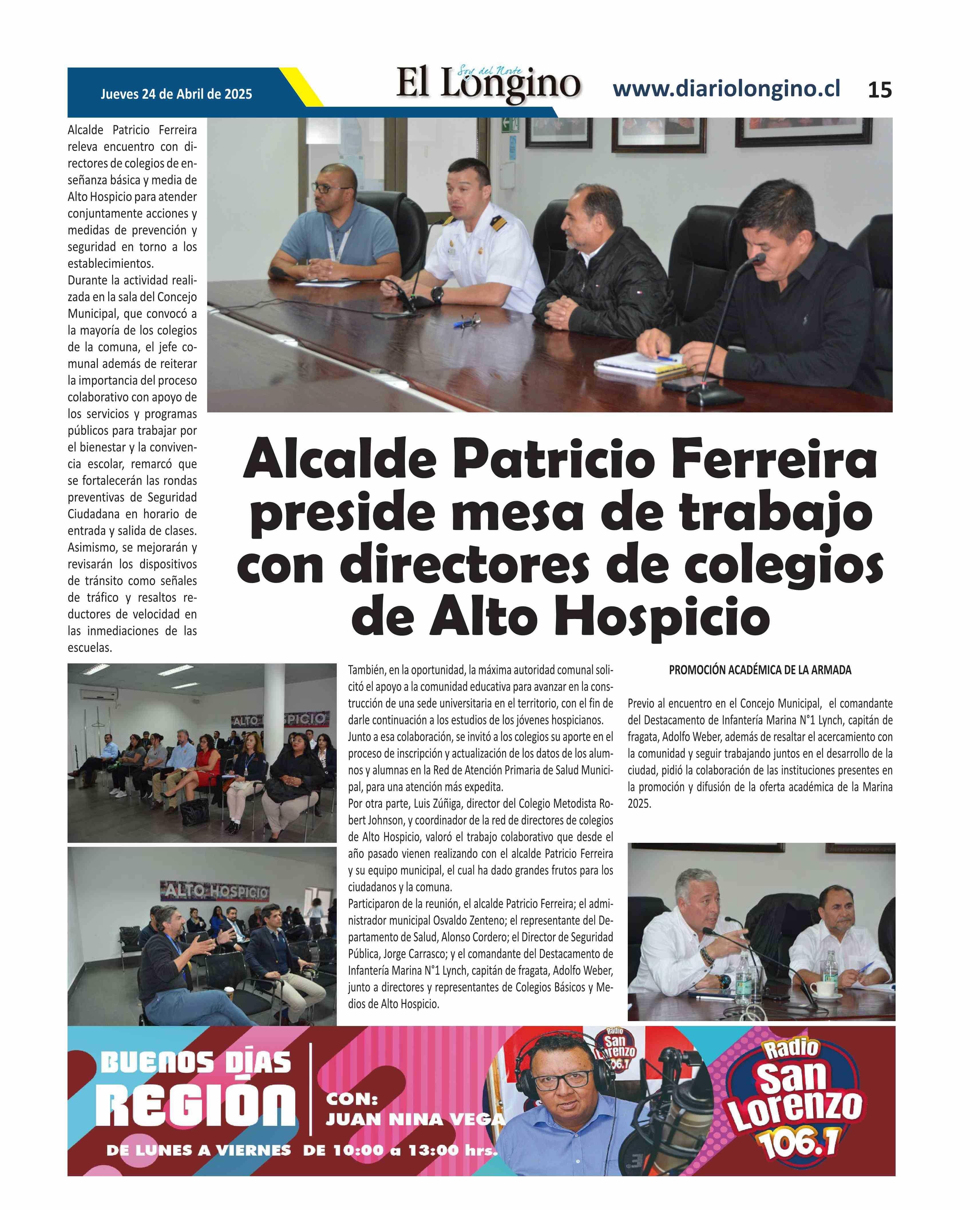 Alcalde Patricio Ferreira preside mesa de trabajo con directores de colegios de Alto Hospicio 24-04-2025 El Longino |