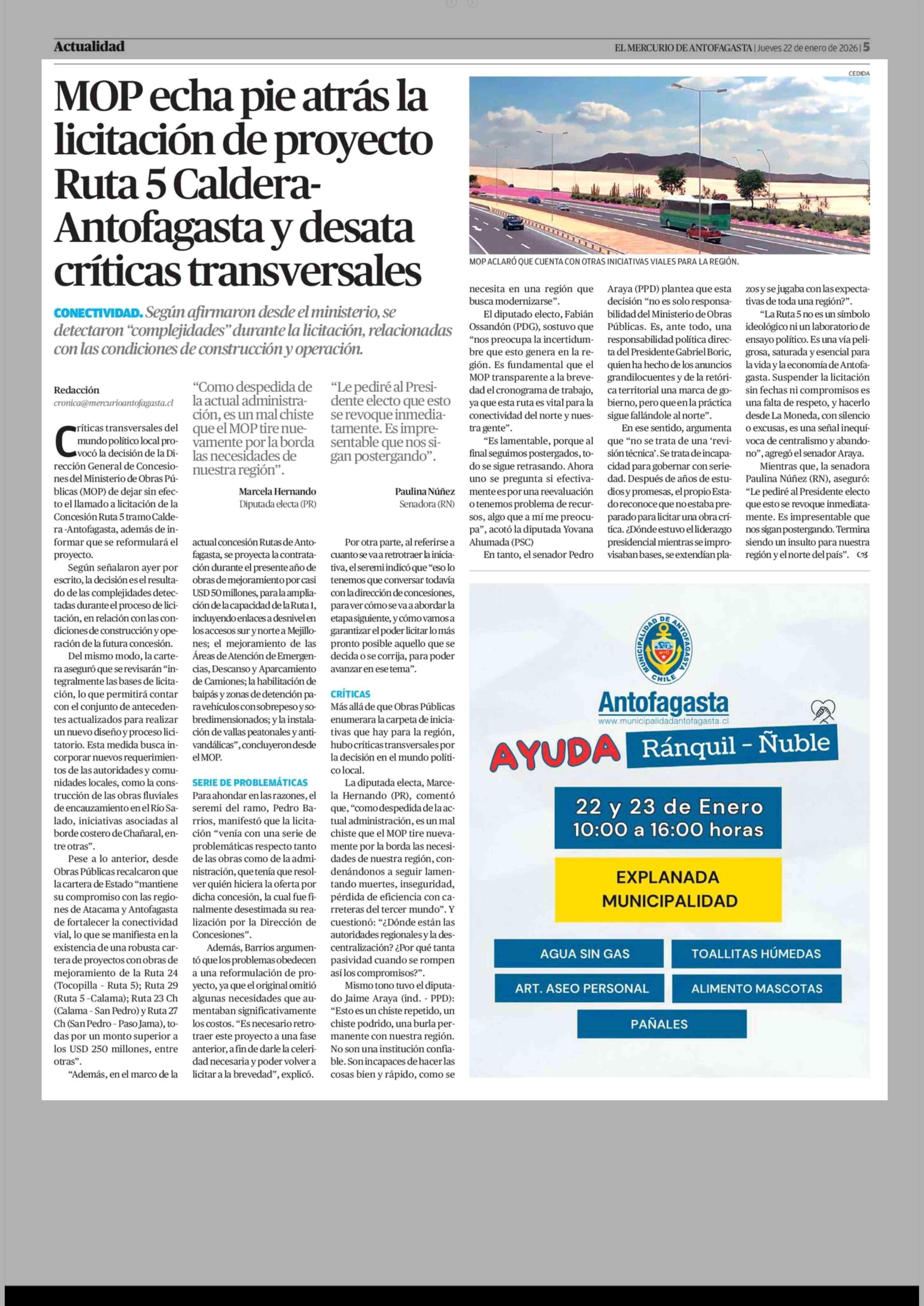 MOP echa pie atrás la licitación de proyecto Ruta 5 CalderaAntofagasta y desata críticas transversales 22-01-2026 El Mercurio de Antofagasta |
