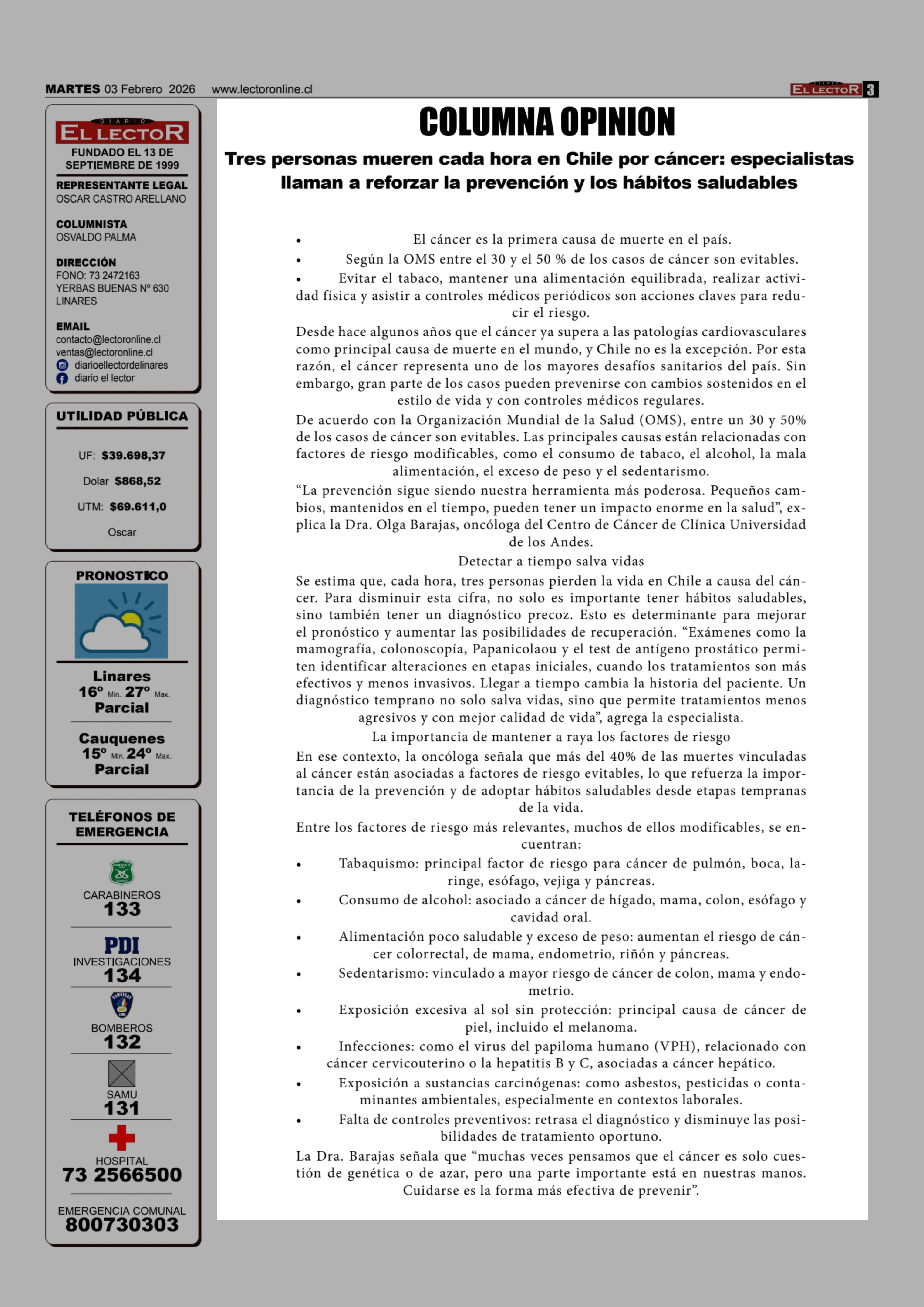 Título: Columnas de Opinión: Tres personas mueren cada hora en Chile por cancer: especialistas llaman a reforzar la prevención y los hábitos saludables