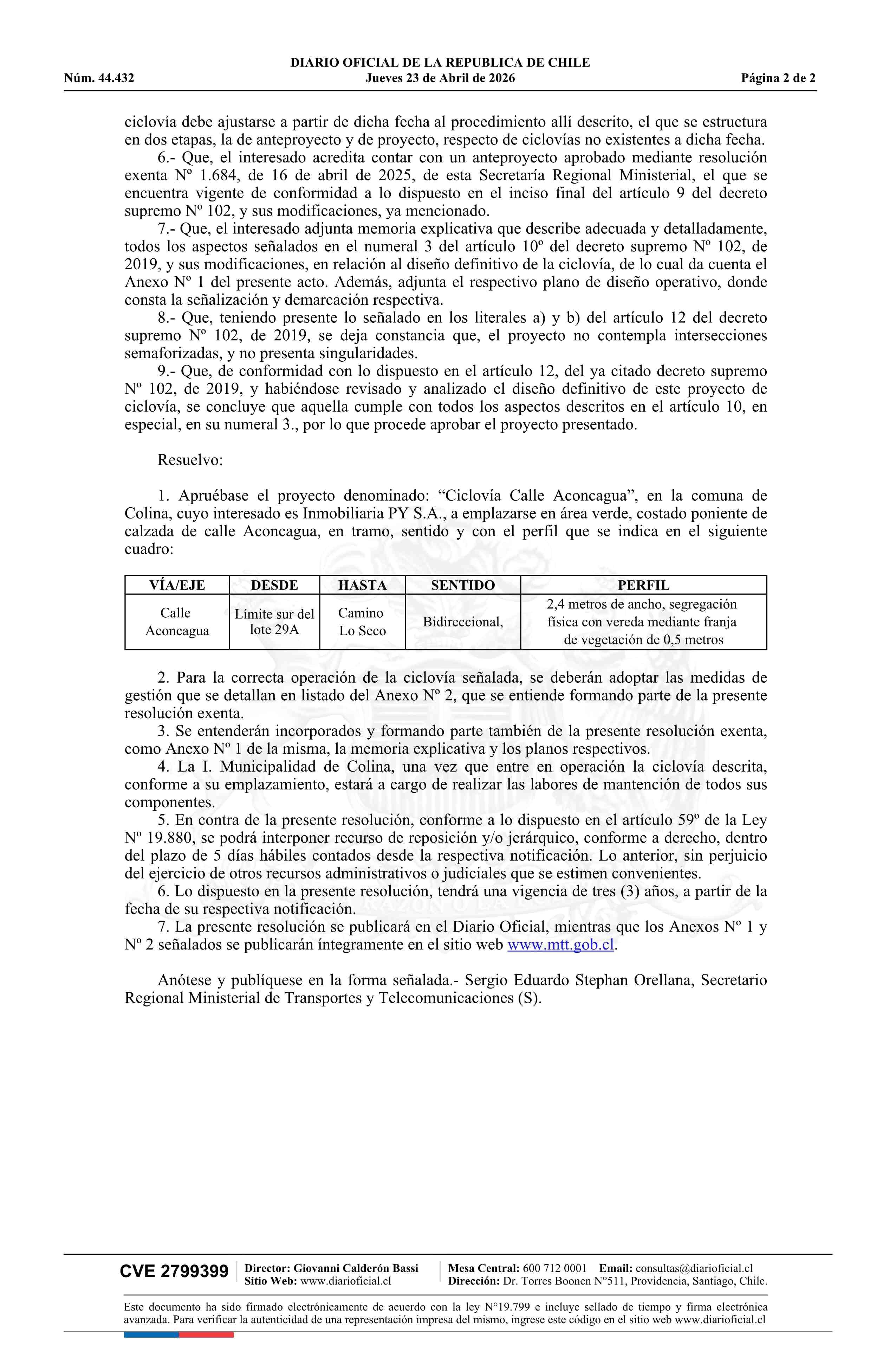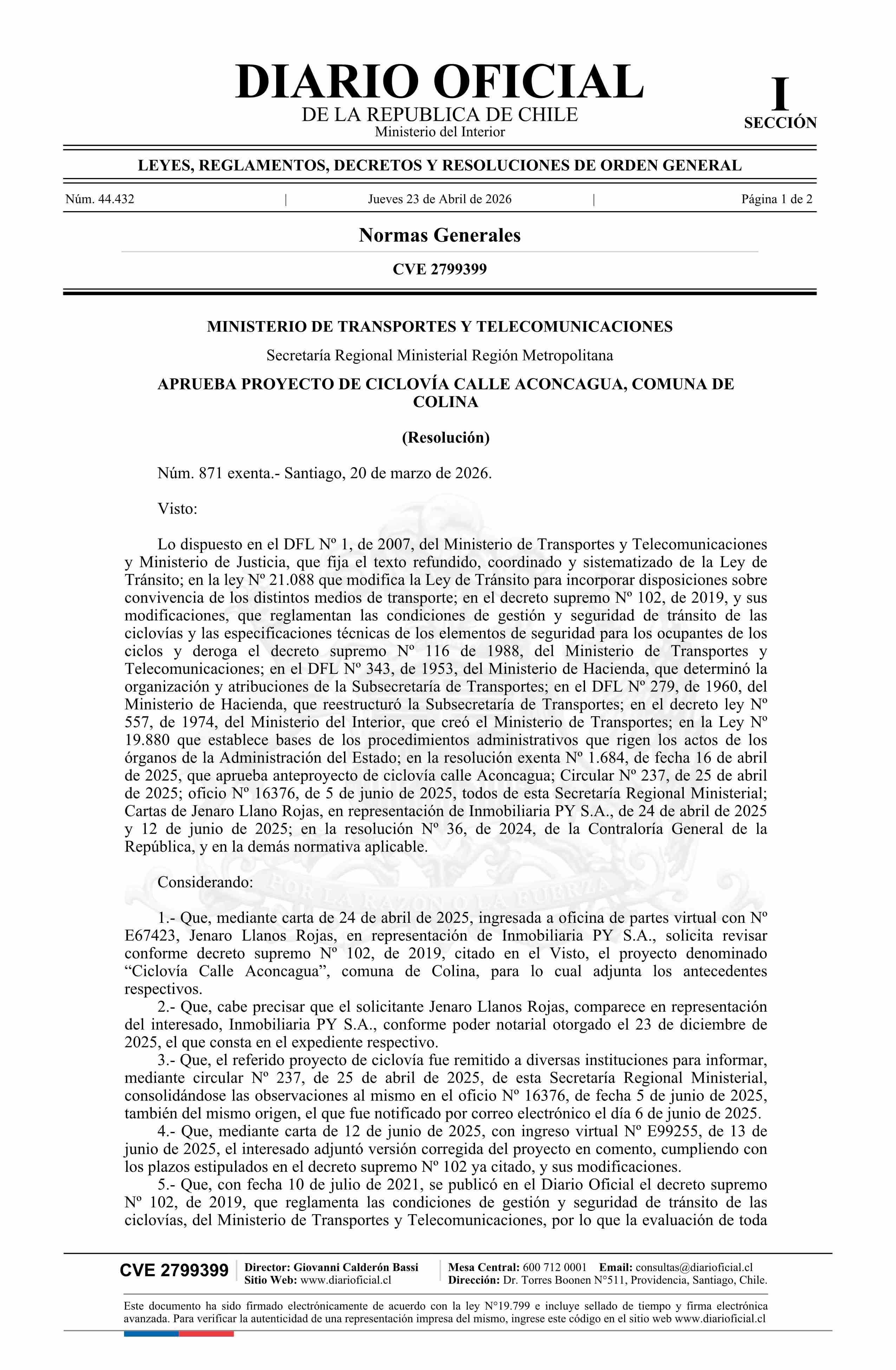 Resolución exenta número 871, de 2026.- Aprueba proyecto de Ciclovía Calle Aconcagua, comuna de Colina 23-04-2026 Diario Oficial Edición Electrónica |