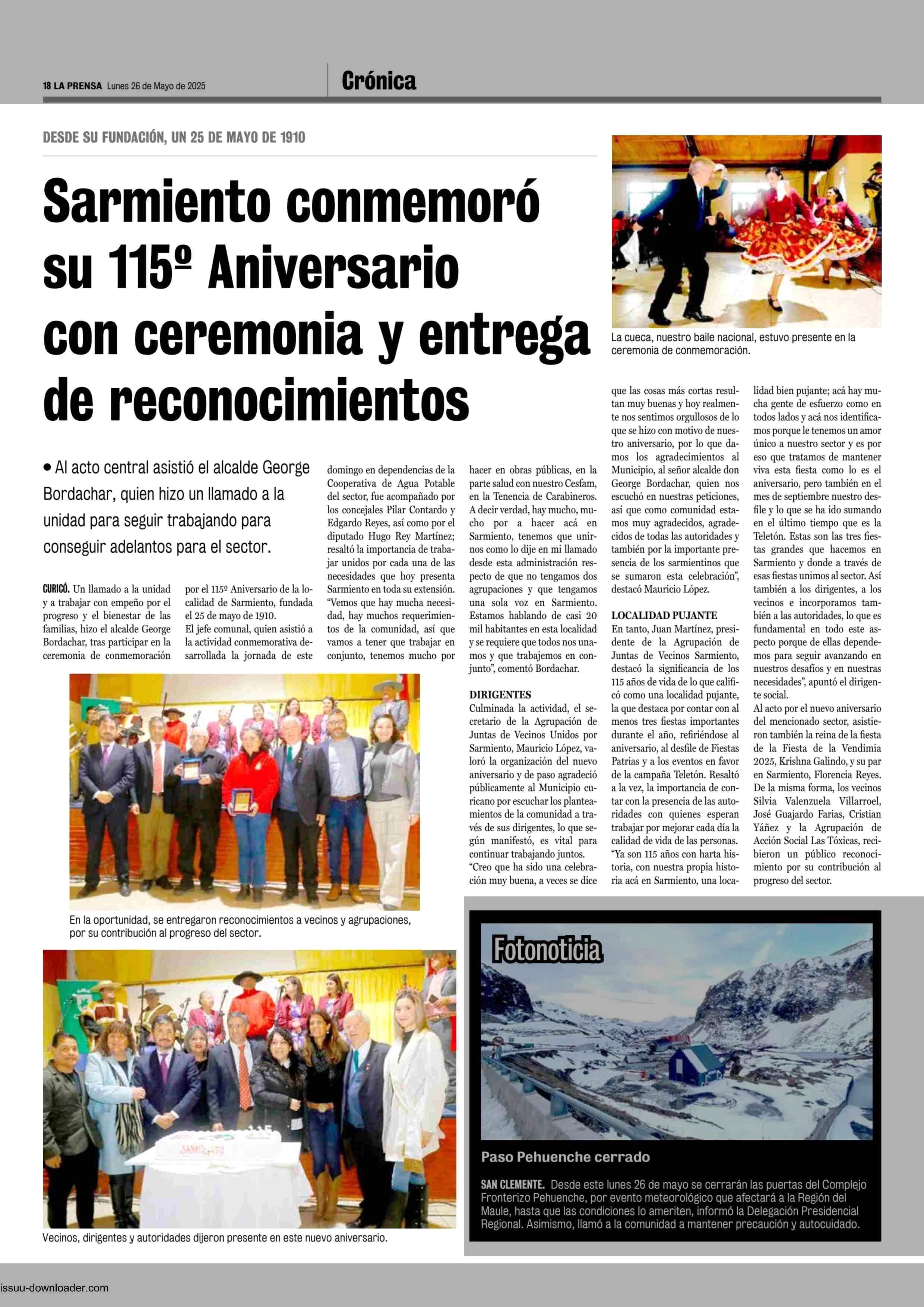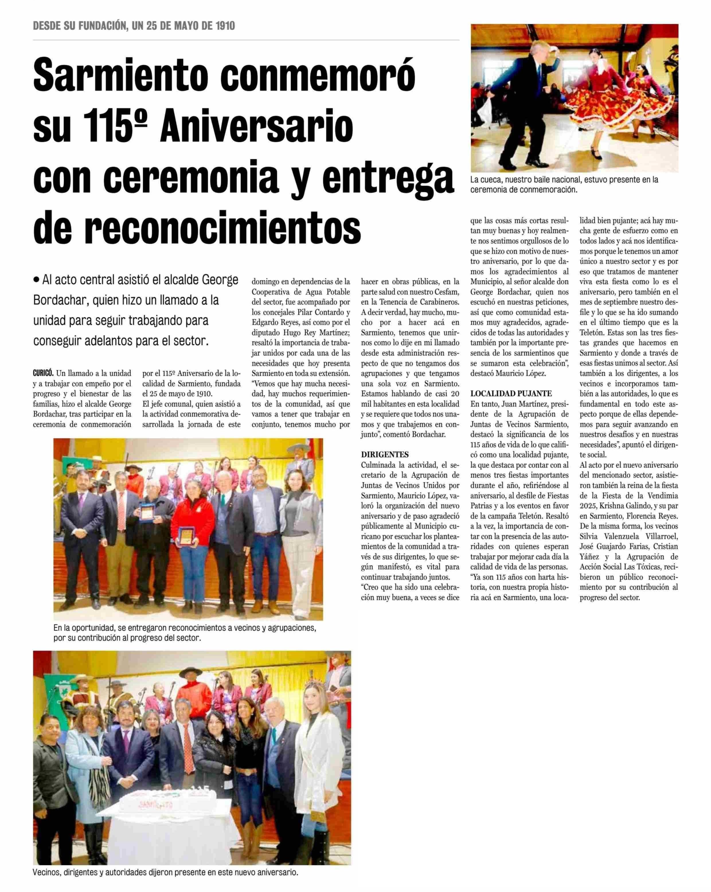 Sarmiento conmemoró su 115? Aniversario con ceremonia y entrega de reconocimientos 26-05-2025 La Prensa de Curicó |
