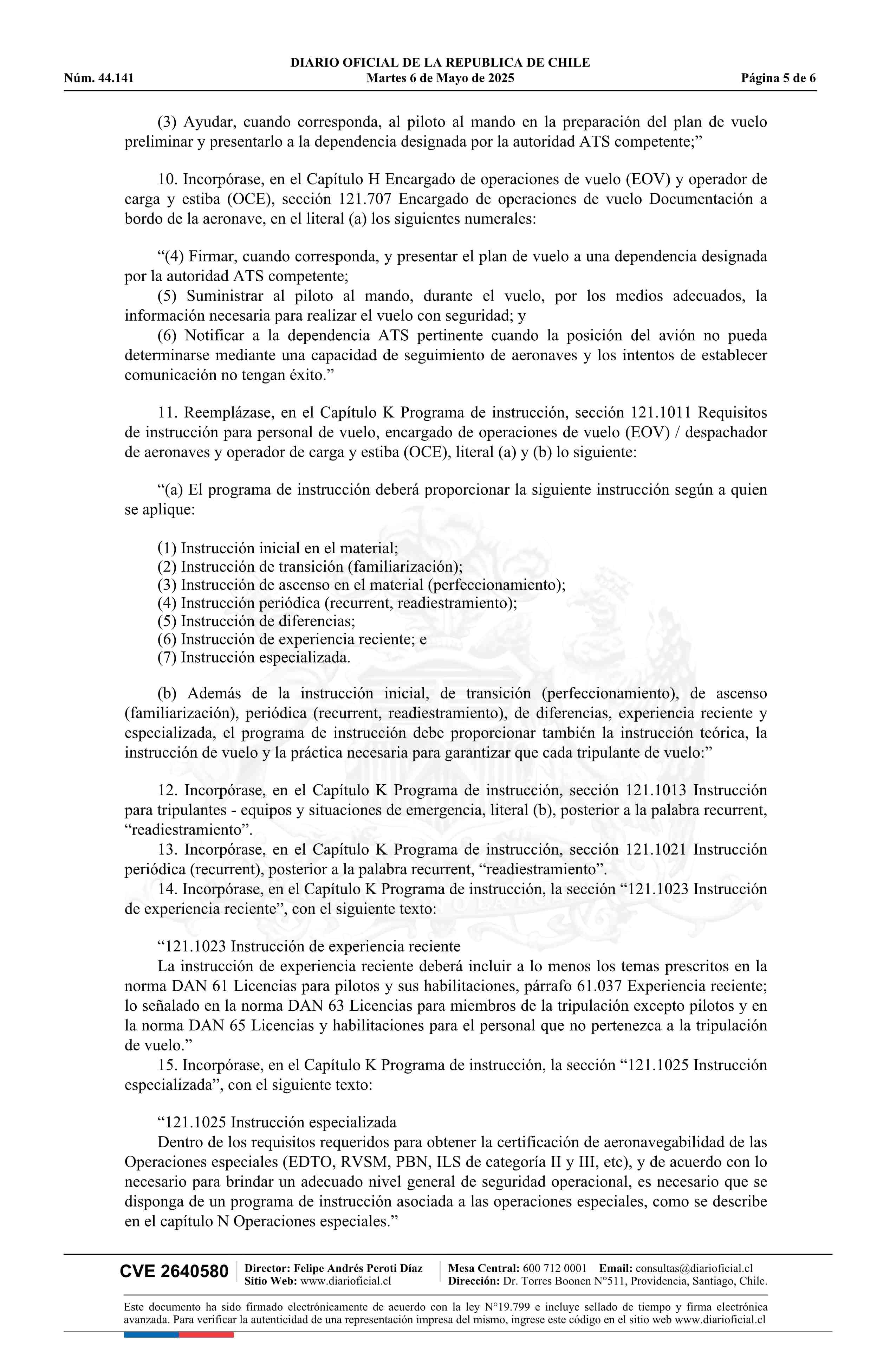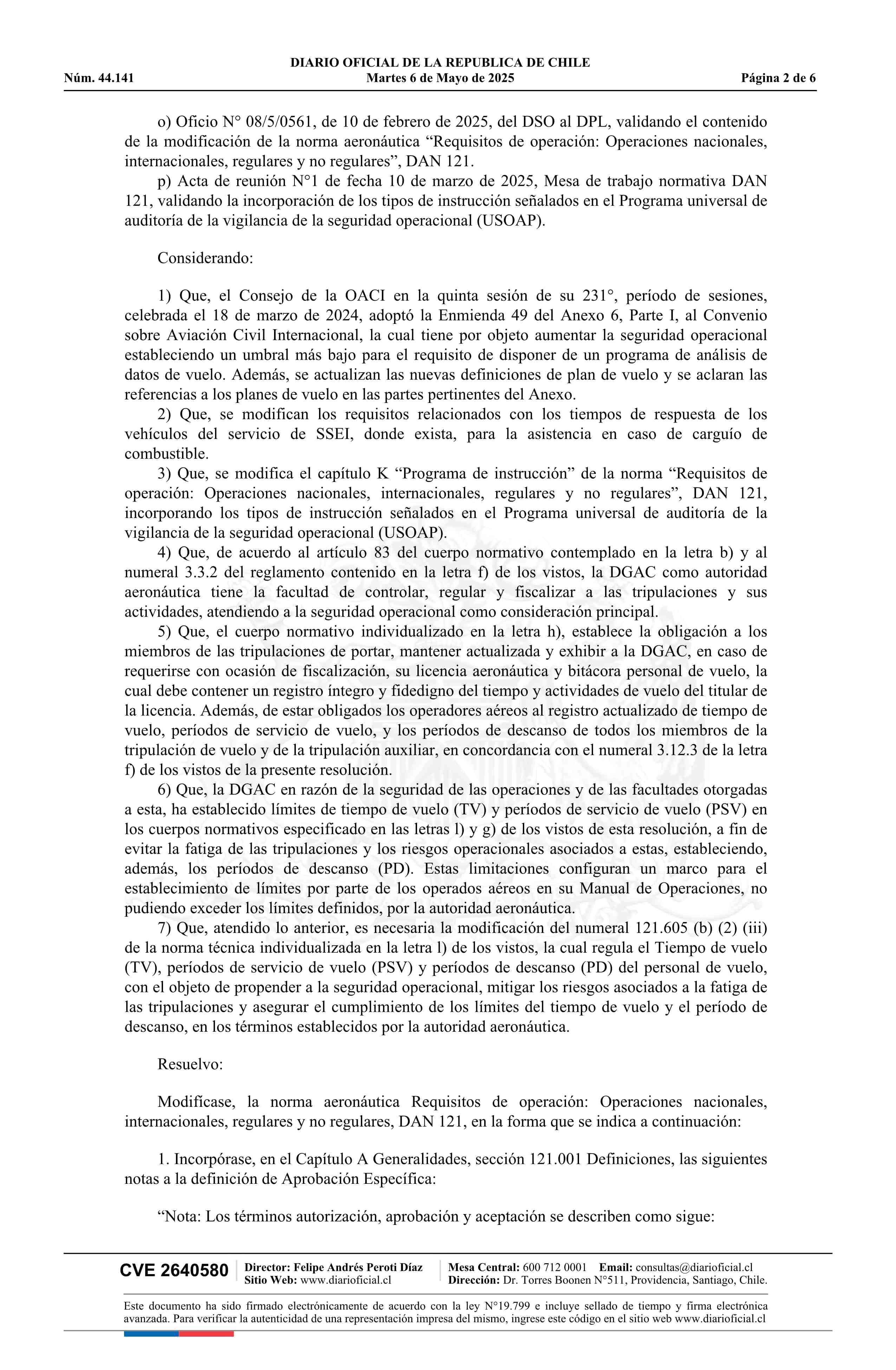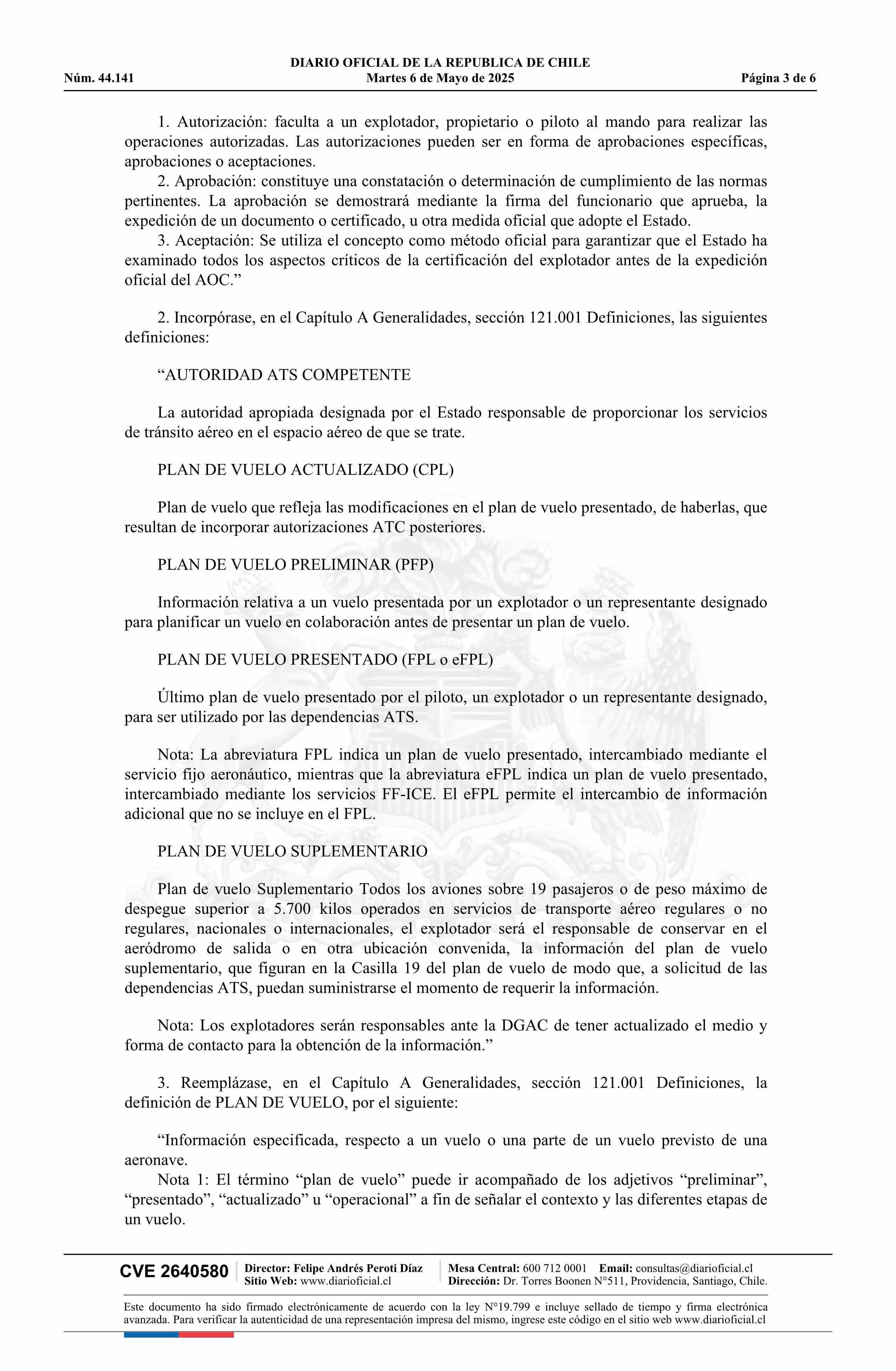 Resolución exenta número 04/3/0053/0690, de 2025.- Modifica Norma Aeronáutica Requisitos de operación: Operaciones nacionales, internacionales, regulares y no regulares - DAN 121 06-05-2025 DIARIO OFICIAL CHILE - BOLETÍN OFICIAL DE MINERÍA |