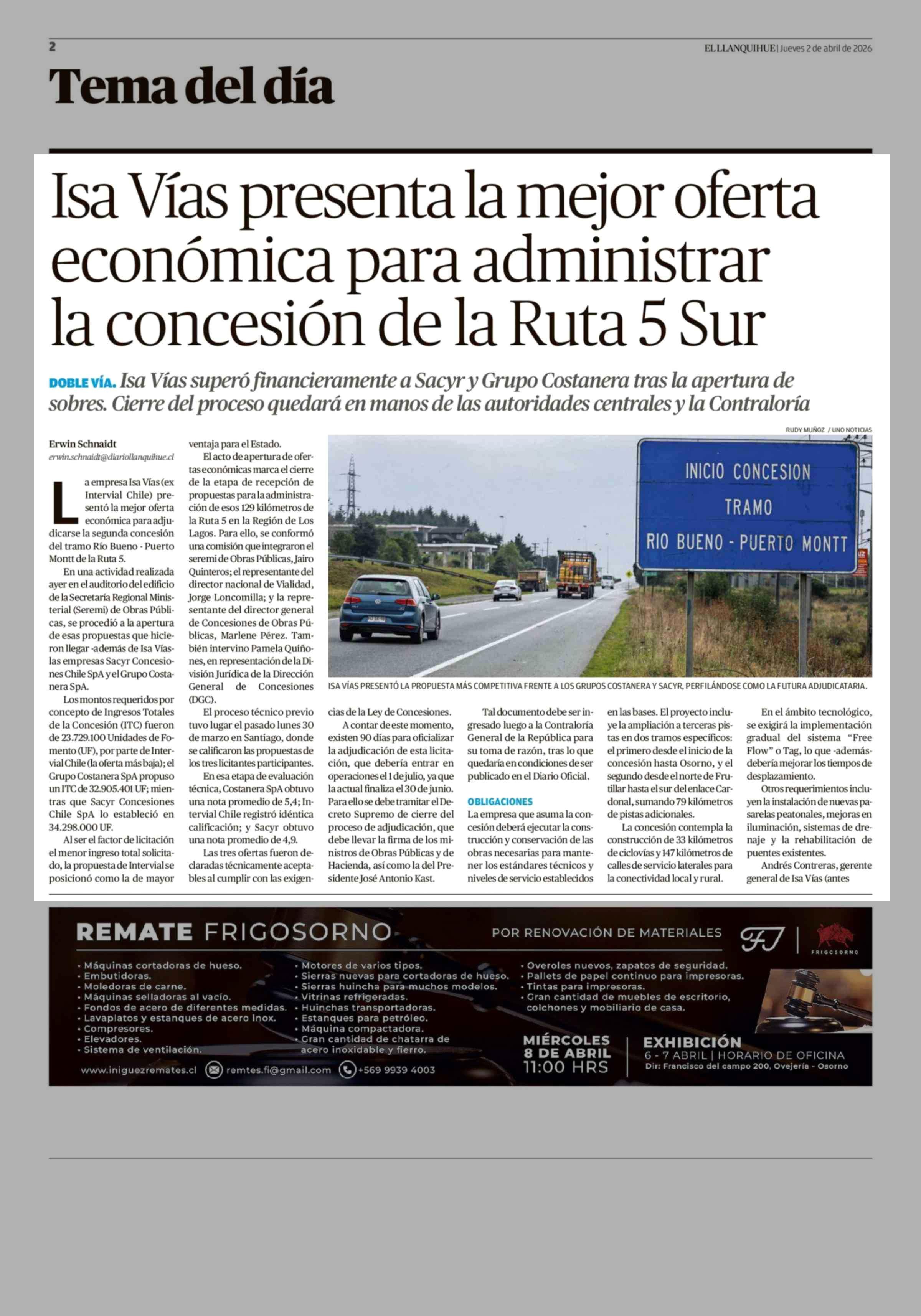 Título: Isa Vías presenta la mejor oferta económica para administrar la concesión de la Ruta 5 Sur
