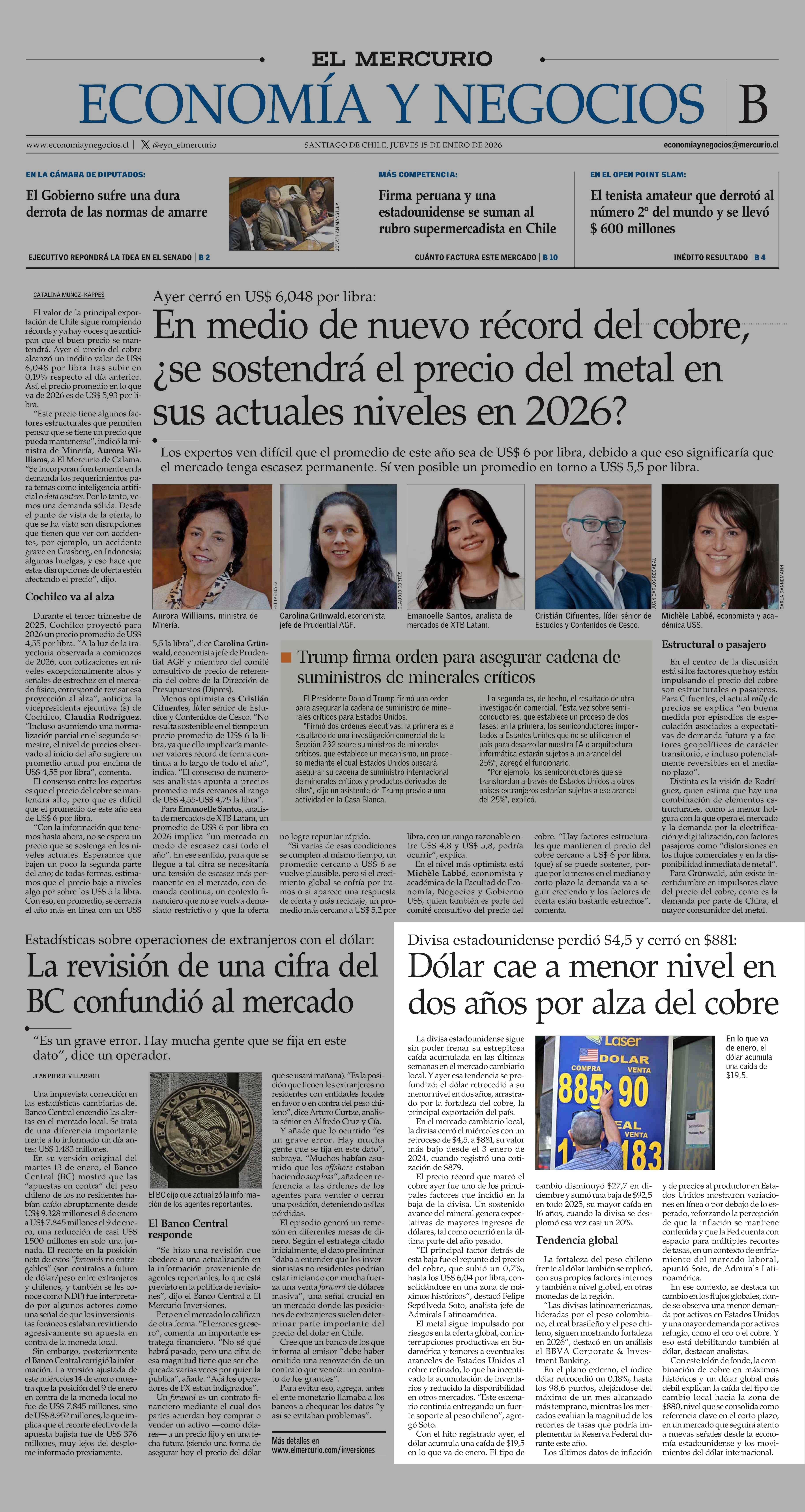 Dólar cae a menor nivel en dos años por alza del cobre 15-01-2026 El Mercurio |