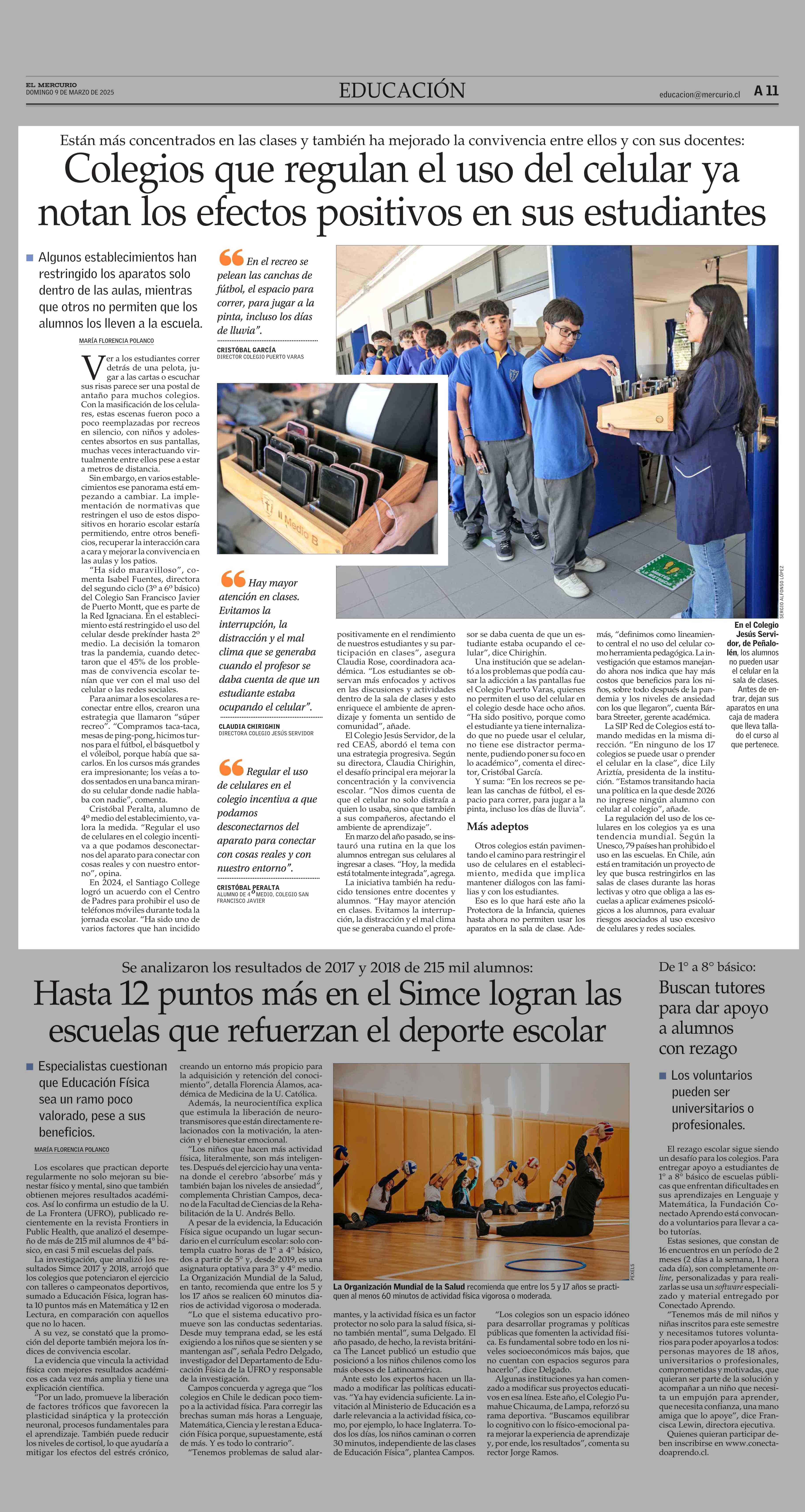 Colegios que regulan el uso del celular ya notan los efectos positivos en sus estudiantes 09-03-2025 El Mercurio |