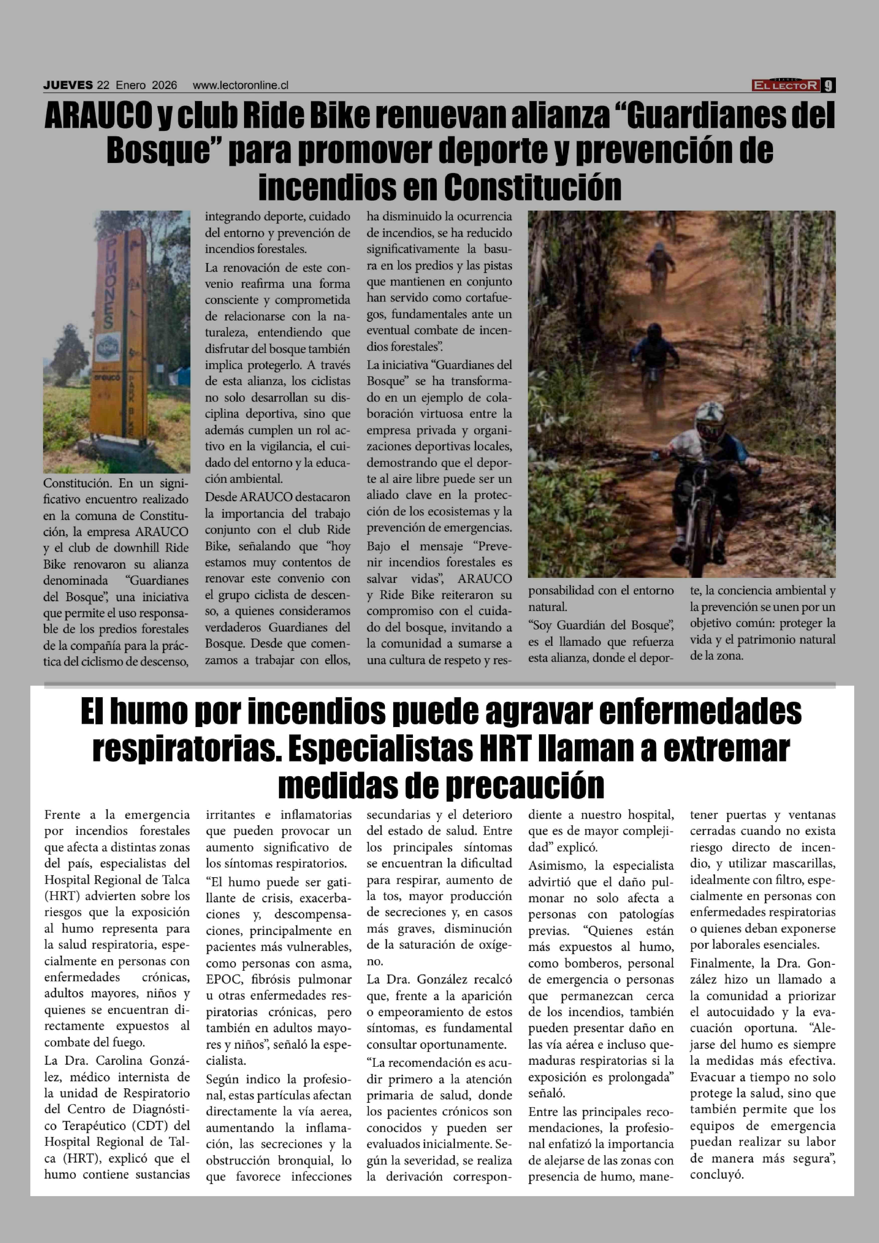 El humo por incendios puede agravar enfermedades respiratorias. Especialistas HRT llaman a extremar medidas de precaución 22-01-2026 El Lector |
