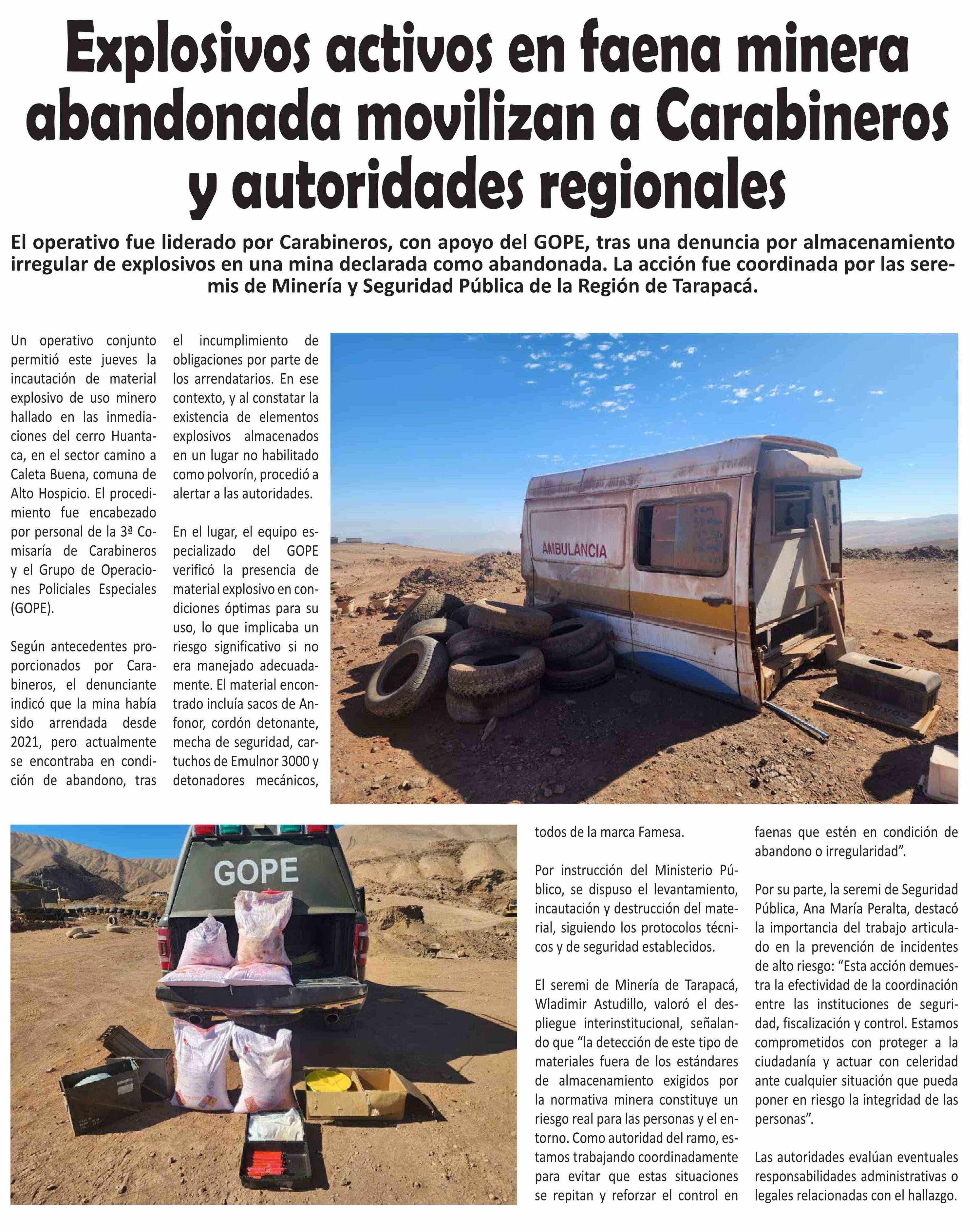 | Título: | Explosivos activos en faena minera abandonada movilizan a Carabineros y autoridades regionales |