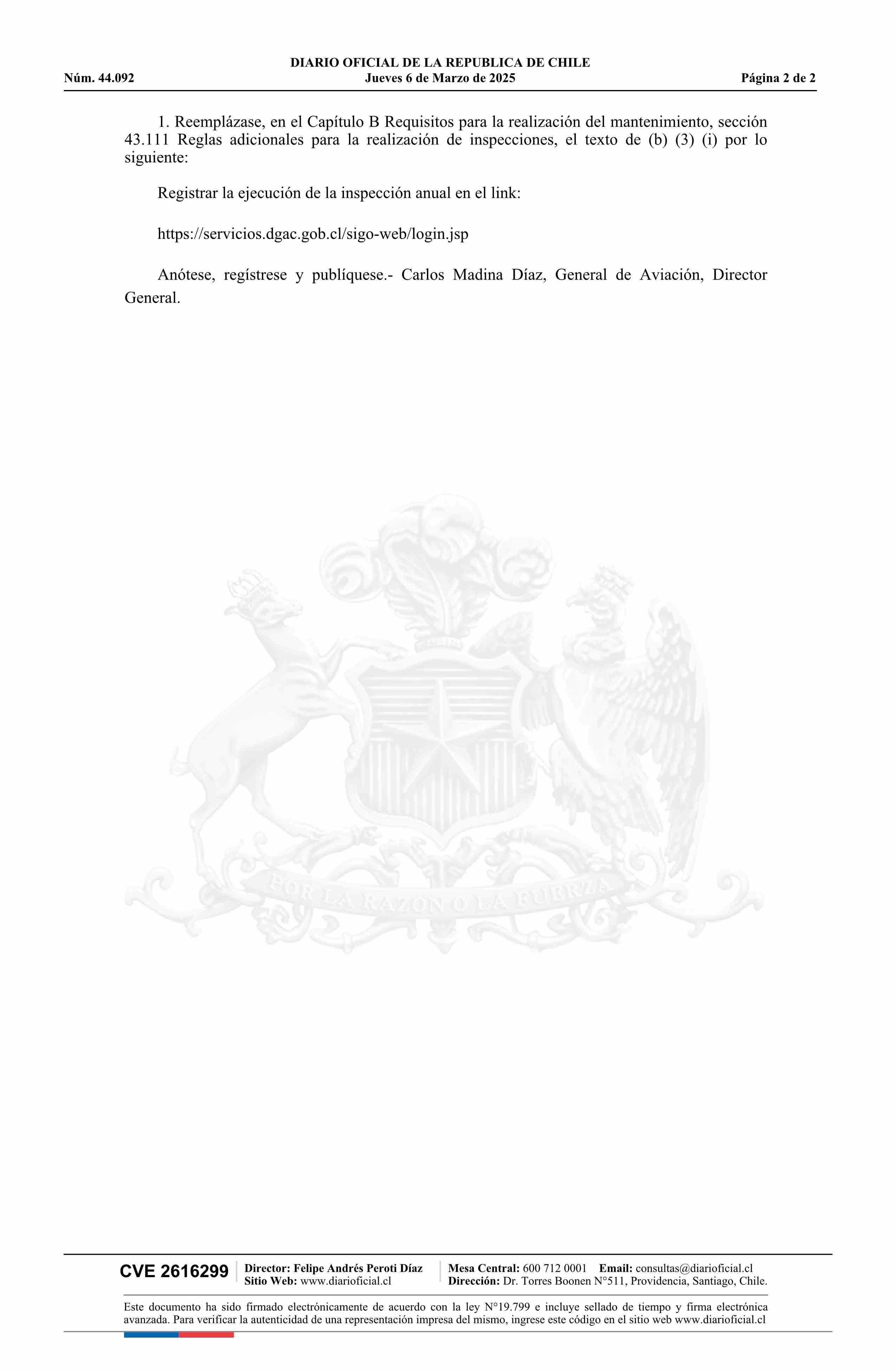 | Título: | Resolución exenta número 04/3/0177/2360, de 2024.- Modifica la Norma Aeronáutica Mantenimiento, DAN 43 |