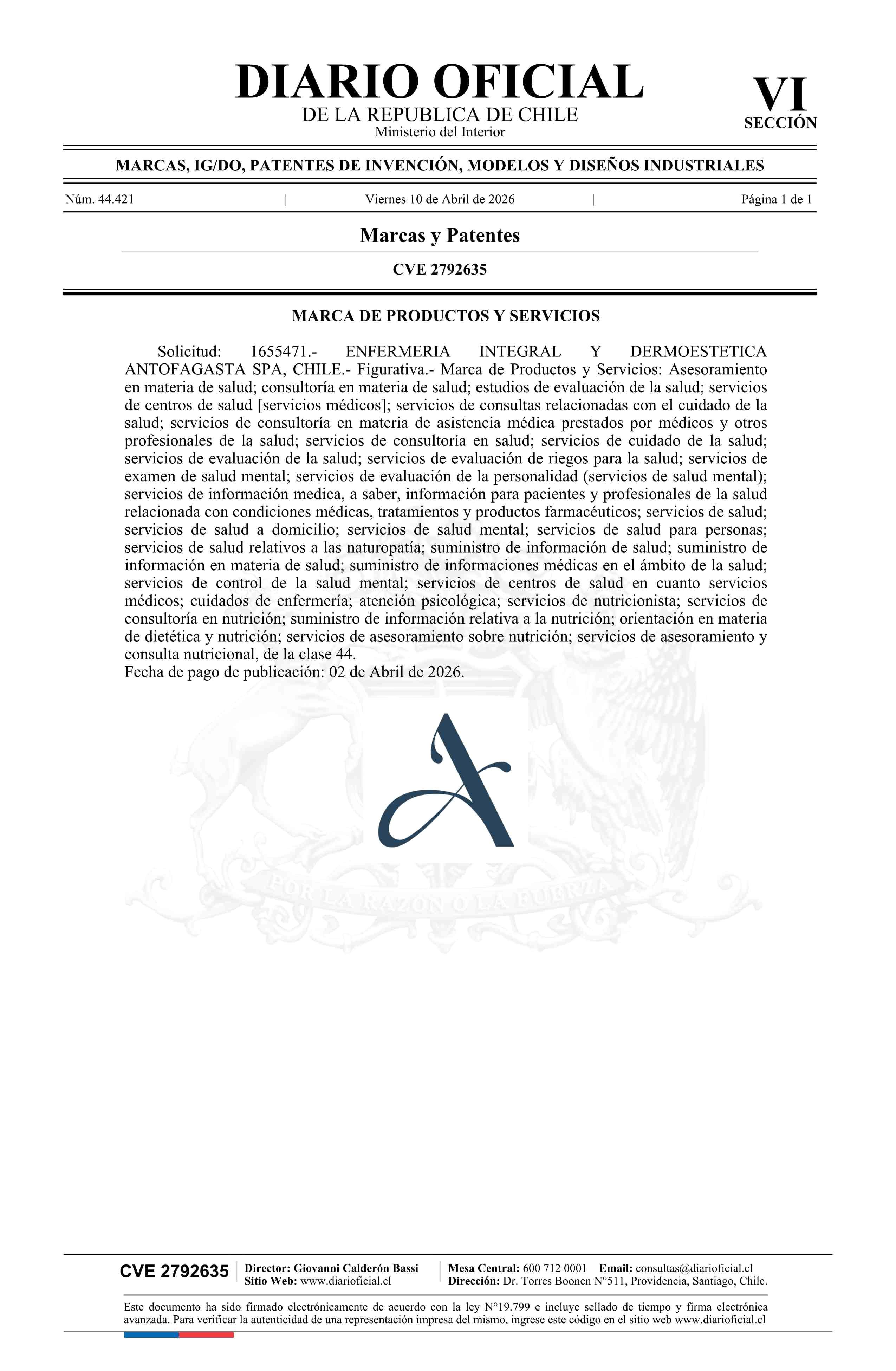 Solicitud número 1655471.- ENFERMERIA INTEGRAL Y DERMOESTETICA ANTOFAGASTA SPA 10-04-2026 Diario Oficial Edición Electrónica |