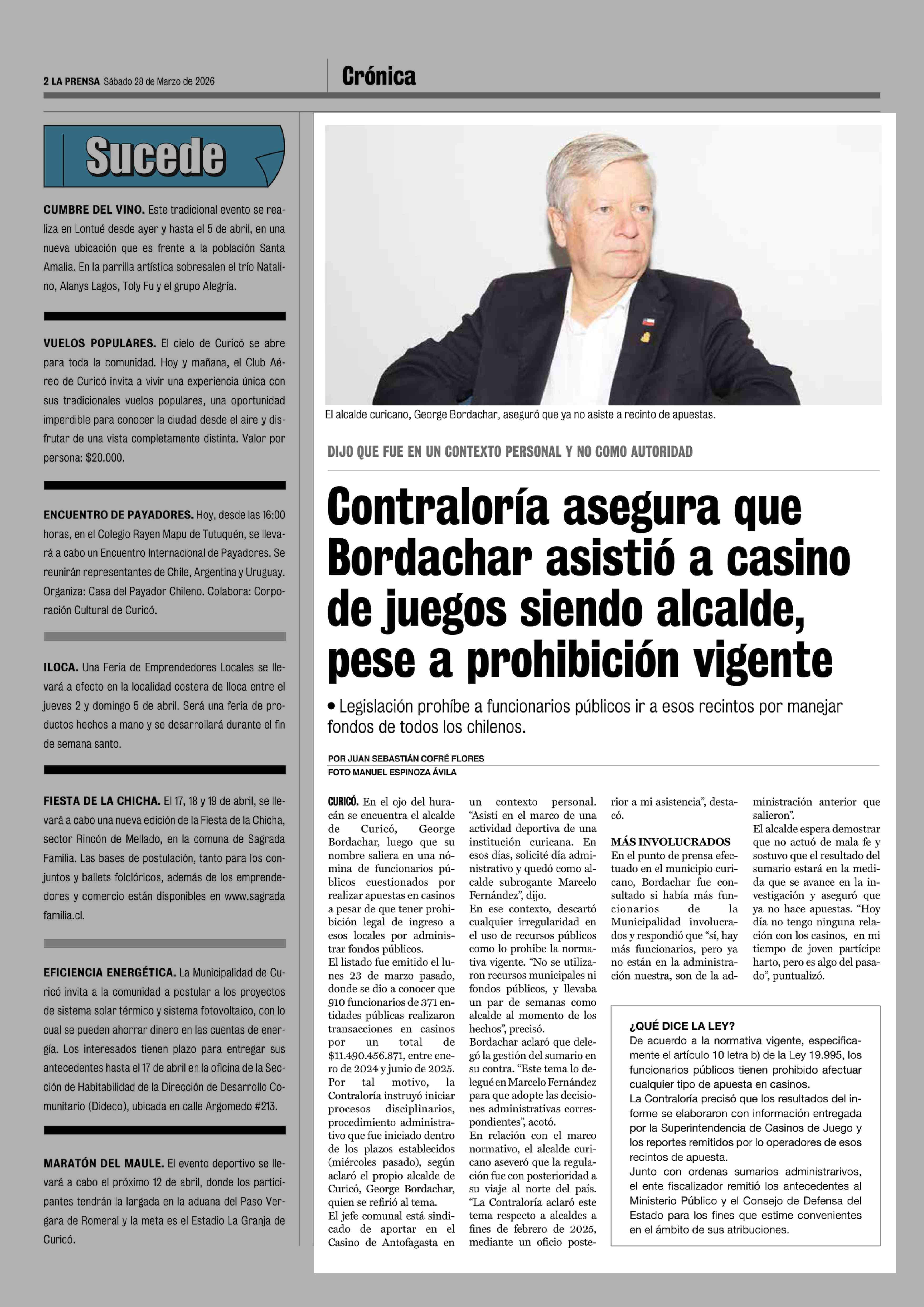 Contraloría asegura que Bordachar asistió a casino de juegos siendo alcalde, pese a prohibición vigente 28-03-2026 La Prensa de Curicó |