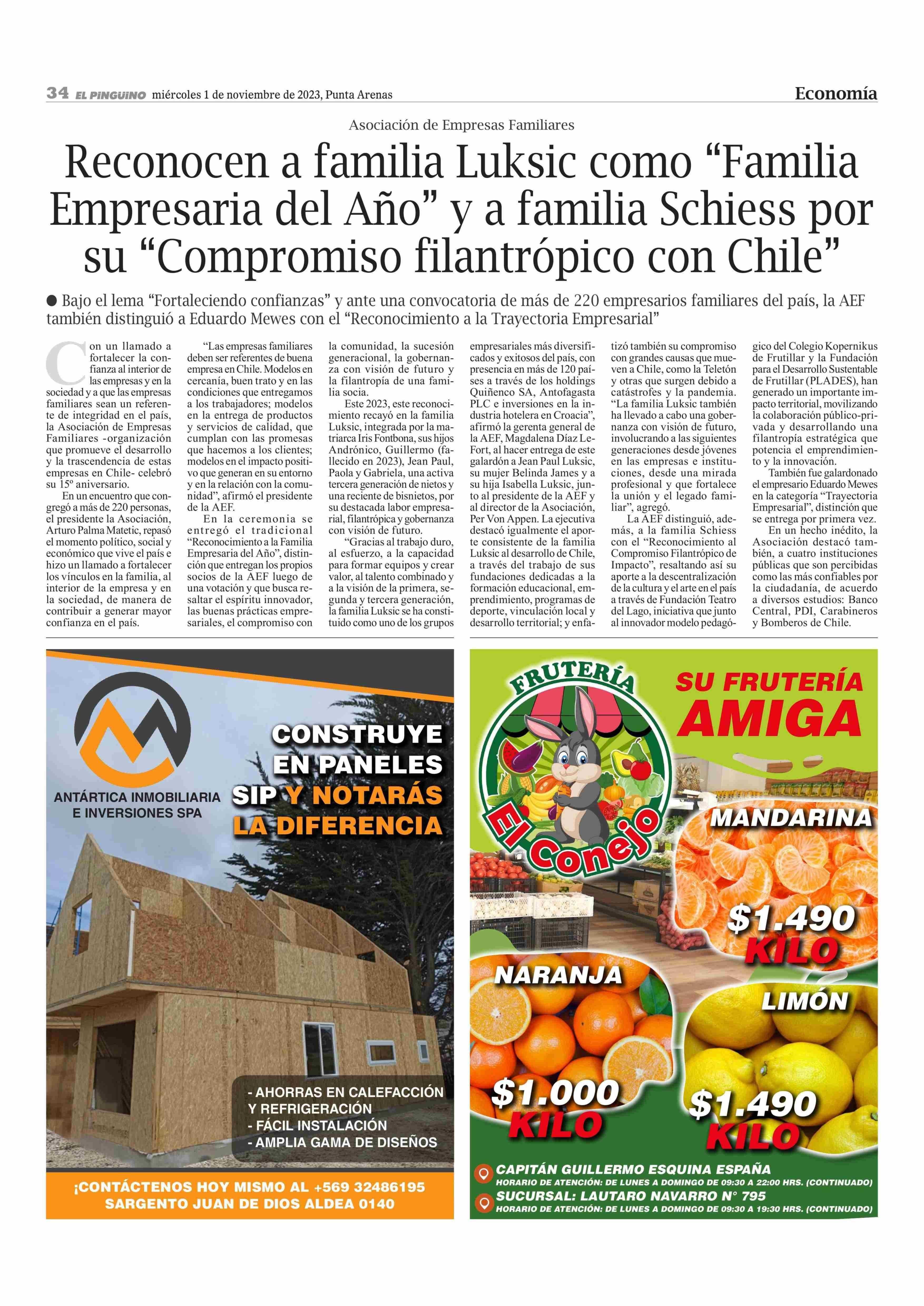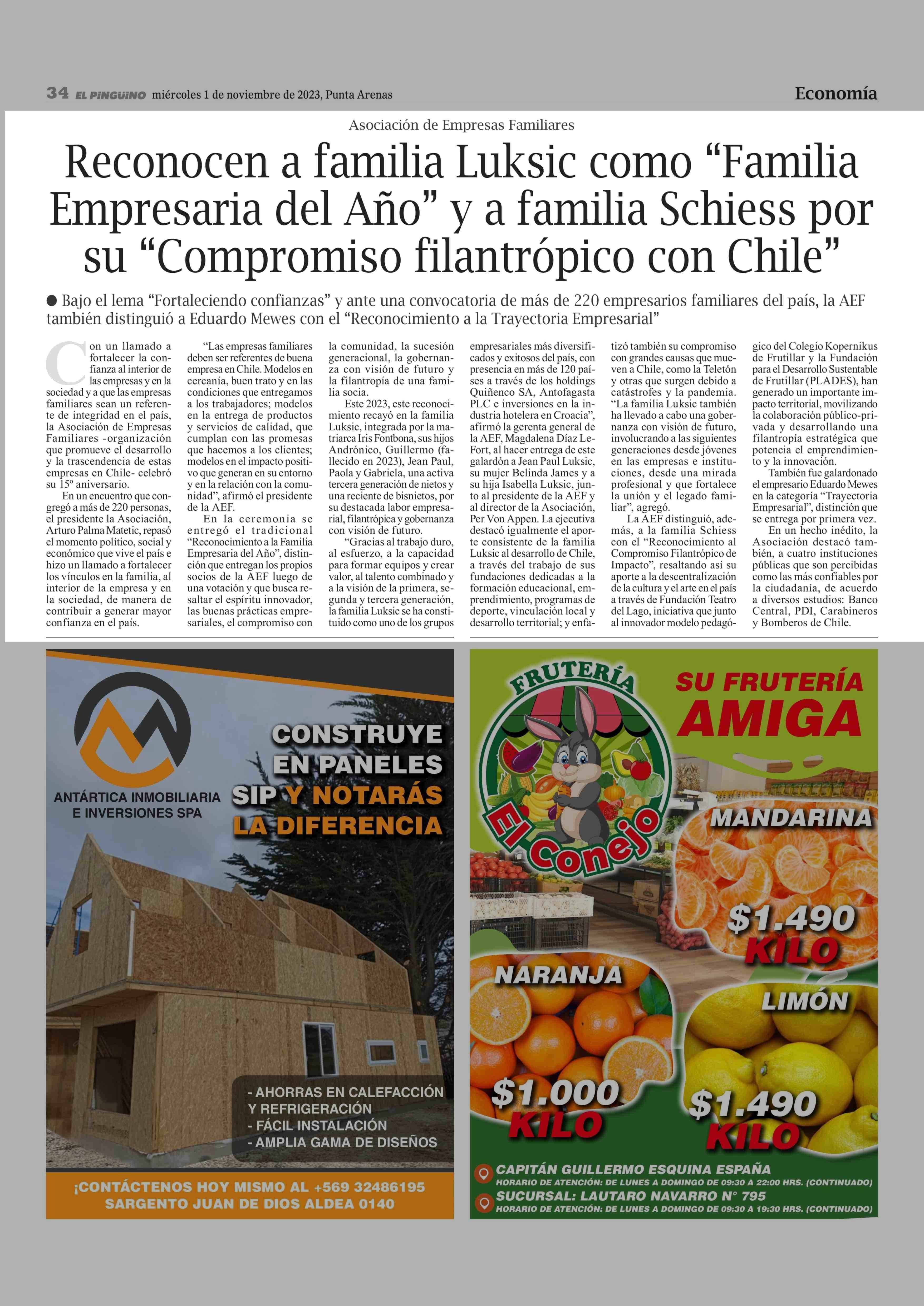 Reconocen a familia Luksic como “Familia Empresaria del Año” y a familia Schiess por su “Compromiso filantrópico con Chile” 01-11-2023 El Pingüino |