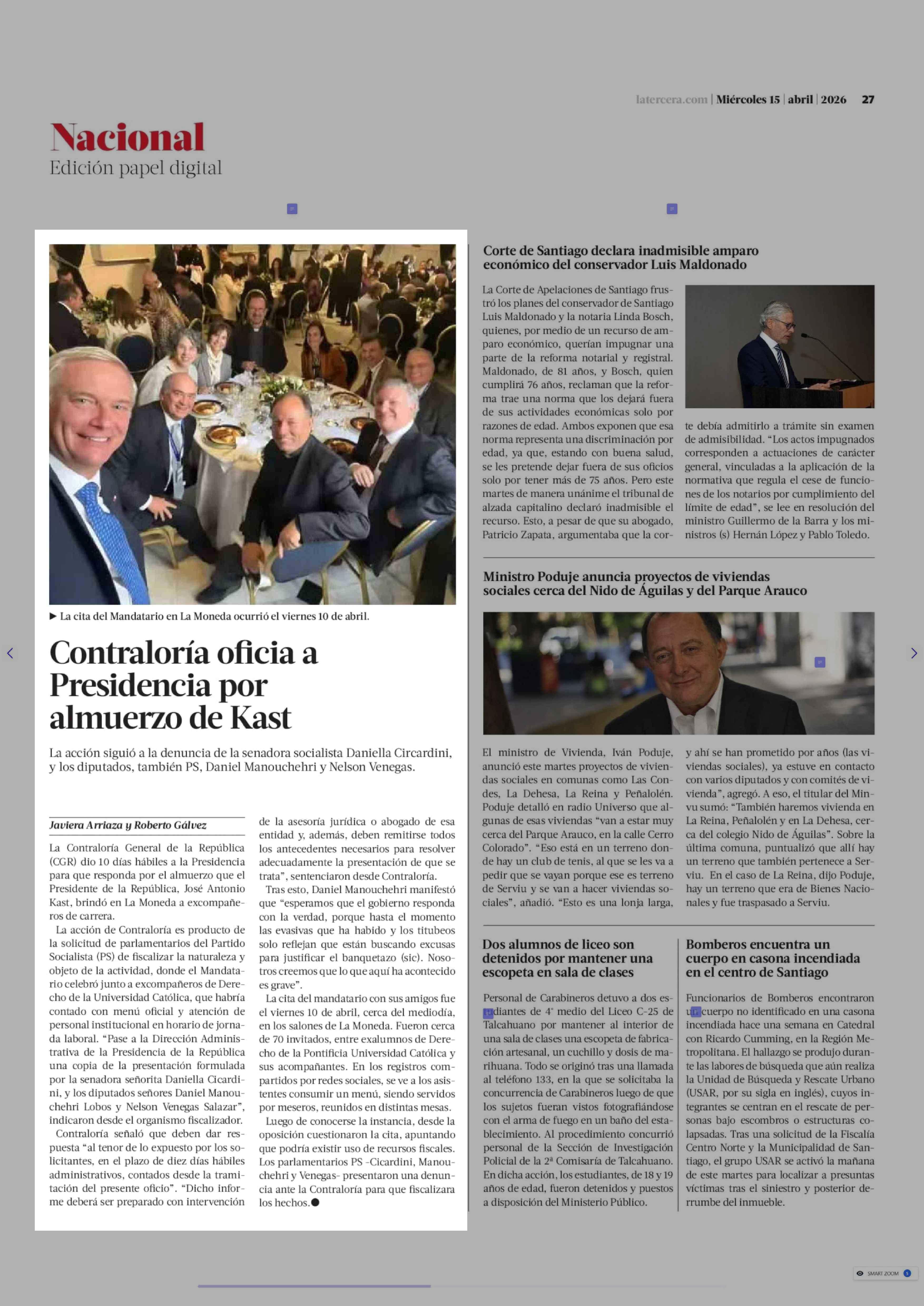 Contraloría oficia a Presidencia por almuerzo de Kast 15-04-2026 La Tercera |