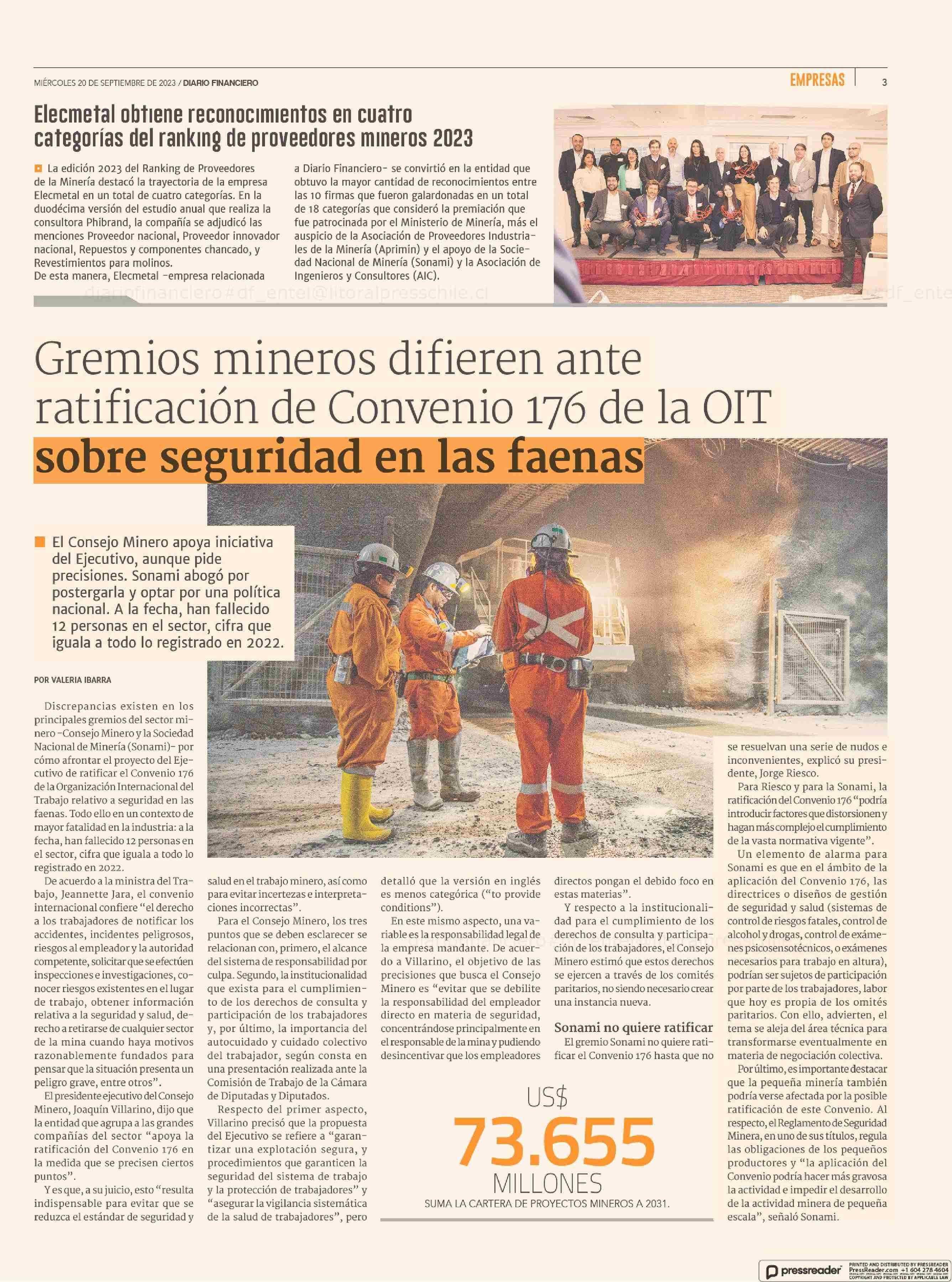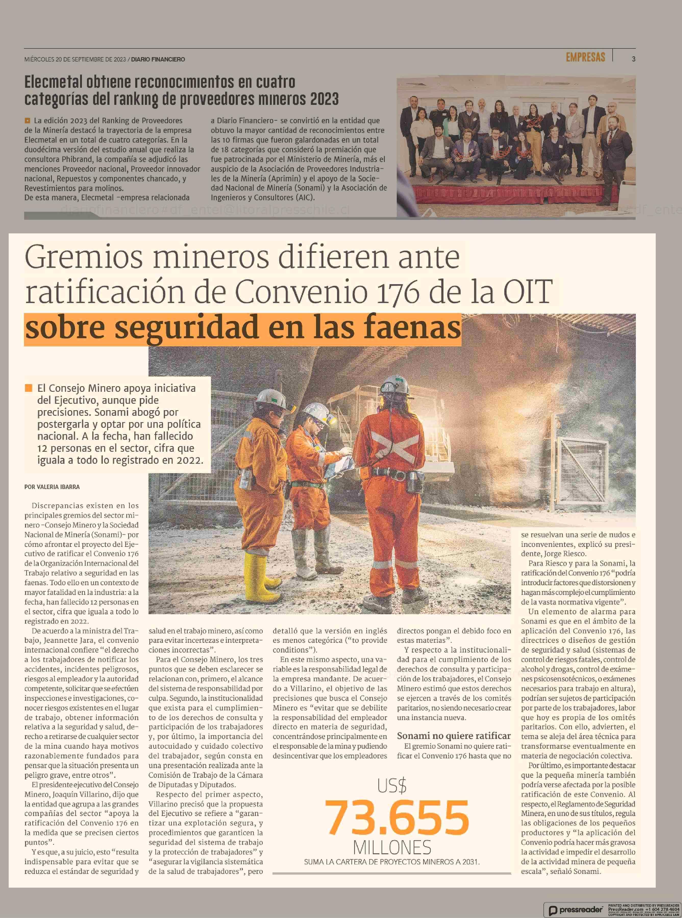 Gremios mineros difieren ante ratificación de Convenio 176 de la OIT sobre seguridad en las faenas 20-09-2023 Diario Financiero |