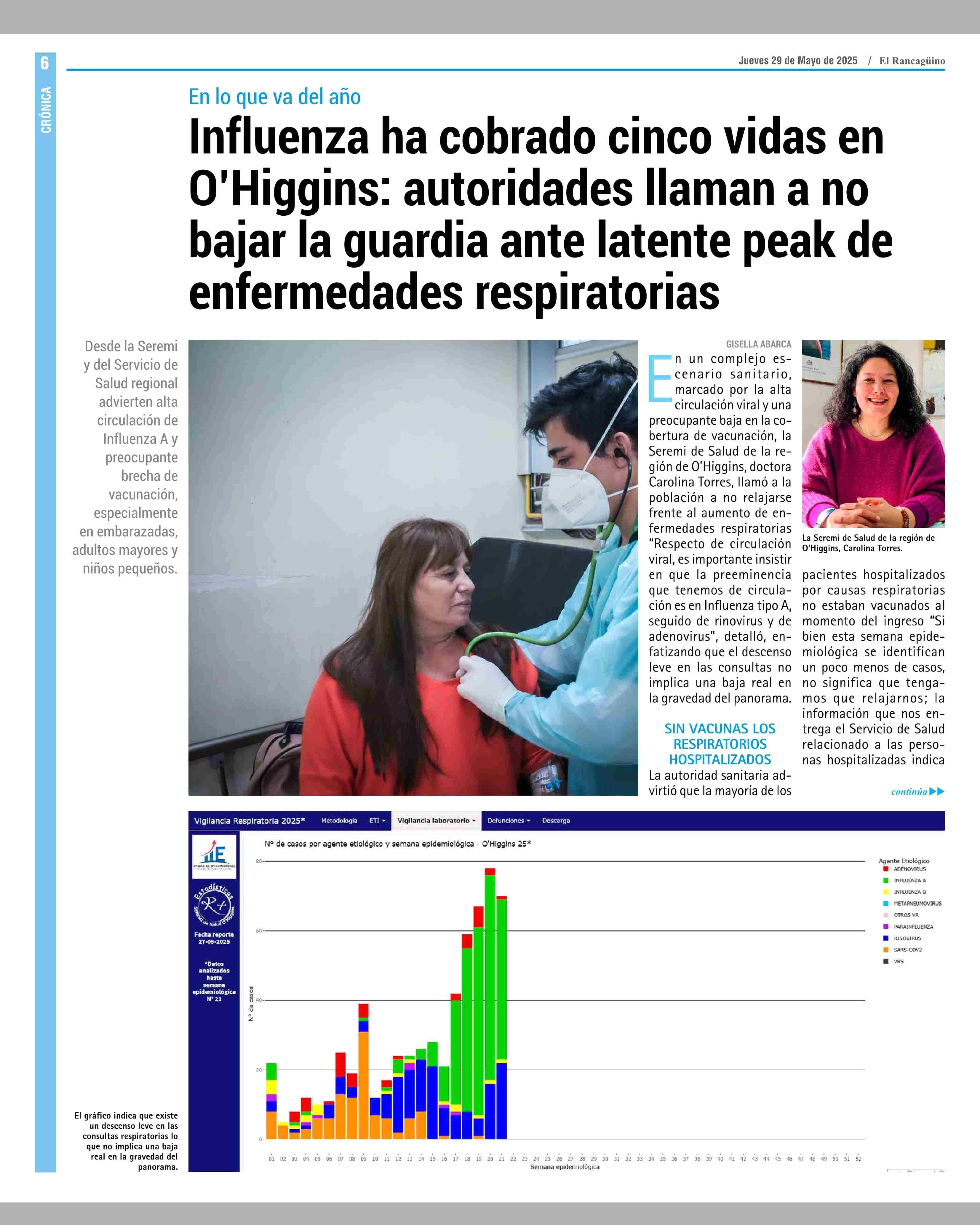 Influenza ha cobrado cinco vidas en 0'Higgins: autoridades llaman a no bajar la guardia ante latente peak de enfermedades respiratorias 29-05-2025 El Rancagüino |