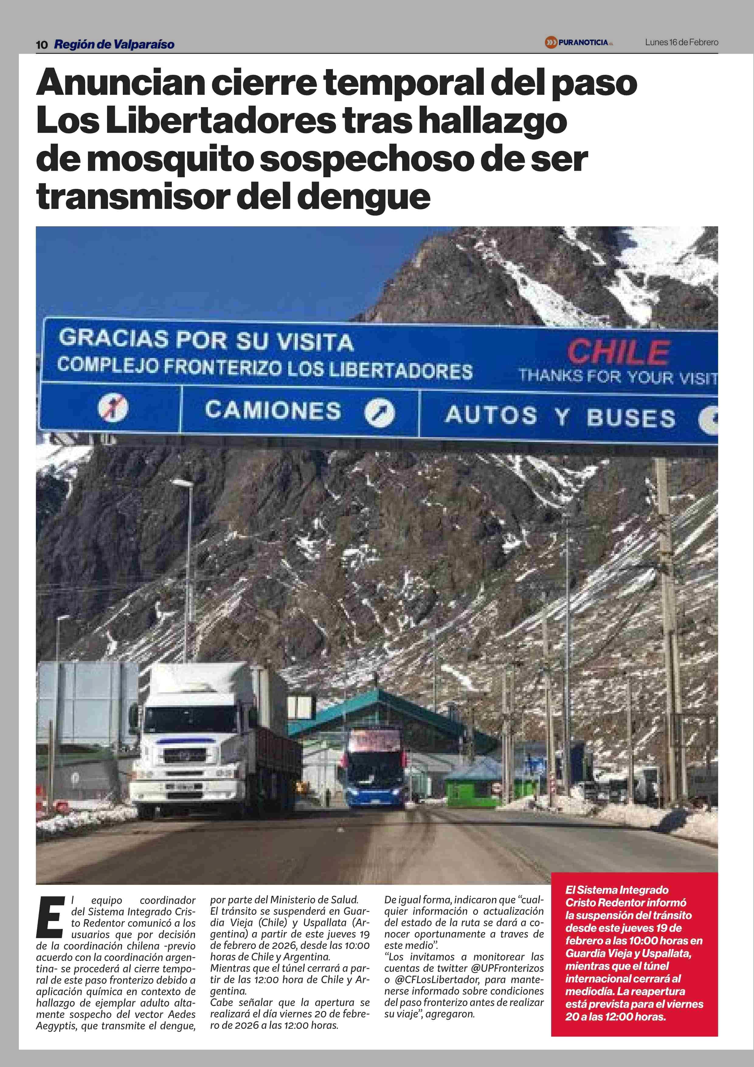 Título: Anuncian cierre temporal del paso Los Libertadores tras hallazgo de mosquito sospechoso de ser transmisor del dengue