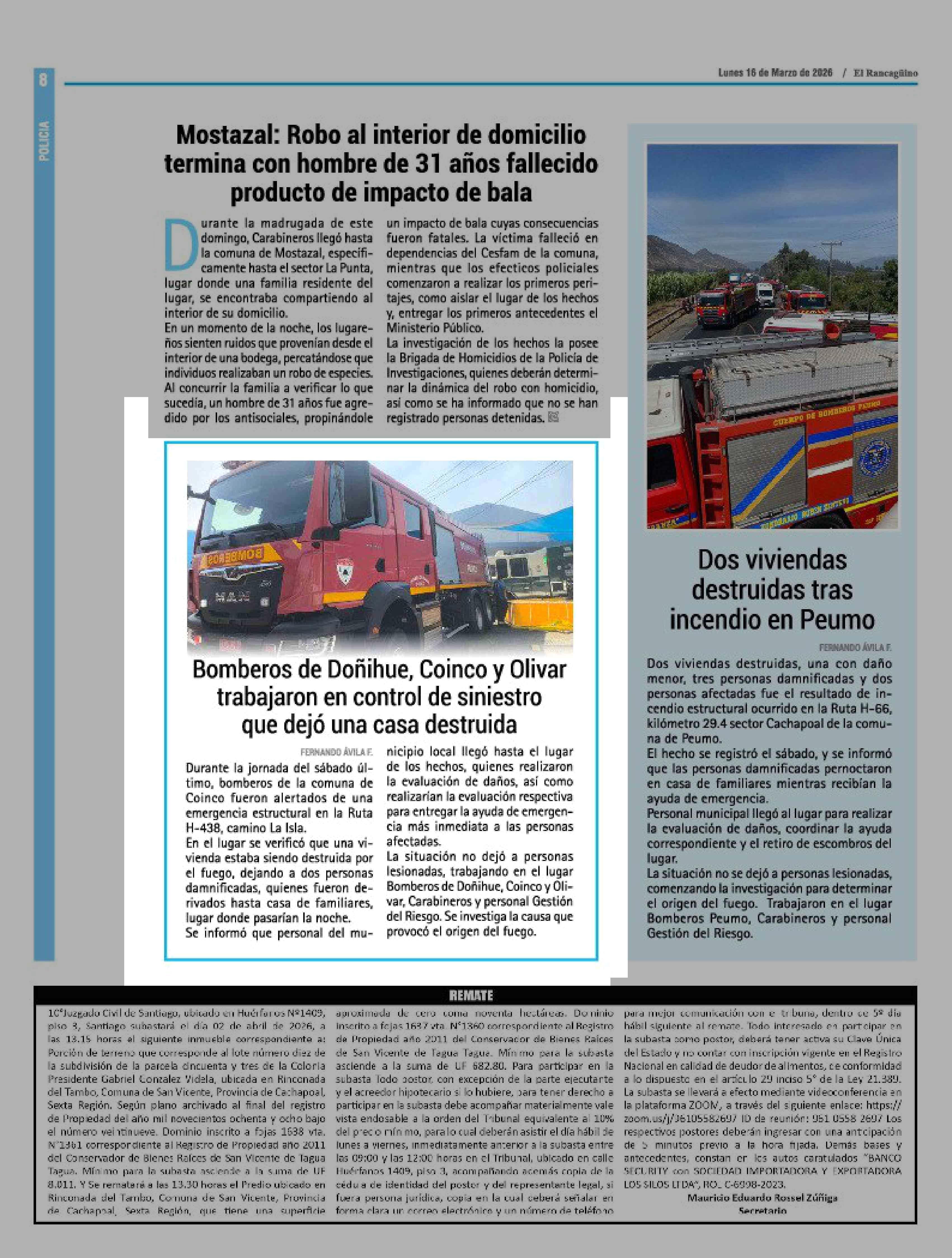 | Título: | Bomberos de Doñihue, Coinco y Olivé trabajaron en control de siniestro que dejó una casa destruida |