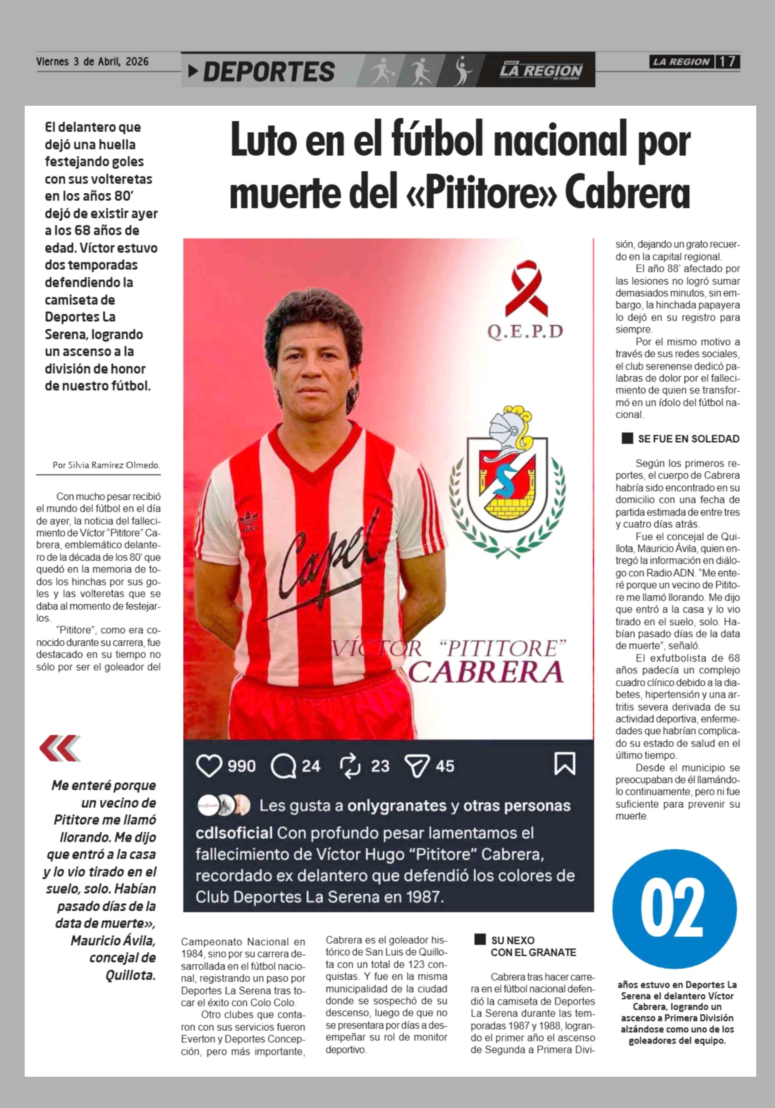 Luto en el fútbol nacional por muerte del «Pititore» Cabrera 03-04-2026 Diario la Región |