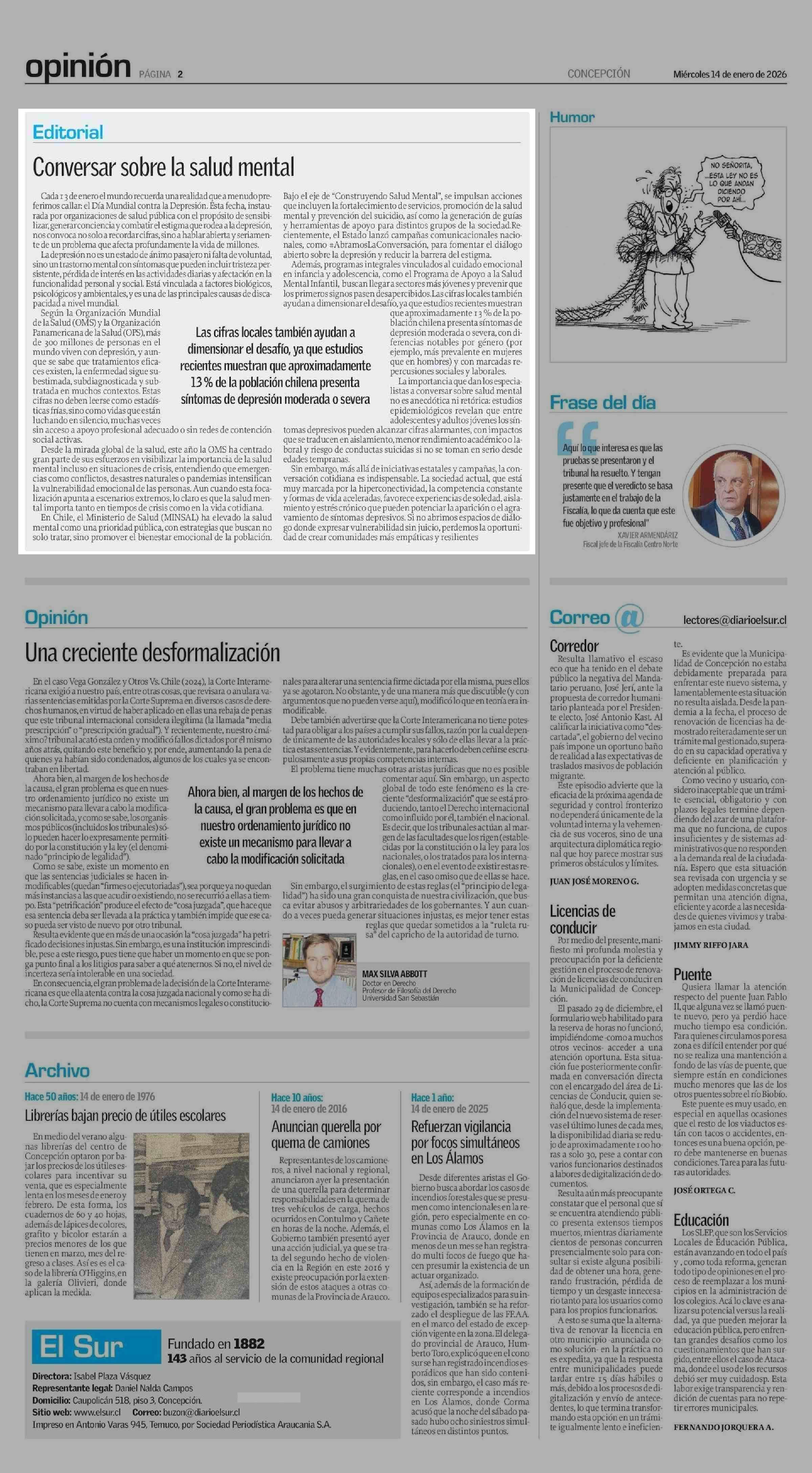 Editorial: Conversar sobre la salud mental 14-01-2026 El Sur |
