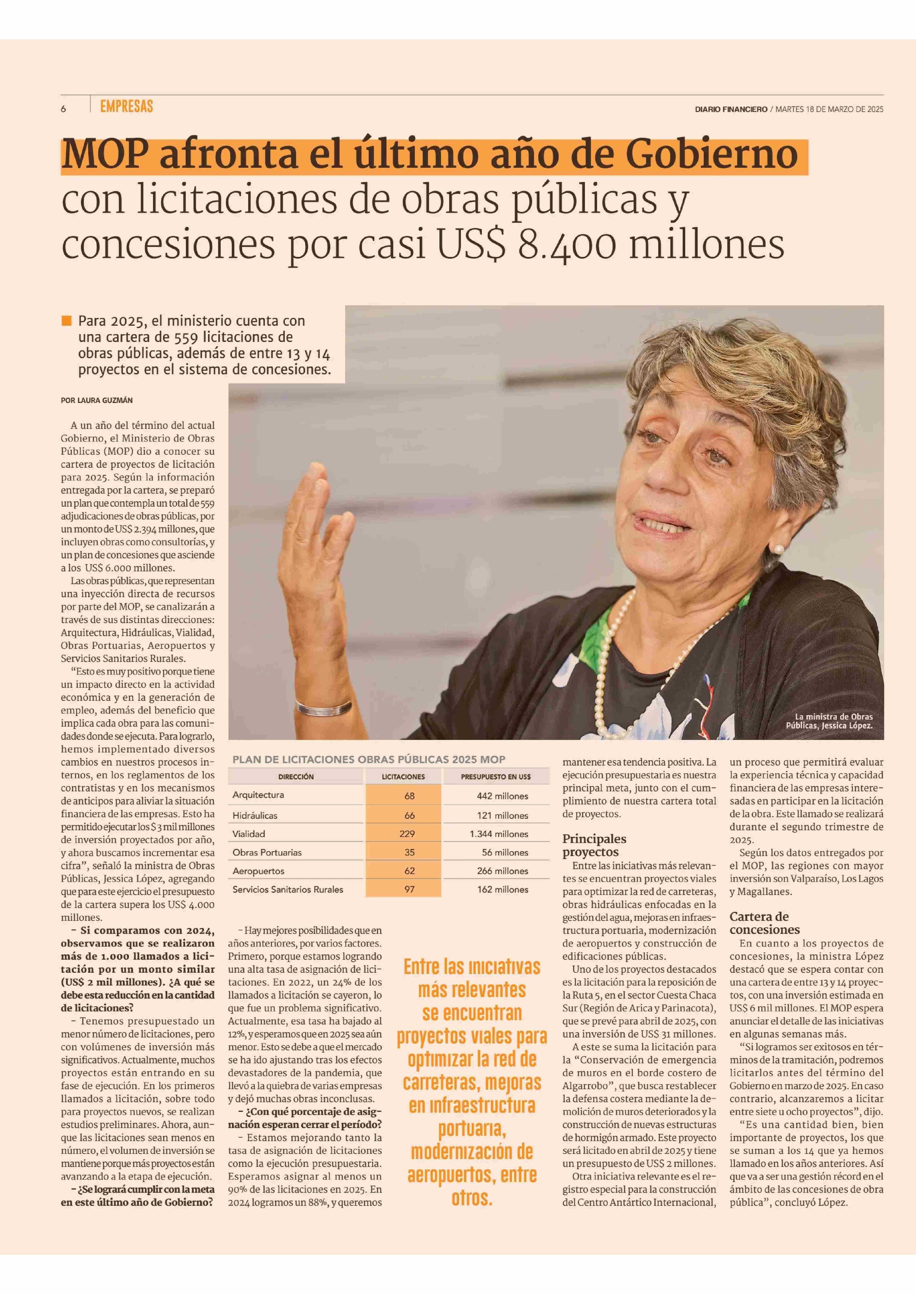 MOP afronta el último año de Gobierno con licitaciones de obras públicas y concesiones por casi US$ 8.400 millones 18-03-2025 Diario Financiero |